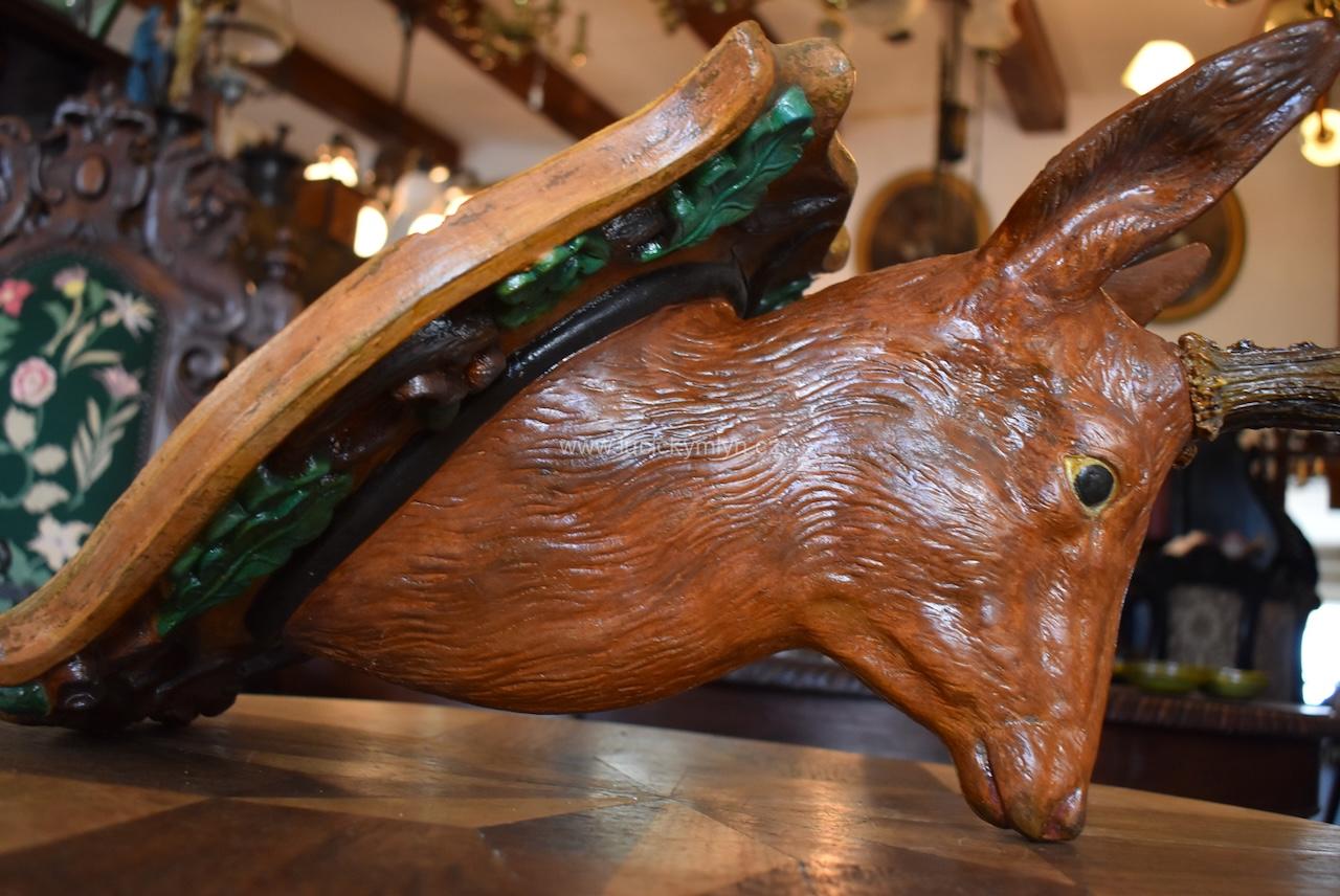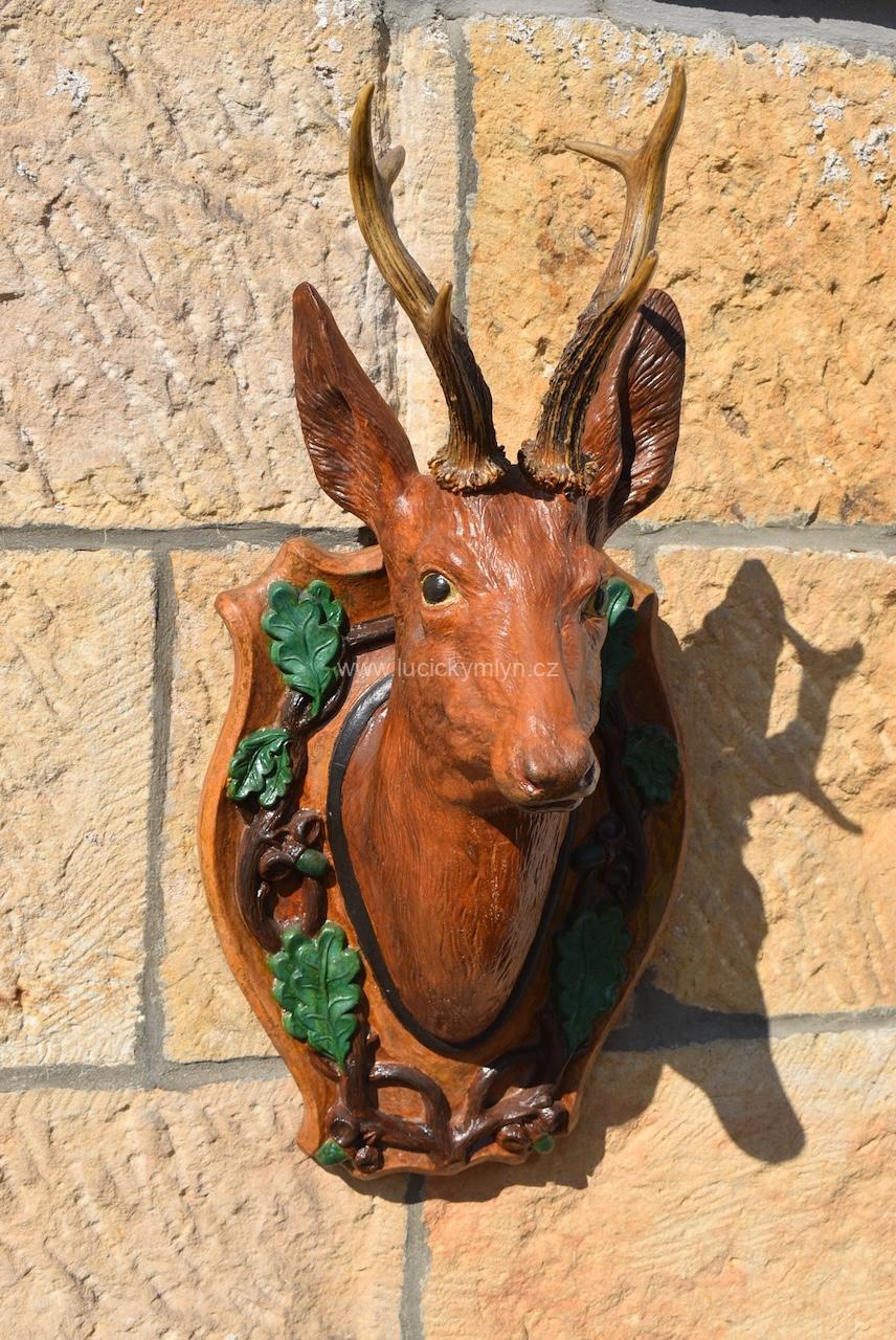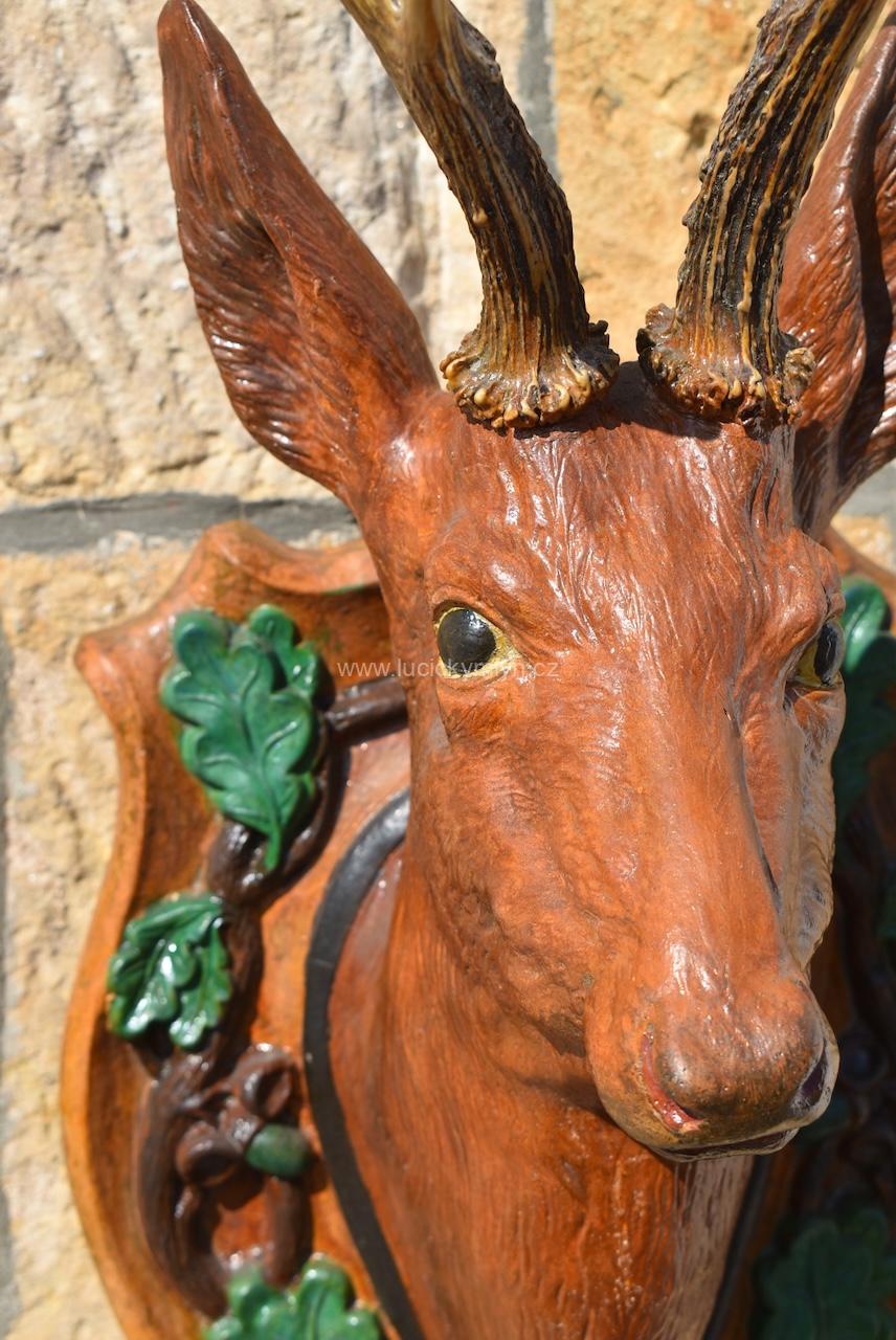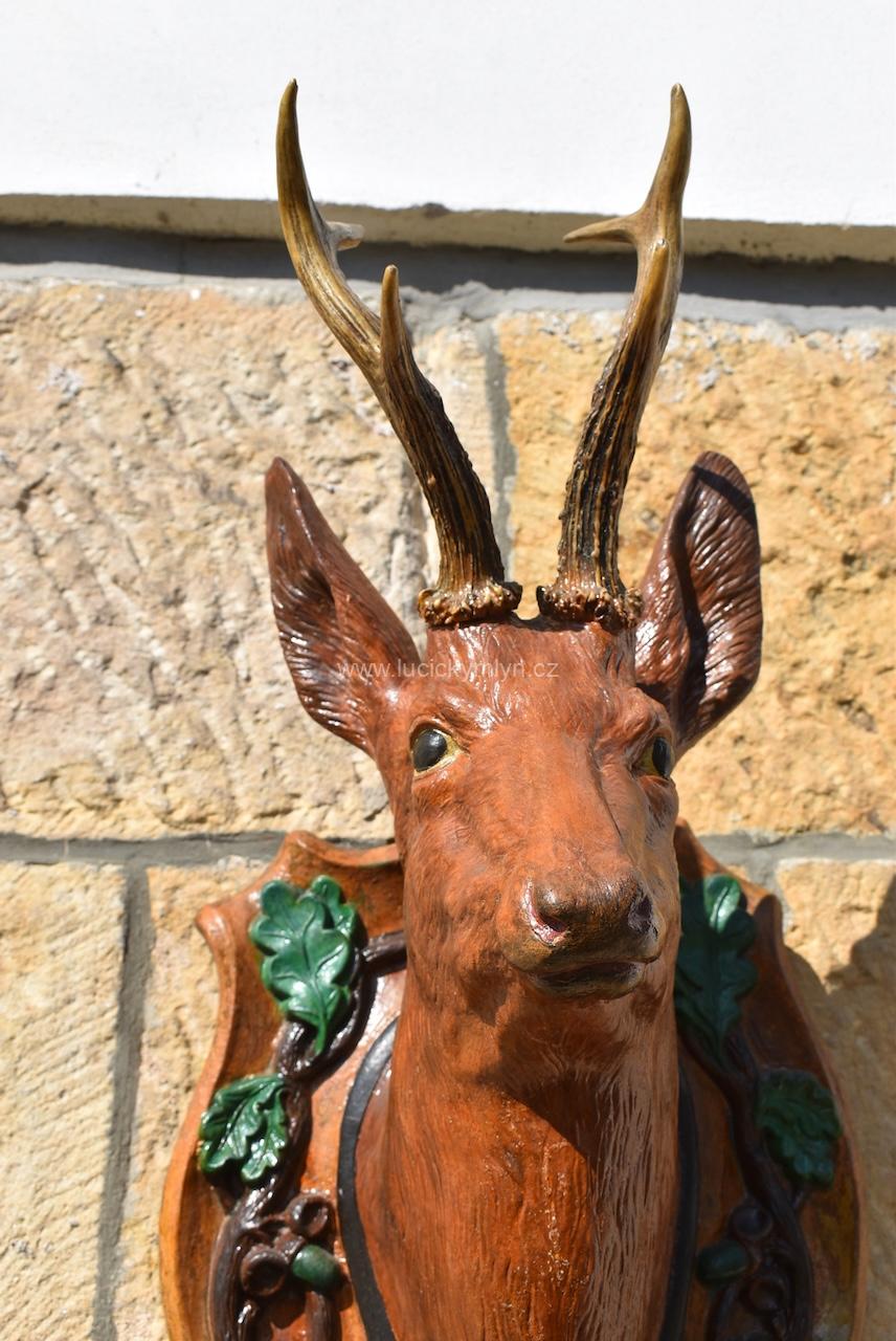 Originální závěsný předmět plasticky provedený i vybarvený v loveckém stylu. Hlava srnce s věrně ztvárněnými parůžky, byla i s prkénkem vyrobena z kolorované a leskle glazované keramiky. Nástěnná starožitná dekorace z 1.třetiny 20. stol. je svým provedením i kvalitou, vhodná nejen pro použití v interiéru, ale i exteriéru. Velmi dobrý původní stav, bez poškození.