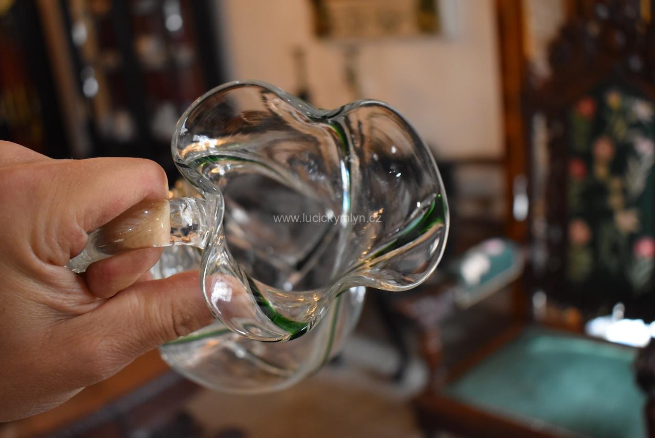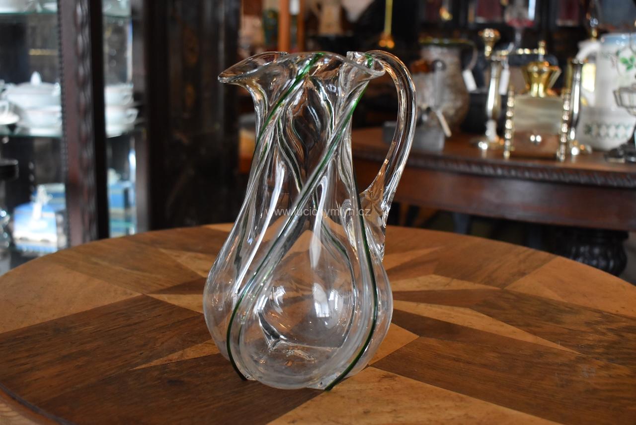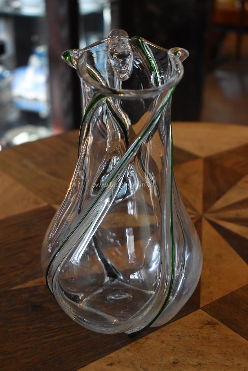 Okouzlující starožitný džbánek spirálovitě oživený plastickou profilací s vystouplým tmavozeleným vláknem – foukané sklo