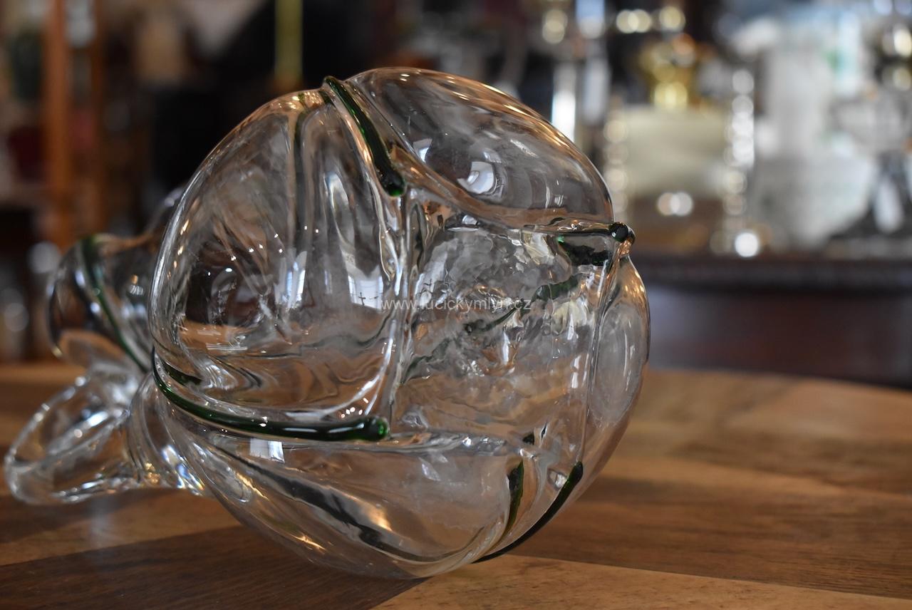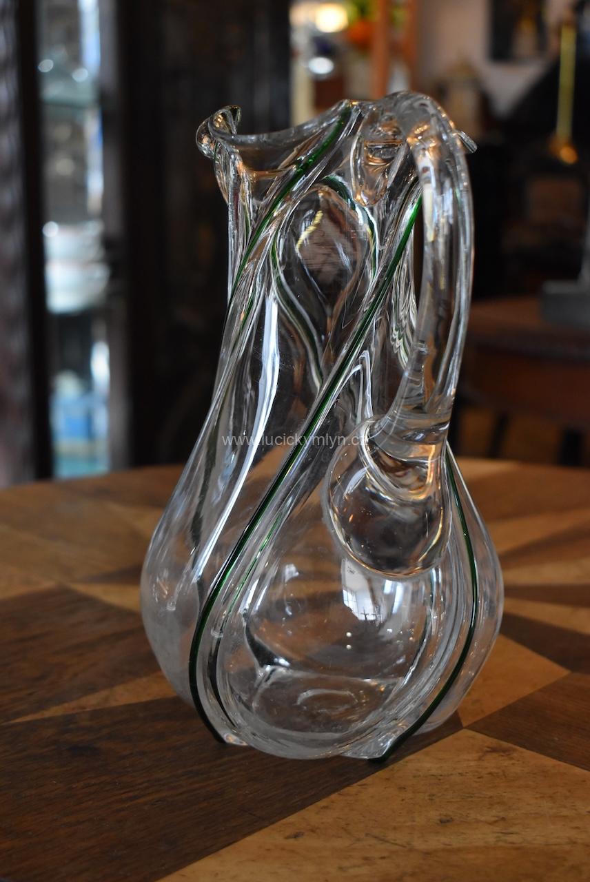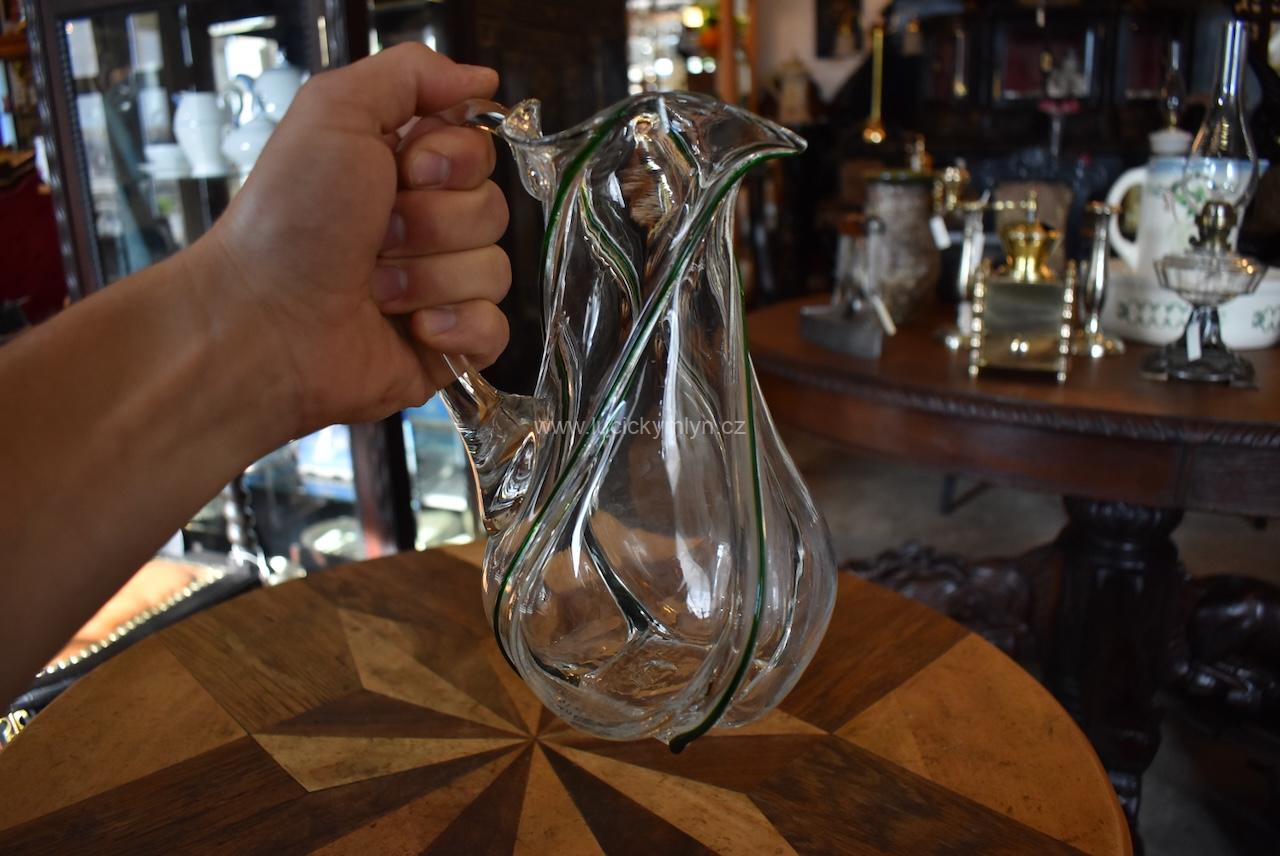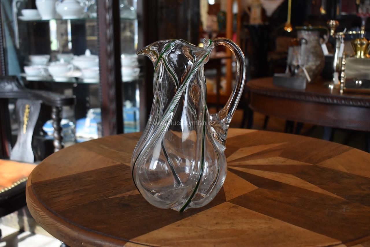 Okouzlující starožitný džbánek spirálovitě oživený plastickou profilací s vystouplým tmavozeleným vláknem – foukané sklo