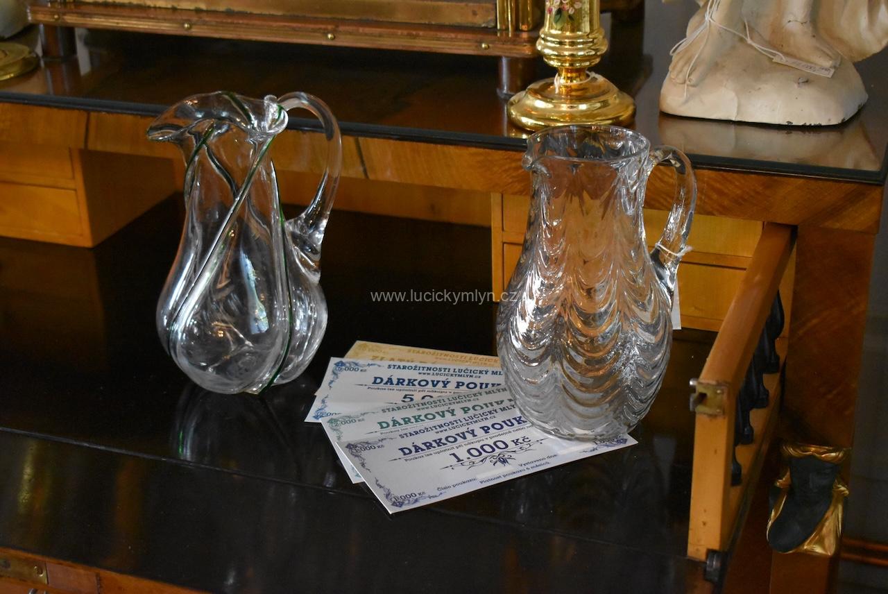 Časem prověřená, mistrně ztvárněná nádoba z čirého skla, pocházející ze 3. třetiny 19. stol. Džbán má dole téměř čtvercovou, mírně zúženou, ale stabilní základnu. Dno této nádoby je v místě podstavy zesílené a směrem dovnitř lehce prohnuté. Na jeho středu můžete vidět zachovalý tzv. přílepník. To je místo, kde byla „přilepena“ a na závěr i odklepnuta, sklářská píšťala. Pohodlně tvarované ouško je lehounce převýšené, dostatečně široké a vysoké i pro ruku pořádného chlapa. Horní okraj starožitného džbánu má širší, šikovně tvarovanou hubičku, která umožňuje snadné nalévání vína nebo vody, bez zbytečného odkapávání. Kvalitní a krásné sklářské dílko se zachovalo ve velmi dobrém stavu, bez poškození a téměř i povrchového opotřebení. Hezký a kvalitní dárek, který poslouží k příjemnému osvěžení s přáteli a k tomu vkusně ozdobí Vaši vitrínku, nebo skleník.