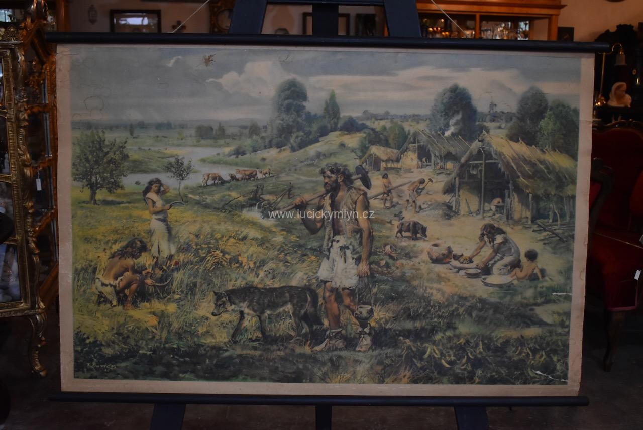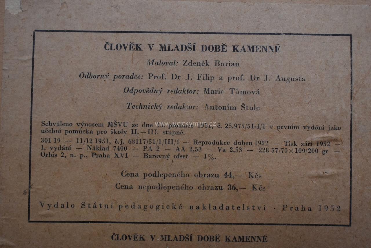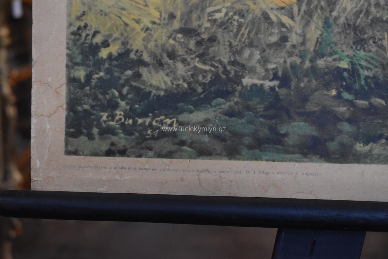 Tištěný školní plakát z roku 1952 – Zdeněk Burian – Člověk v mladší době kamenné