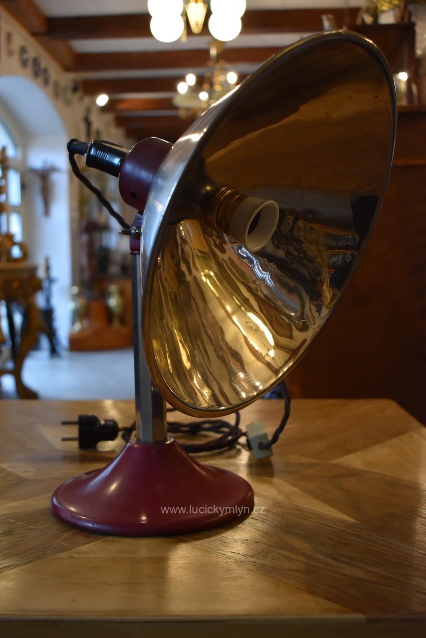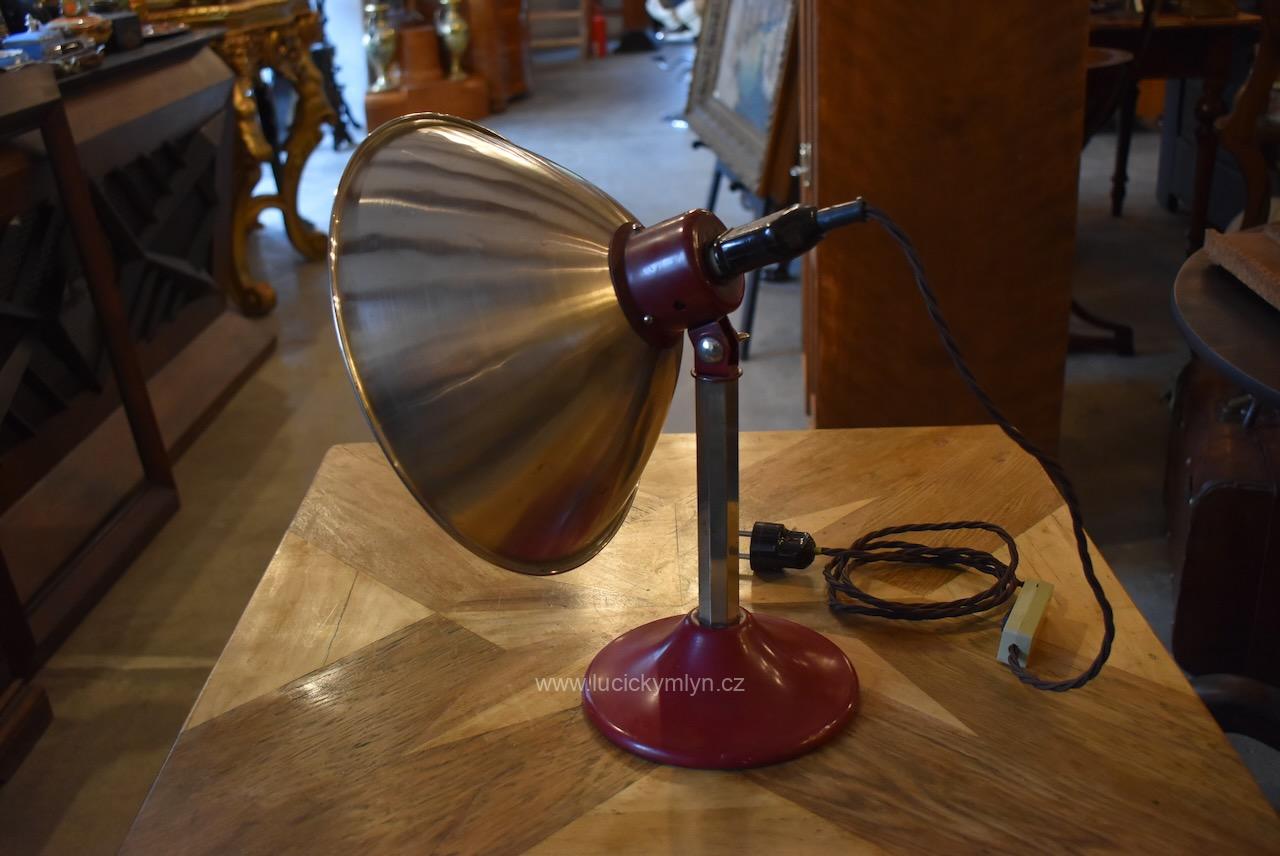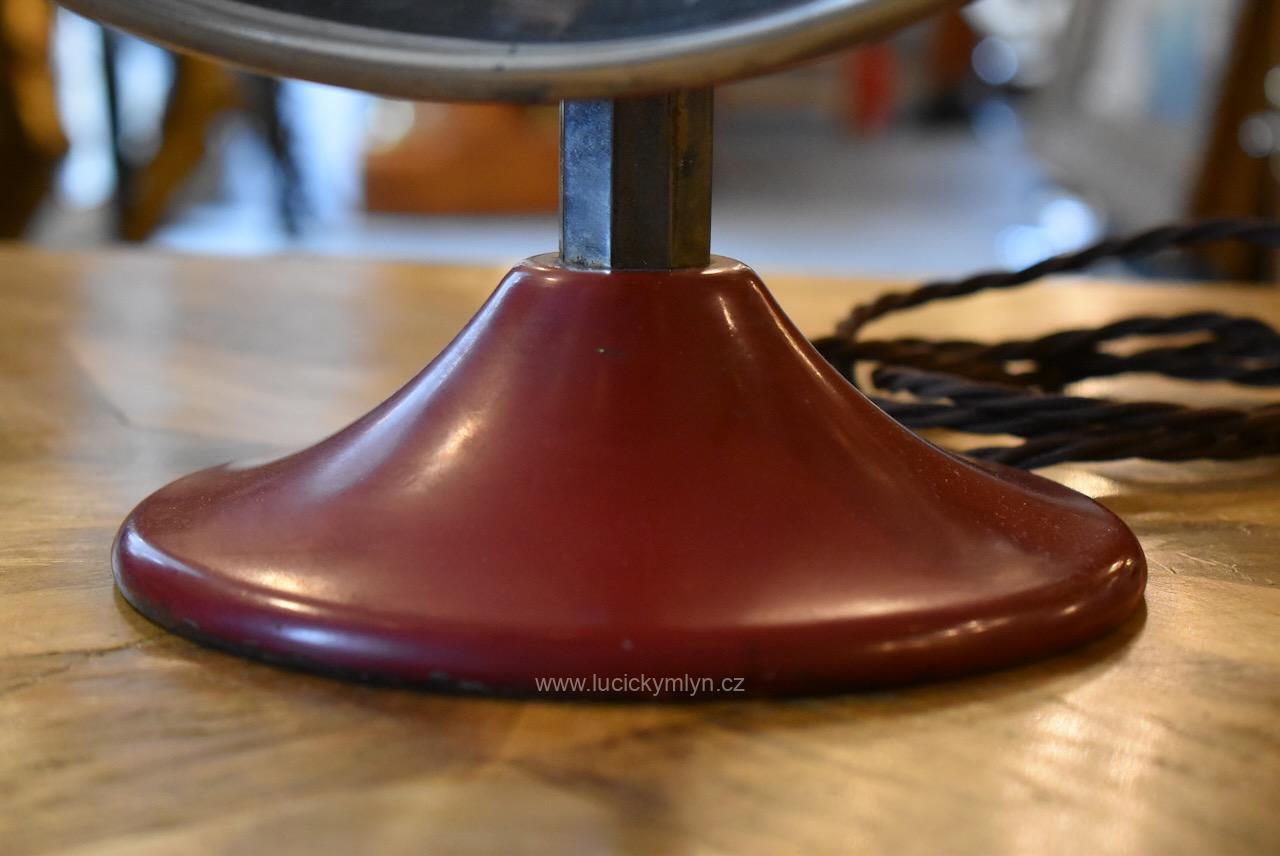 Vkusná praktická i robustní stolní prvorepubliková industriální lampa s široce rozevřeným kulatým stínidlem z tlačeného a leštěného hliníku