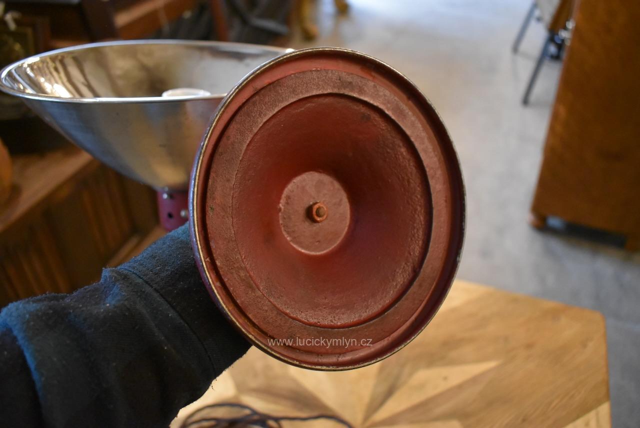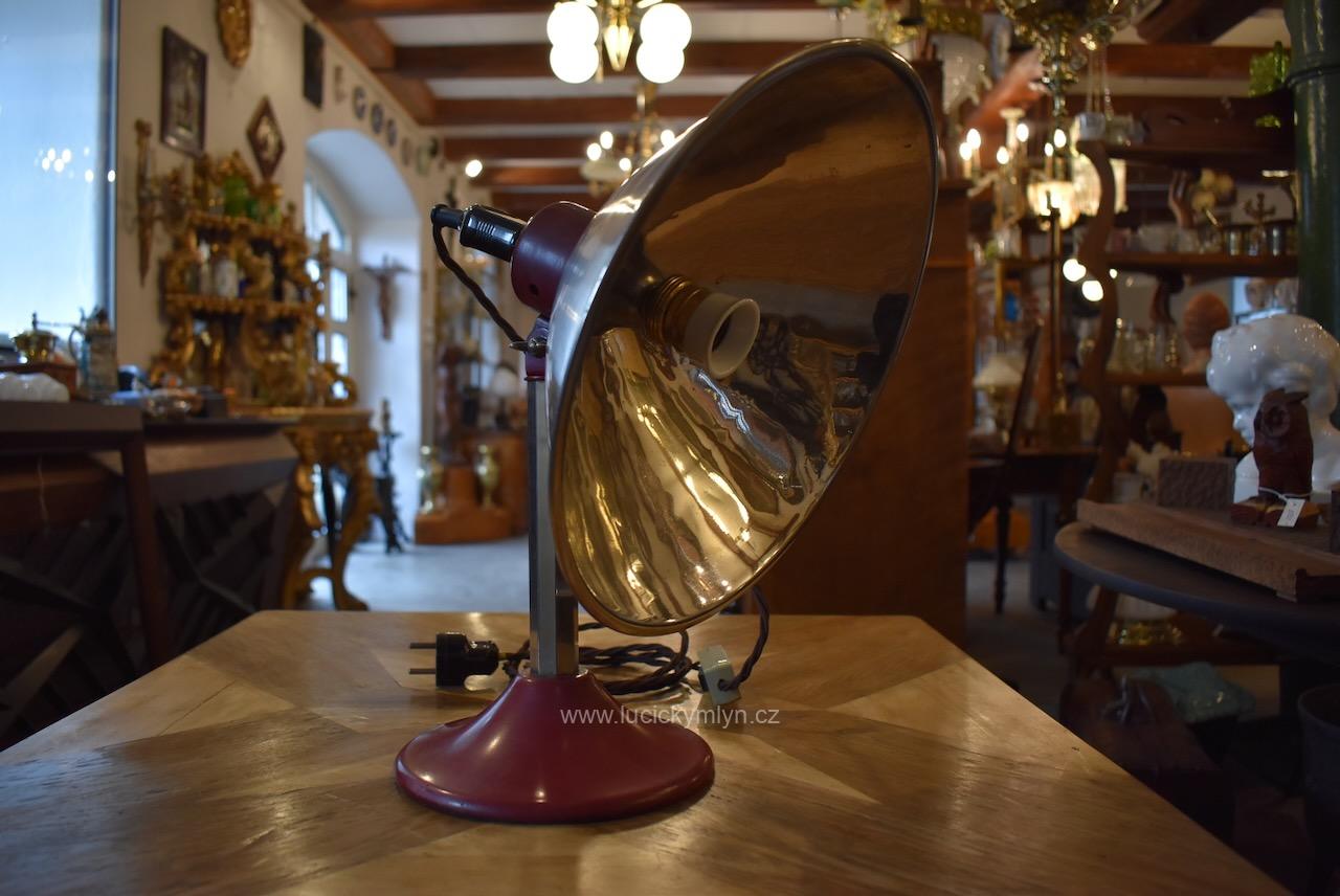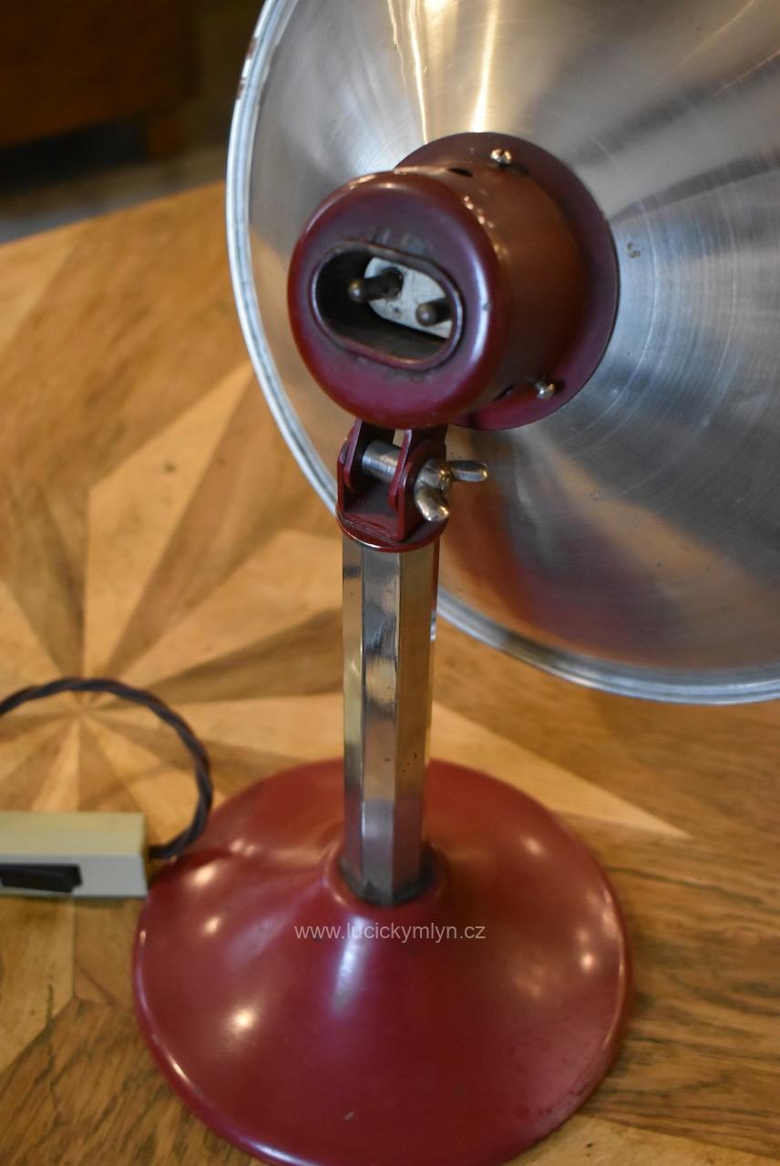 Vkusná praktická i robustní stolní prvorepubliková industriální lampa s široce rozevřeným kulatým stínidlem z tlačeného a leštěného hliníku