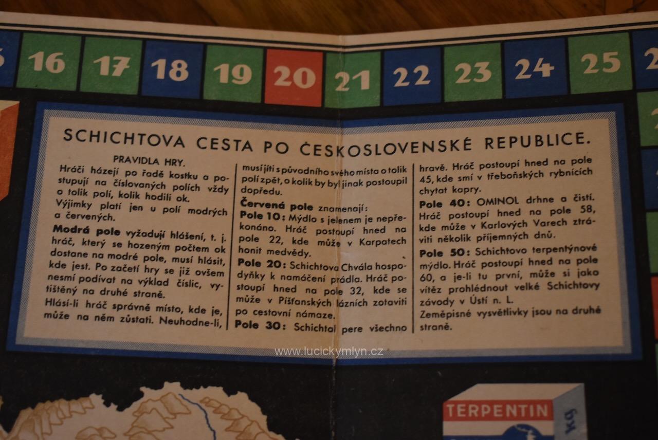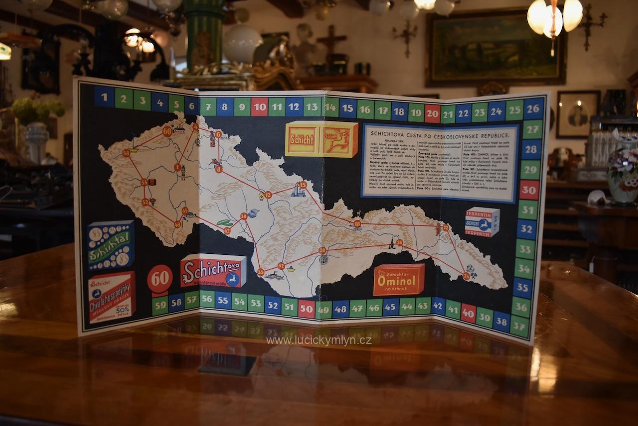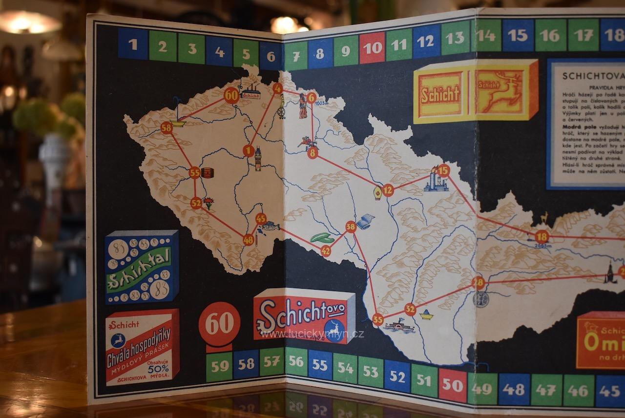 Originální starožitný předmět, chytře navržený jako společenská hra, byl vyrobený za l. republiky pro reklamní účely. Kartonová skládací hra SCHICHTOVA CESTA PO ČESKOSLOVENSKÉ REPUBLICE, byla chytrým reklamním předmětem úspěšného výrobce a distributora mýdel zn. SCHICHT. Sběratelsky i muzejně velmi zajímavý předmět ze slabého kartonu se zachoval bez poškození a ve velmi dobrém stavu.