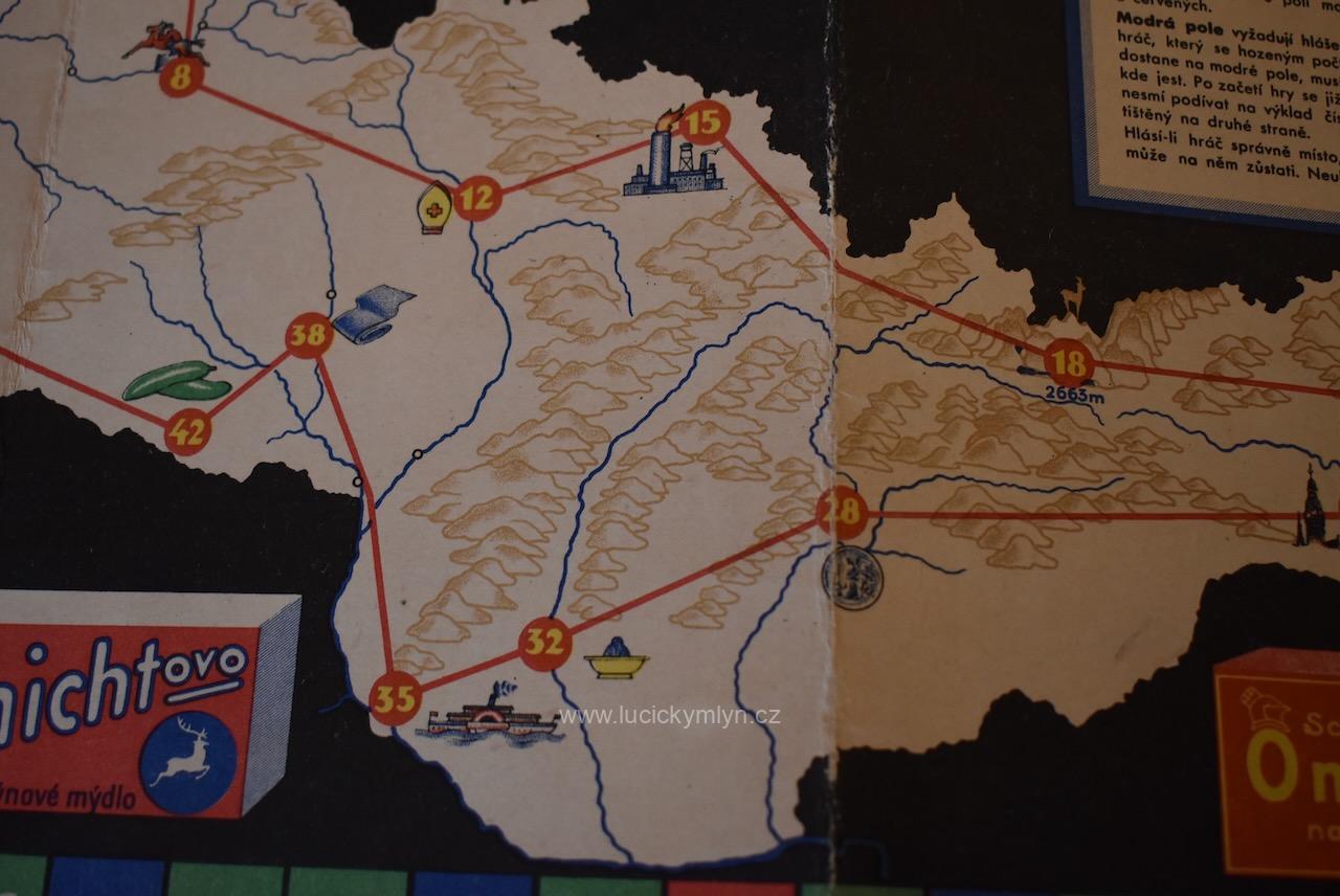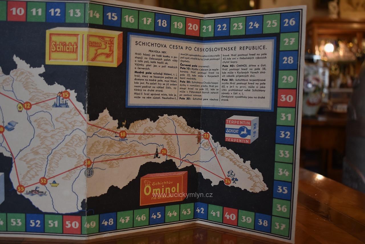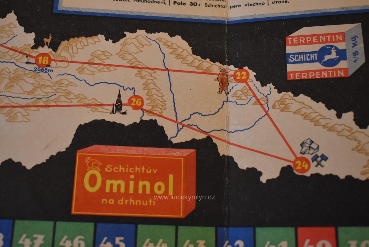 Sběratelská zajímavost a reklamní předmět z tištěného a kolorovaného kartonu – Unikátní hra – Schichtova cesta po Československé republice
