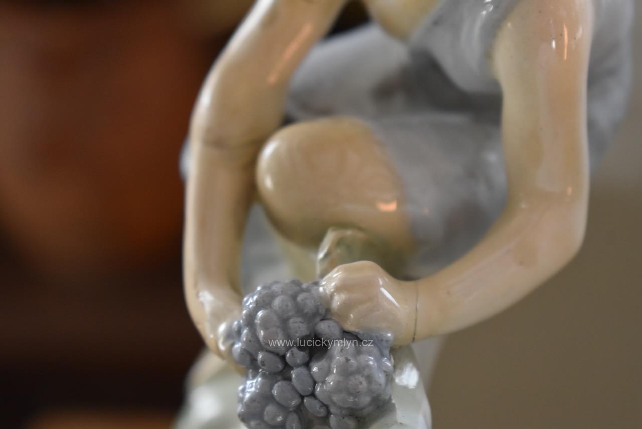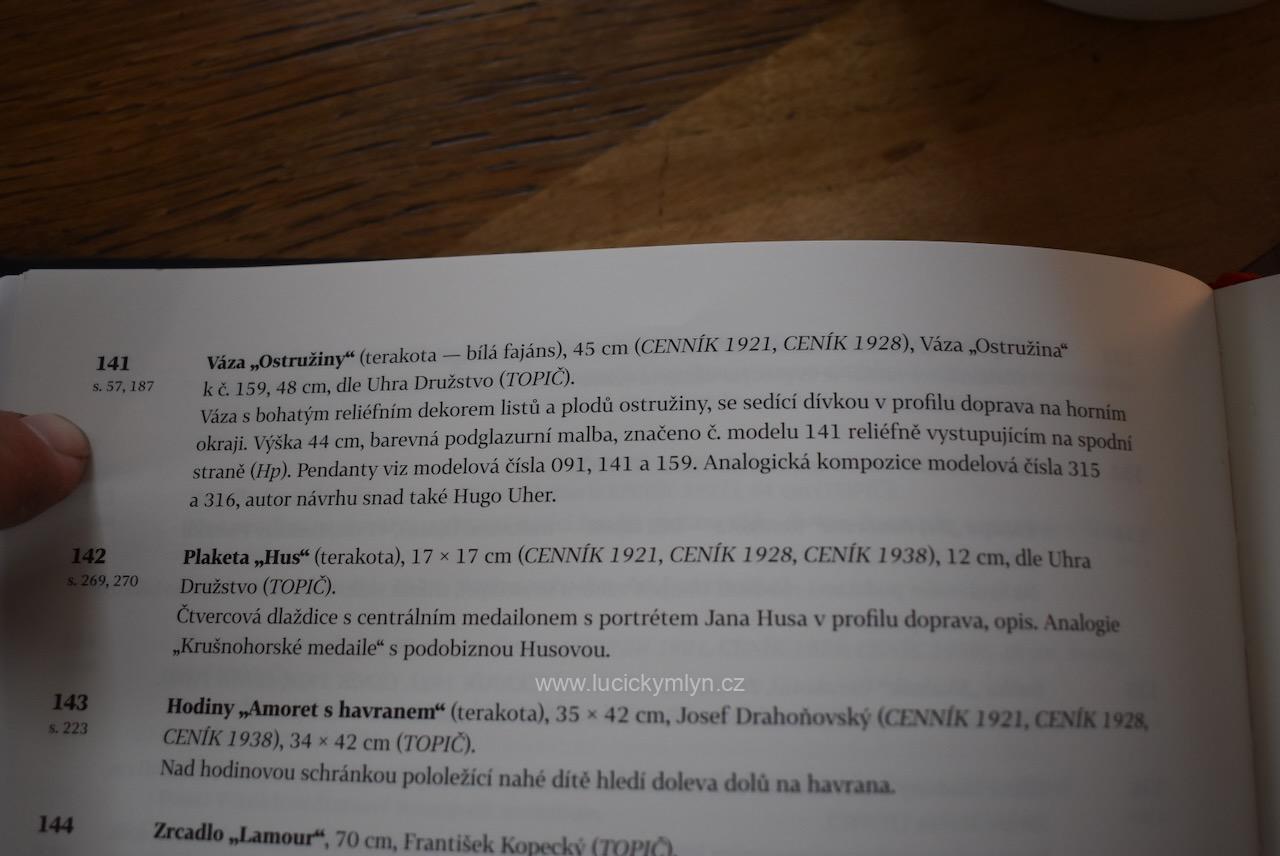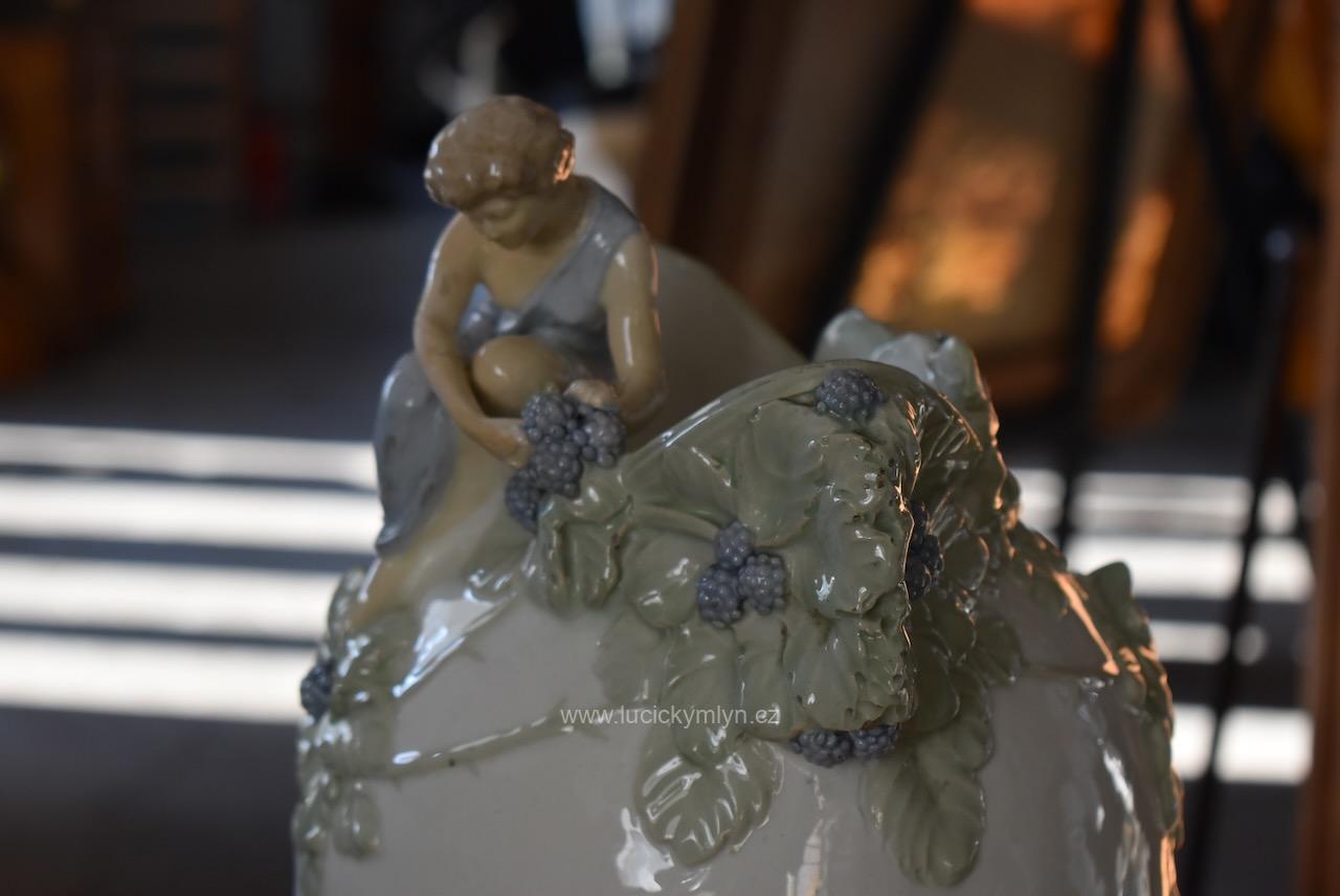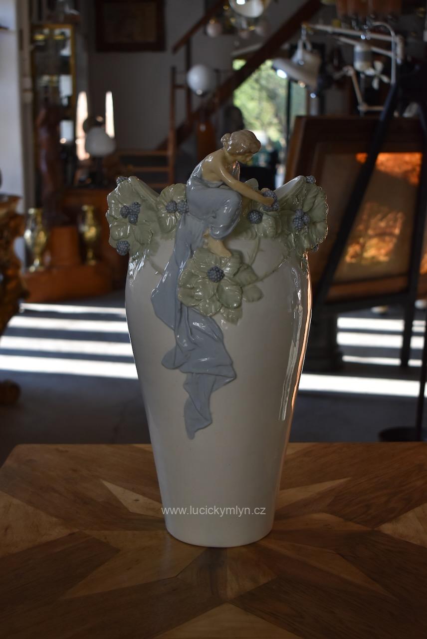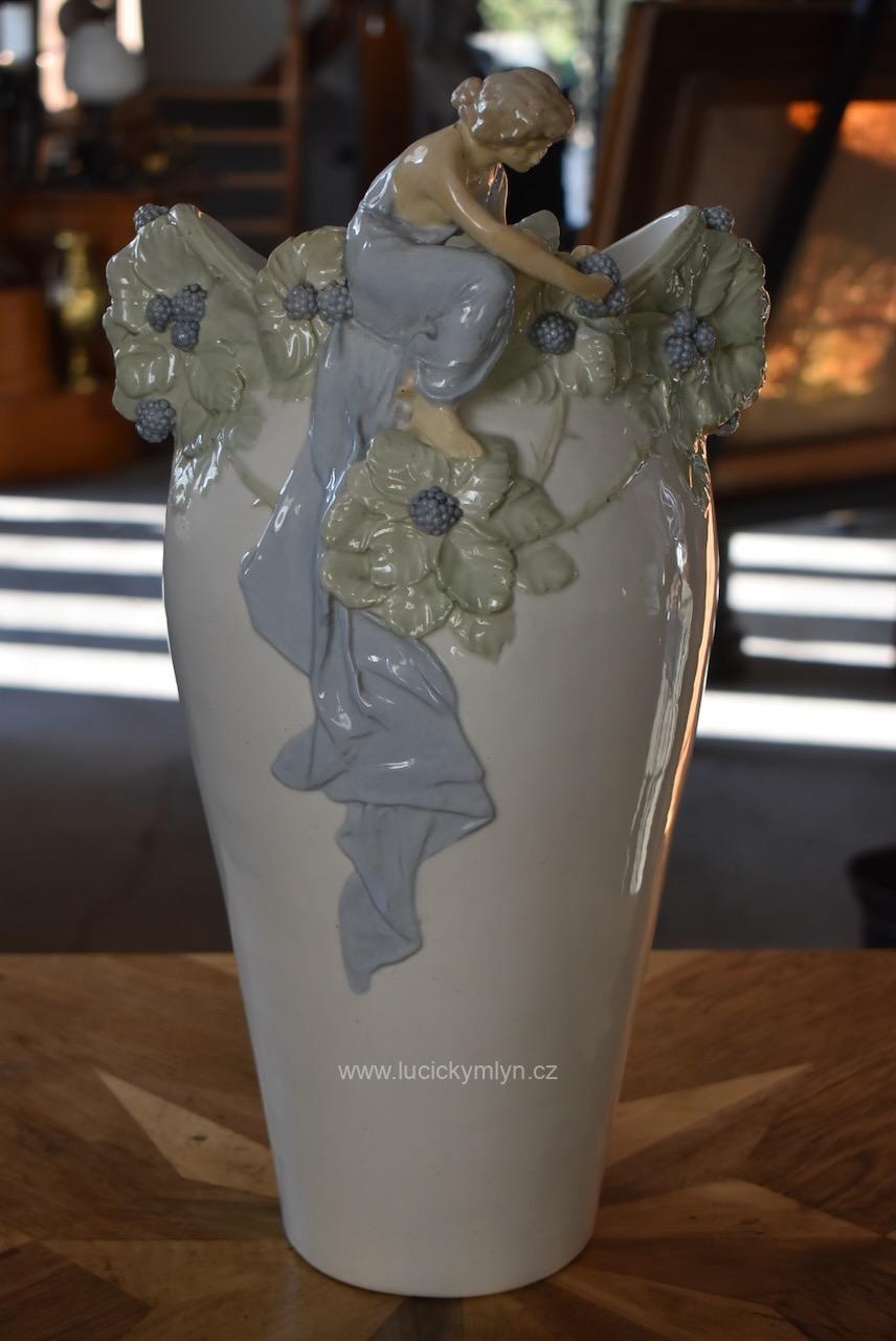 Reprezentativní vysoká váza „Ostružiny“ z bílého fajánse má hladké, do výše se pozvolna rozšiřující tělo, jehož vrchní otvor se působivě zužuje do tvaru loďky. Toto hrdlo je v horní části mistrně obohaceno  plastickým figurálním reliéfem dívčiny i ztvárněním listů a plodů ostružin. Do romanticky ztvárněné „rostlinné vlny“ je působivě zakomponována drobná figurka sedící dívky, jež se natahuje po modrých ostružinách. Tento typický motiv jemně lyrické secese, výrazně obohacuje hluboce svěšená modrá drapérie, jež účelově zpodobňuje sesutý plášť či vlečku. Model je doložen v odborné literatuře jako č. 141 s označením „Váza Ostružiny“, autorský návrh je připisován sochaři Hugovi Uherovi. Naše váza byla vyrobena v keramické továrně VDK Bechyně před rokem 1910 a na spodní straně nese vtlačenou značku i modelové číslo 141. Leskle glazovaný povrch je opatřen barevnou podglazurní malbou v tlumených tónech zelené, šedomodré, tělové a světle hnědé. Na postavičce dívky vidíme kdysi lepenou hlavičku a restaurátorské zásahy na částech pravé ruky. Výška přibližně 46 cm, průměr dna 13 cm, hmotnost kolem 3,3 kg z ní činí výraznou, sběratelsky vyhledávanou secesní plastiku vhodnou jako solitér do reprezentativního historického interiéru nebo do specializované sbírky české umělecké keramiky počátku 20. století.