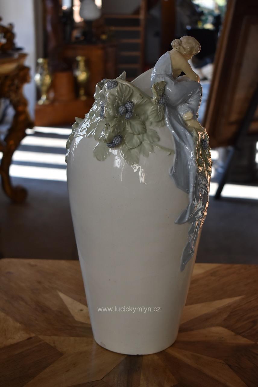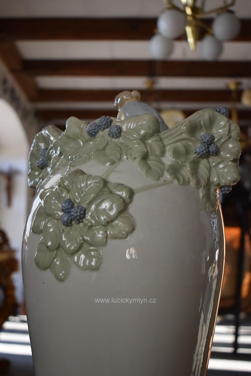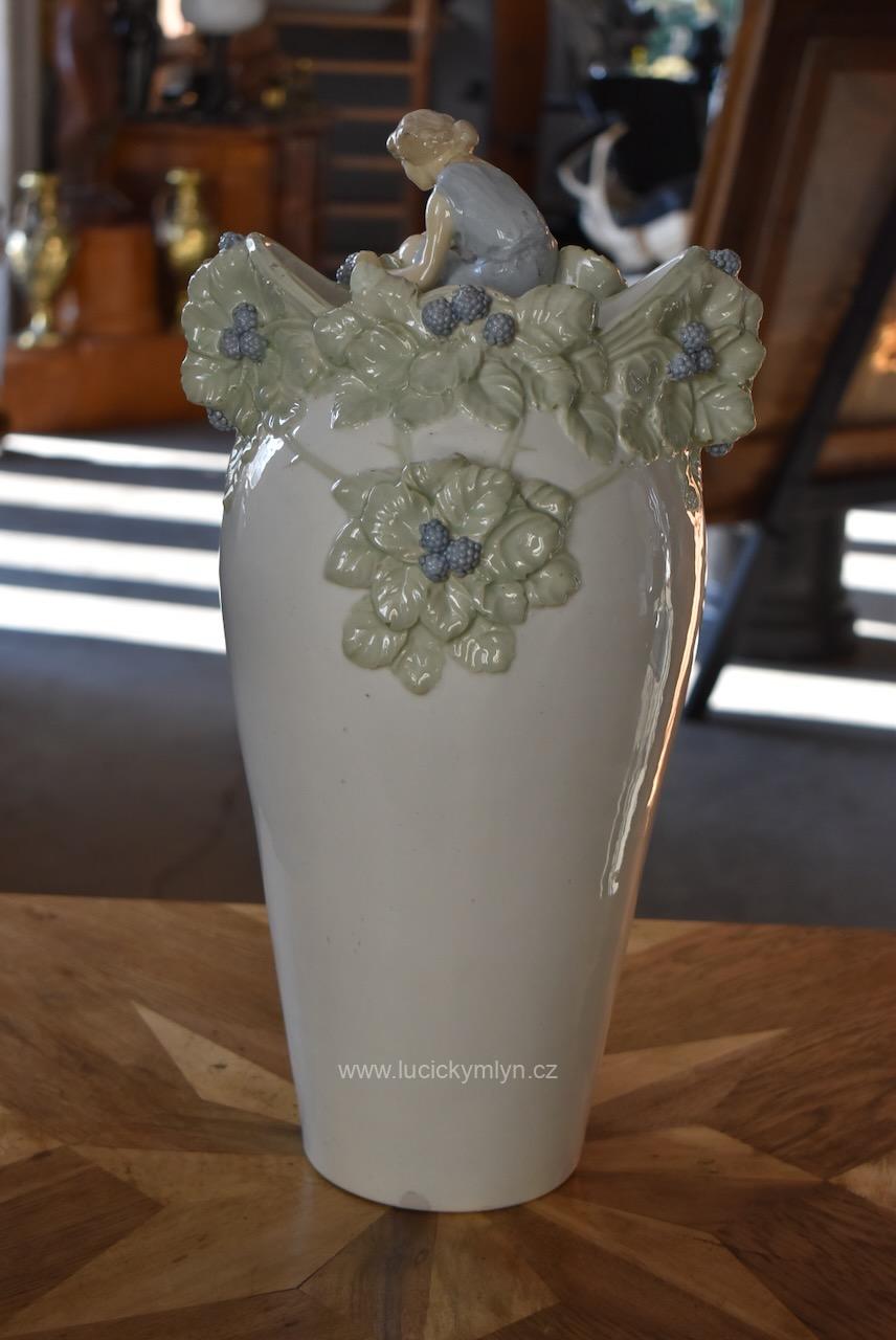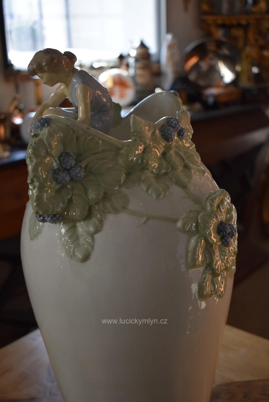 Okouzlující starožitná secesní váza zvaná „Ostružina“ z bíle glazované a ručně kolorované keramiky – model č. 141, návrh připsaný Hugovi Uherovi (kolem 1905)