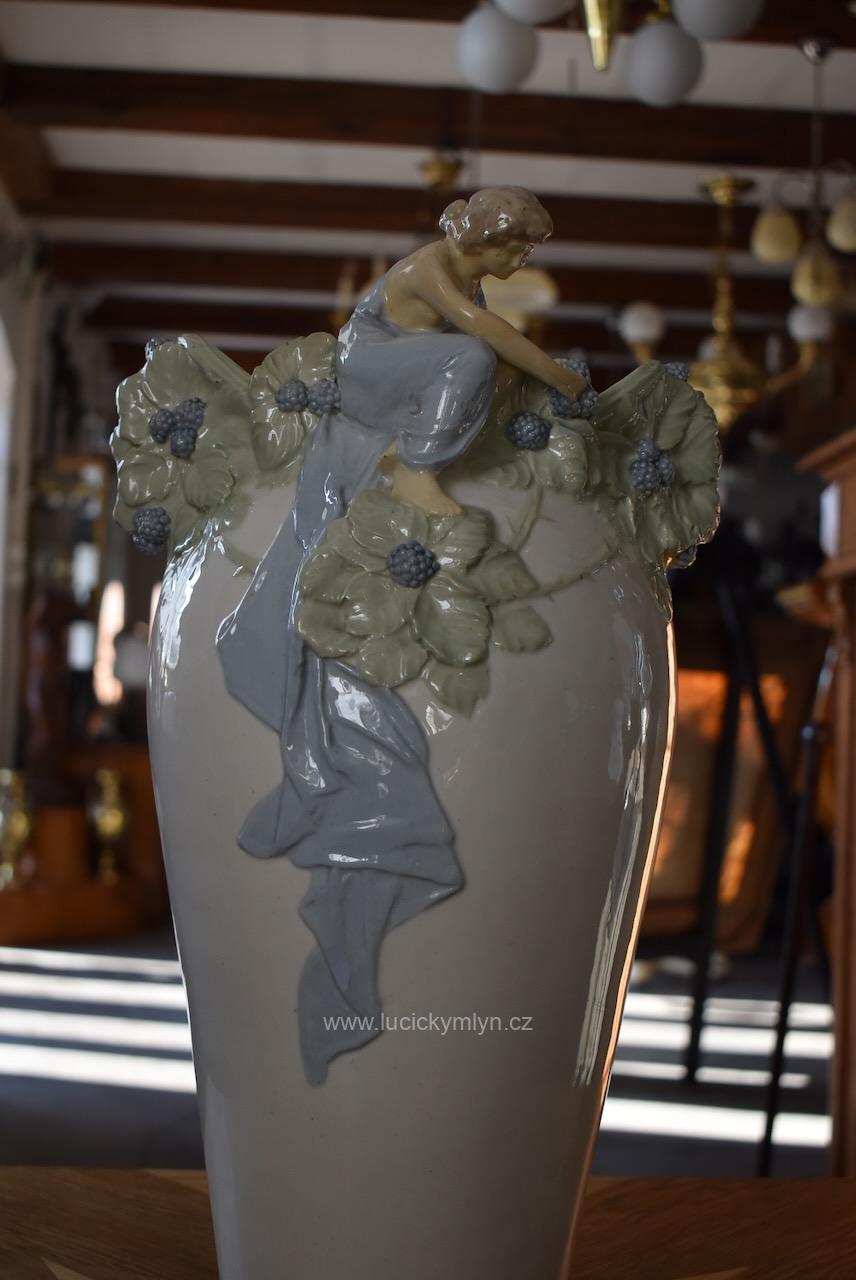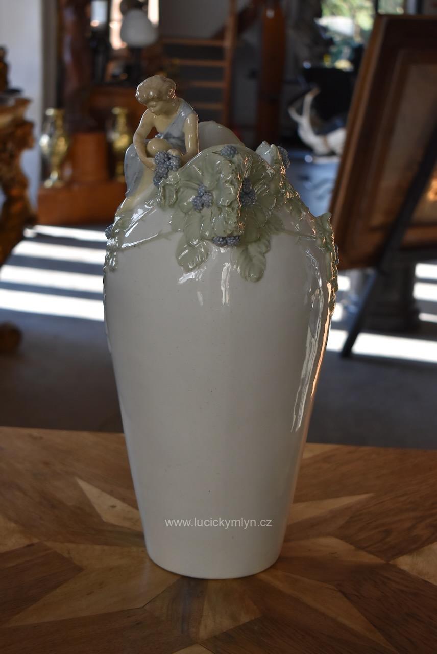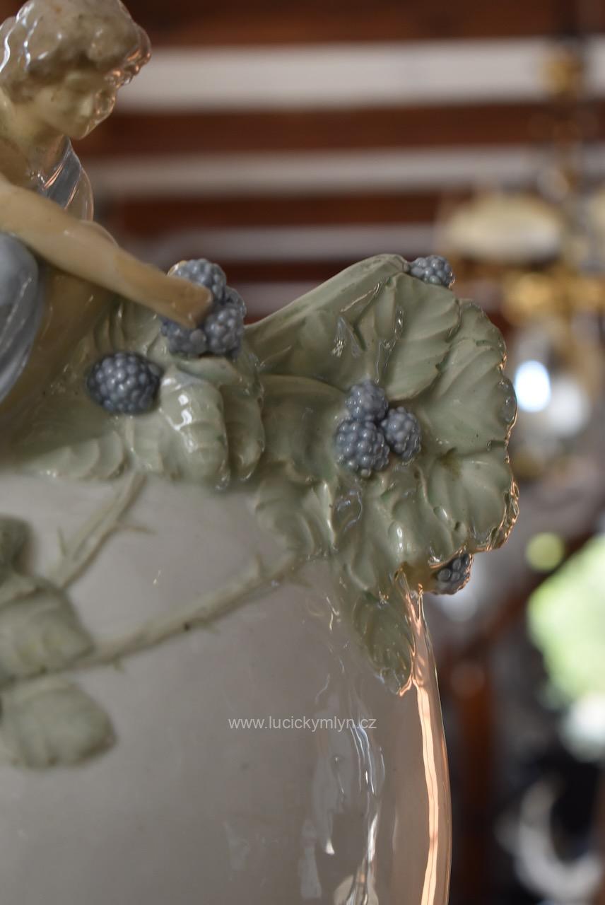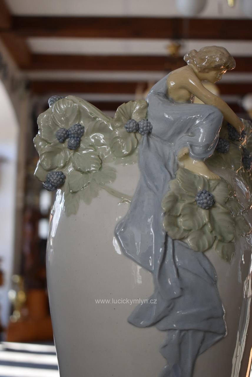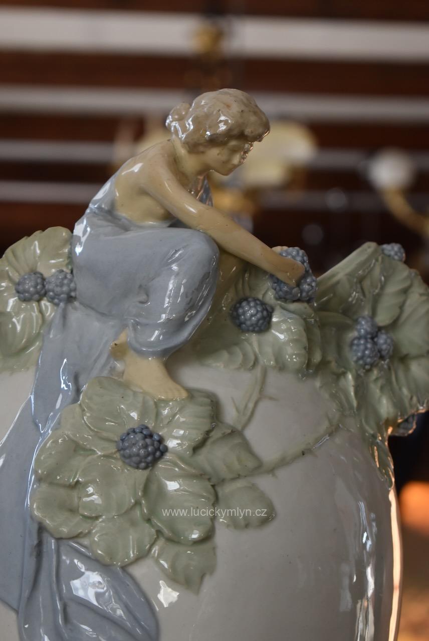 Okouzlující starožitná secesní váza zvaná „Ostružina“ z bíle glazované a ručně kolorované keramiky – model č. 141, návrh připsaný Hugovi Uherovi (kolem 1905)