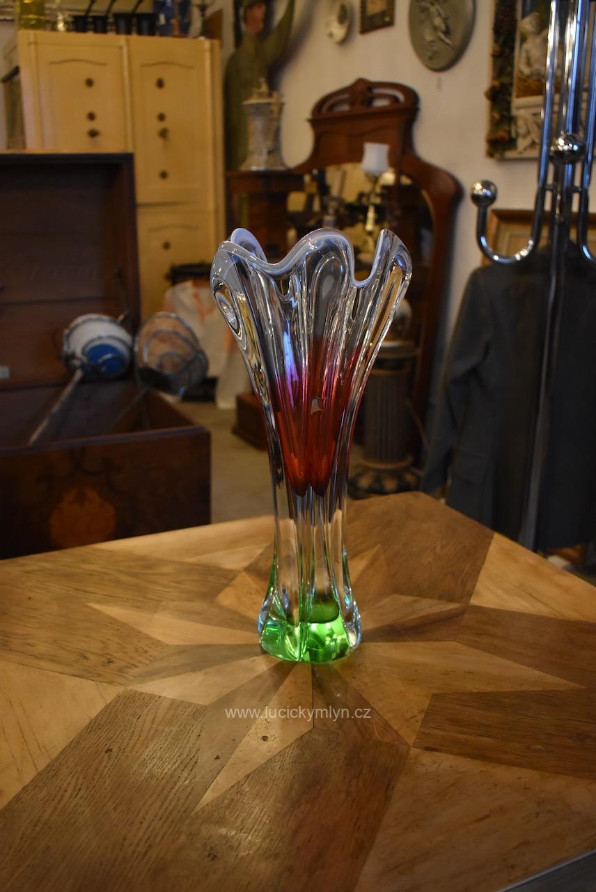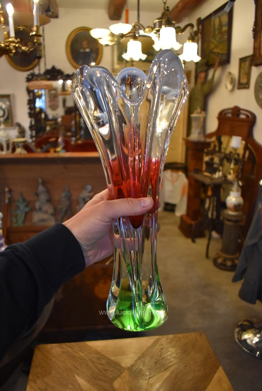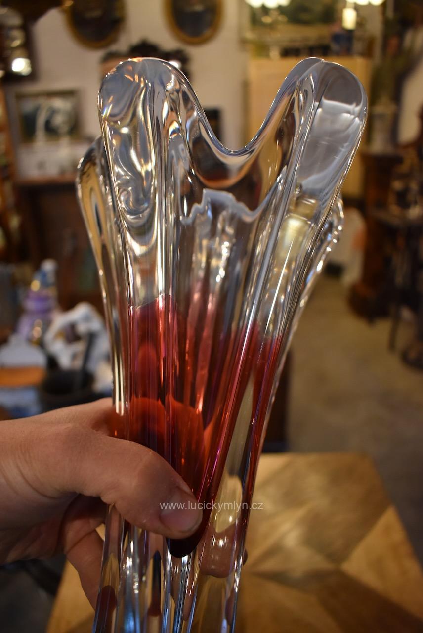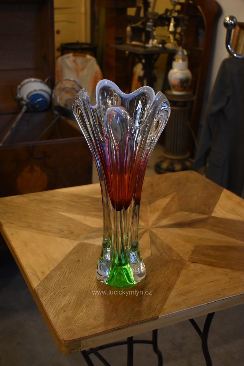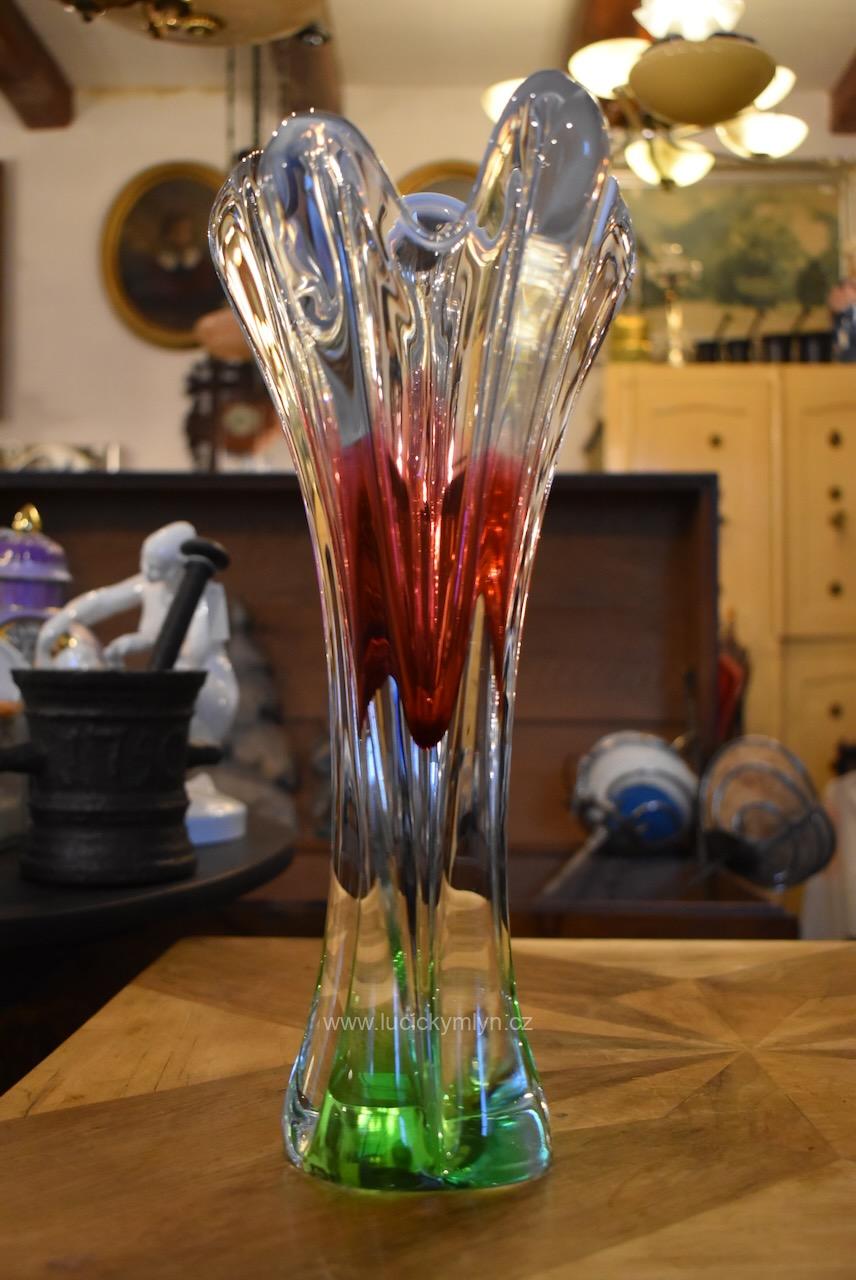 Osobitě foukaná váza z hutního skla, pocházející z legendární sklárny Chřibská, podle návrhu Josefa Hospodky – jednoho z nejvýznamnějších českých sklářských výtvarníků druhé poloviny 20. století. Tvarově dynamická plastika s poutavě rozevlátým hrdlem, připomíná divoký květ, jehož organické linie jsou pro Hospodkův rukopis zcela typické. Střední část nádoby ve tvaru divokého kmenu, přechází z transparentní, malinově červené do ledově průzračného až mléčně bílého opalínu, zatímco základnu charakterizuje sklo čiré, přecházející do jasně zeleného tónu. Tato horizontálně vrstvená a pestře vybarvená kombinace, se opticky promítá v čiré sklovině. Při dopadu i slabého světla, rozehrávají neposedné teplé paprsky svou fascinující barevnou hru, formovanou zrcadlově chladnými ledovými odlesky. Váza byla vytvořena v období, kdy české sklo udávalo směr světovému designu, a její plasticky modelovaný tvar patří mezi ikony stylu „Hi Sklo – Lo Sklo“. Velmi dobrý původní stav bez poškození. Tento elegantní kus představuje typickou ukázku mistrovství chřibských sklářů. Váza krásně vynikne jako samostatná solitérní dekorace – ať už na světlem zalitém stole, nebo ve vitrínce se sbírkou českého poválečného designu.