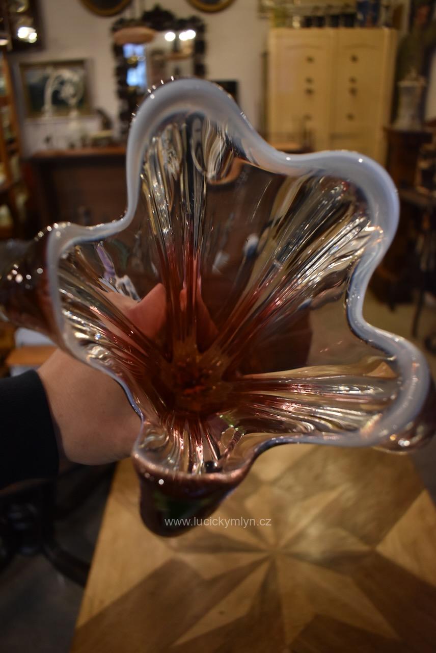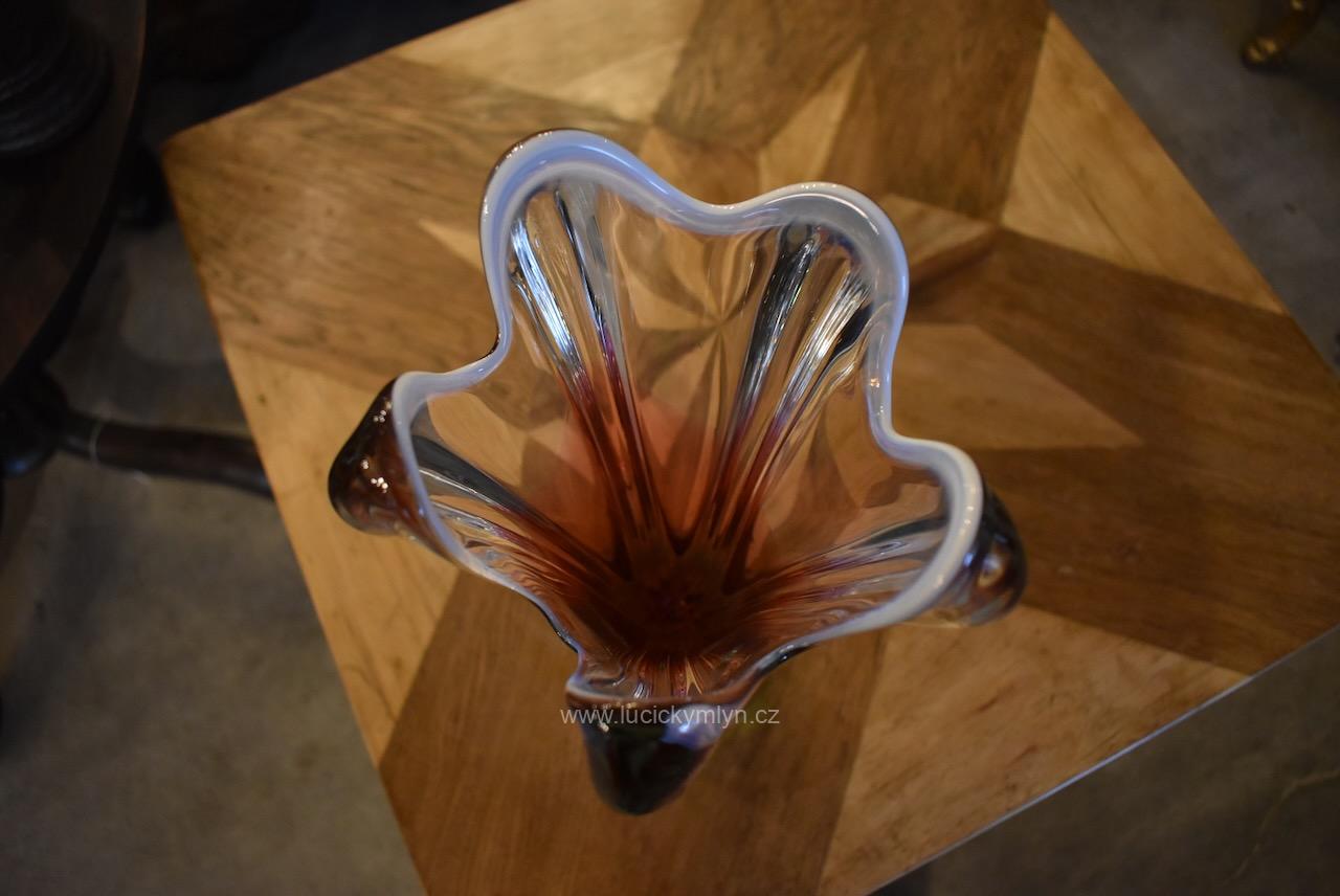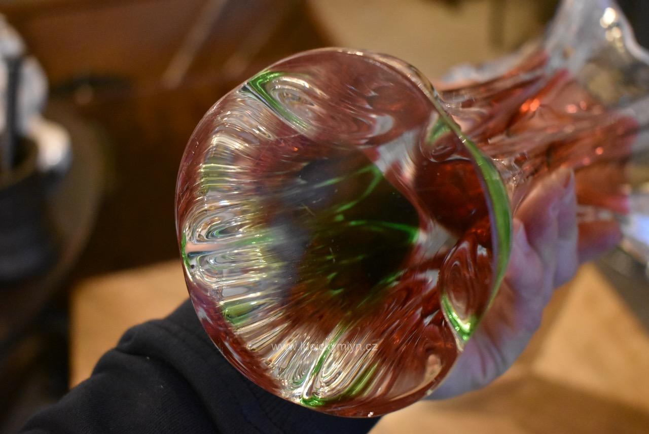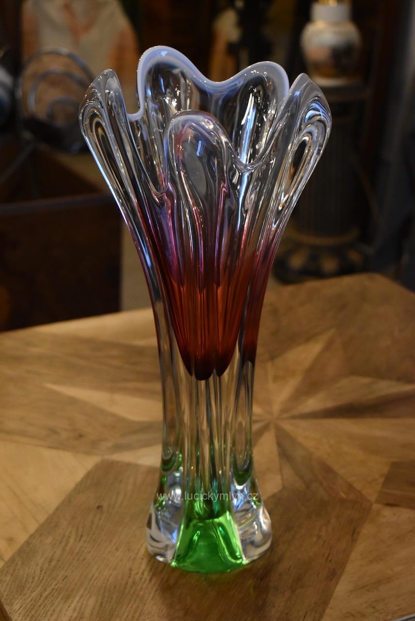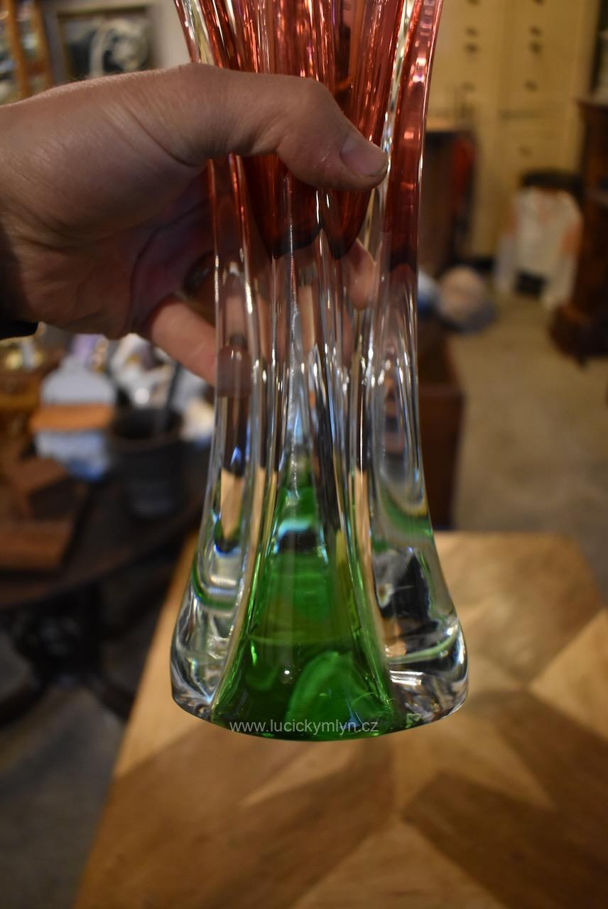 Osobitě foukaná váza z hutního skla, pocházející z legendární sklárny Chřibská, podle návrhu Josefa Hospodky – jednoho z nejvýznamnějších českých sklářských výtvarníků druhé poloviny 20. století. Tvarově dynamická plastika s poutavě rozevlátým hrdlem, připomíná divoký květ, jehož organické linie jsou pro Hospodkův rukopis zcela typické. Střední část nádoby ve tvaru divokého kmenu, přechází z transparentní, malinově červené do ledově průzračného až mléčně bílého opalínu, zatímco základnu charakterizuje sklo čiré, přecházející do jasně zeleného tónu. Tato horizontálně vrstvená a pestře vybarvená kombinace, se opticky promítá v čiré sklovině. Při dopadu i slabého světla, rozehrávají neposedné teplé paprsky svou fascinující barevnou hru, formovanou zrcadlově chladnými ledovými odlesky. Váza byla vytvořena v období, kdy české sklo udávalo směr světovému designu, a její plasticky modelovaný tvar patří mezi ikony stylu „Hi Sklo – Lo Sklo“. Velmi dobrý původní stav bez poškození. Tento elegantní kus představuje typickou ukázku mistrovství chřibských sklářů. Váza krásně vynikne jako samostatná solitérní dekorace – ať už na světlem zalitém stole, nebo ve vitrínce se sbírkou českého poválečného designu.