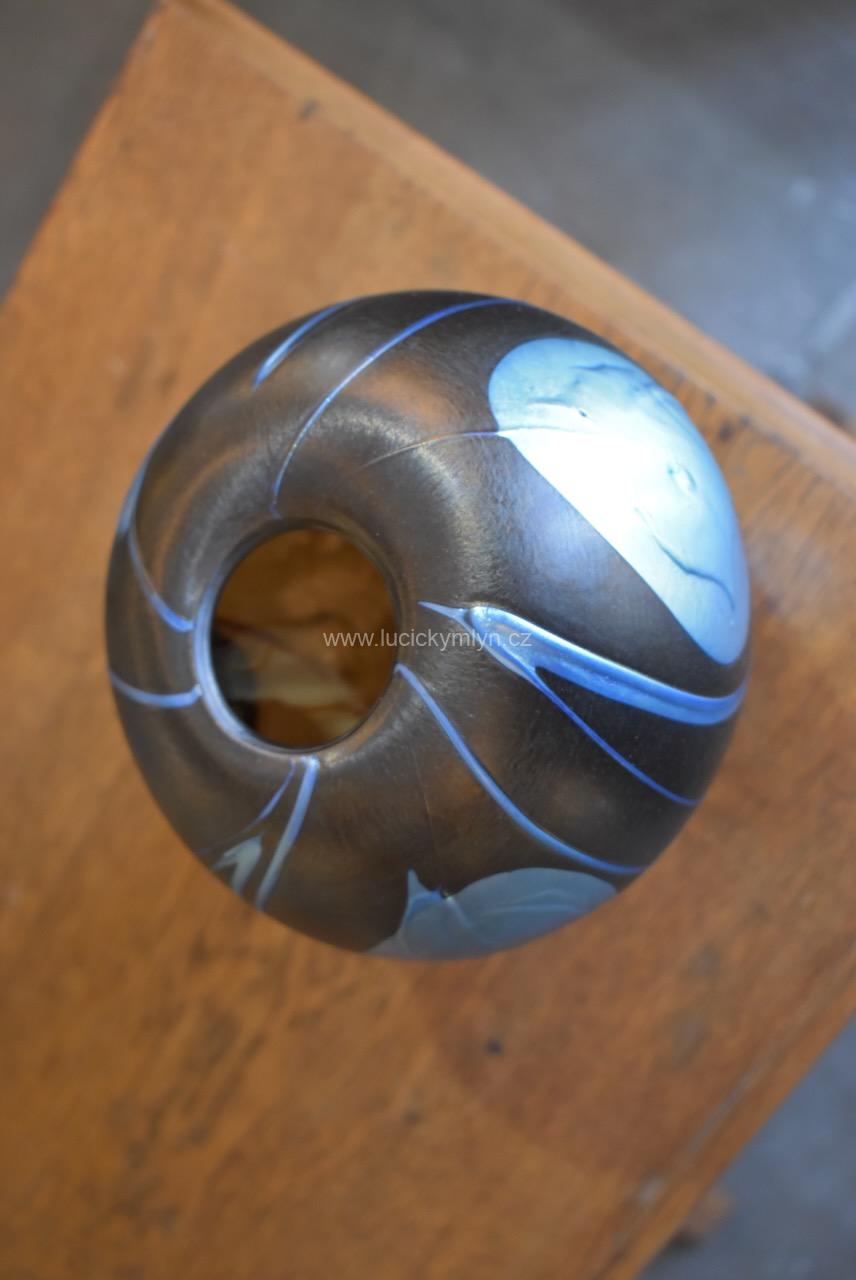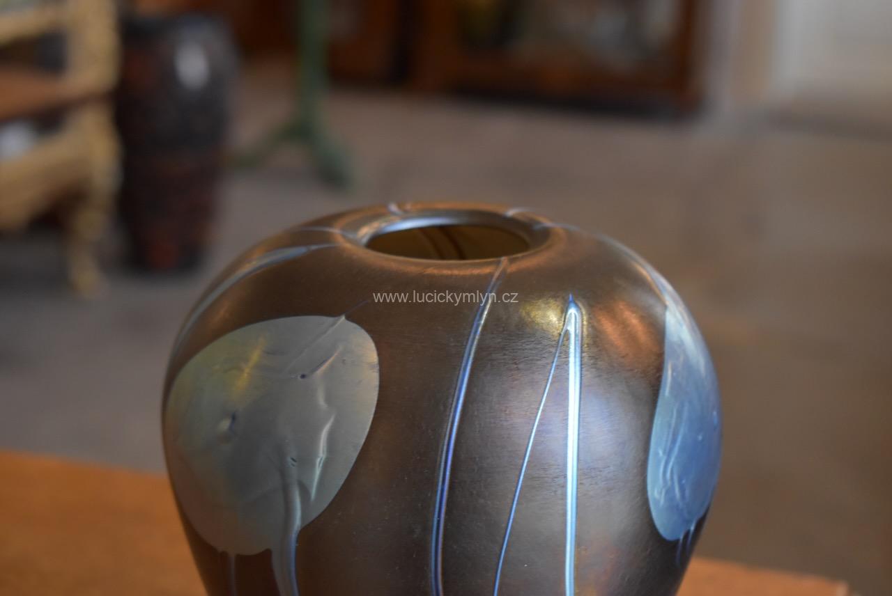 Krásná a cenná secesní váza z umělecky přejímaného skla. Základem vázy je tmavě tónovaná průsvitná sklovina s duhovými odlesky a perlově matným povrchem. Její hladce zaoblený tvar byl vegetativně ozvláštněn světlou, nefritově zelenou, pouze místy přejímanou sklovinou. Umělecká váza tak zcela přirozenou cestou navazuje na vybarvení a odlesky vzácných a ušlechtilých nerostů. Její povrch je plasticky protkán zatavenými listy či plody a vlásečnicemi od zlatavé až po rozličné duhové barvy, v závislosti na druhu i intenzitě osvícení. Na takto náročné úpravy se v době secese používaly nejen kysličníky kovů, ale i malé části roztavené zlaté folie. Výsledkem je nevšední a hodnotná váza nadčasově prostého tvaru, která Vás okouzlí svým nenápadně přitažlivým naturálním povrchem. Počátek 20. století. Značeno sklárna Loetz Klášterský mlýn. Velmi dobrý stav bez jakéhokoli poškození.