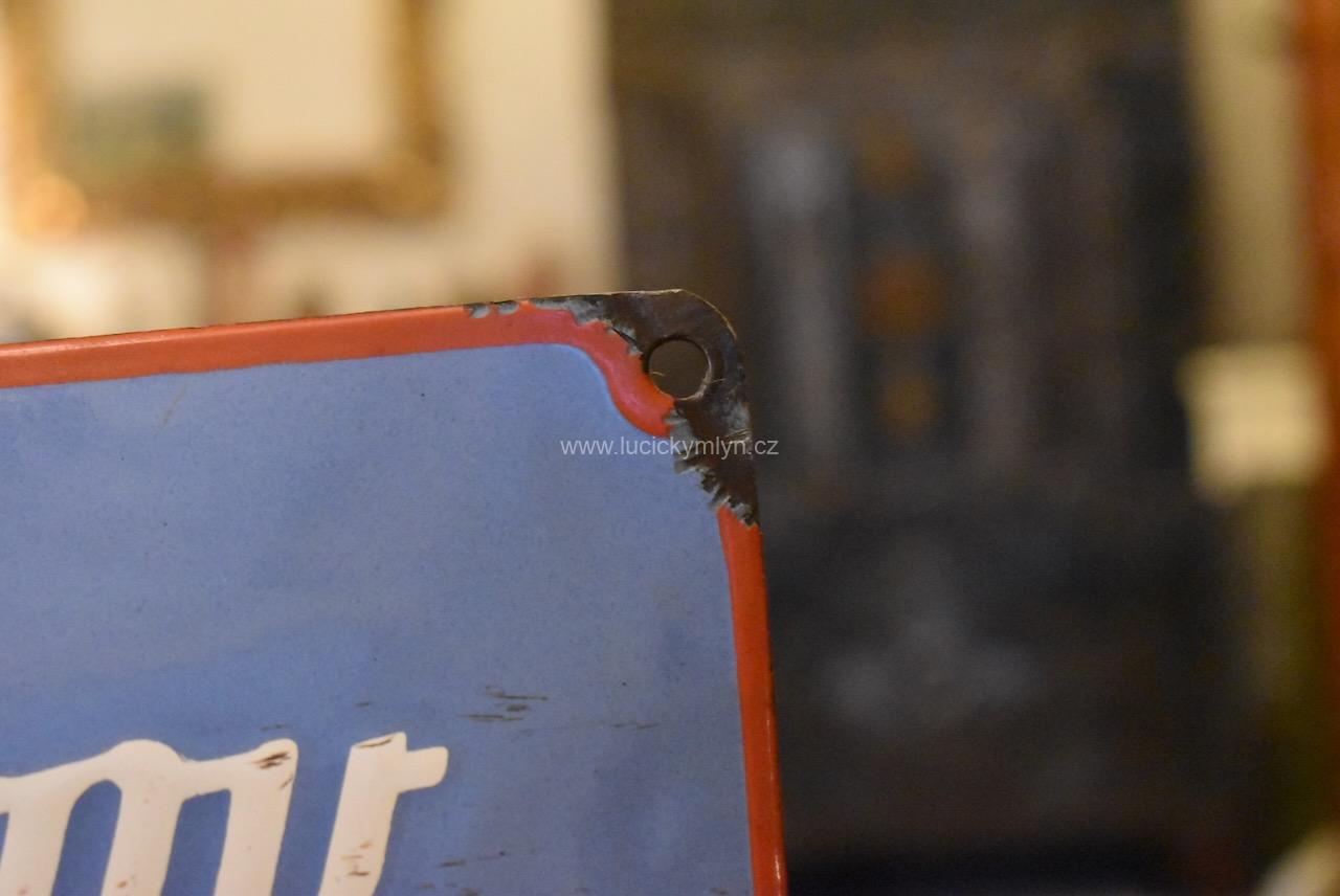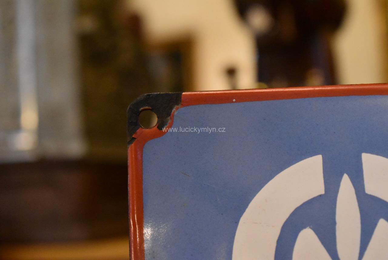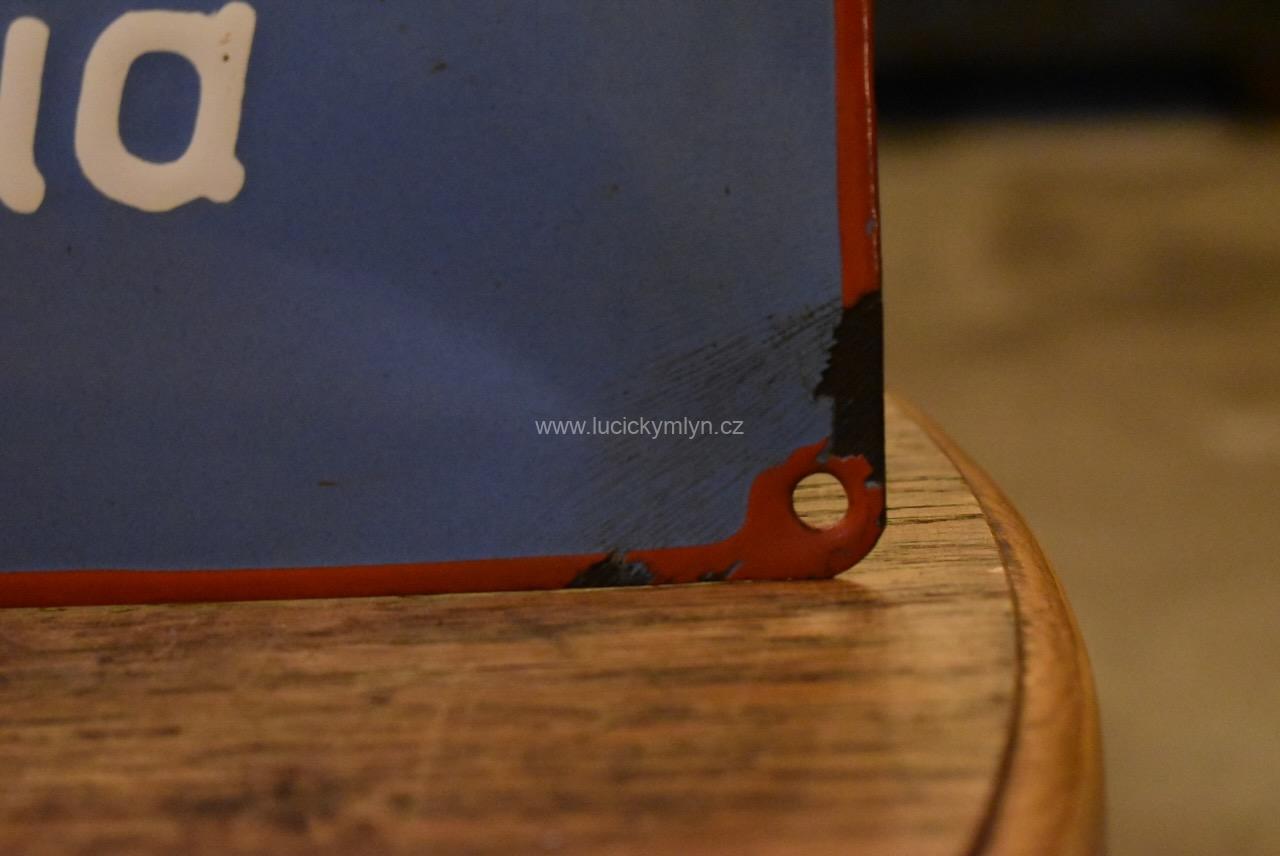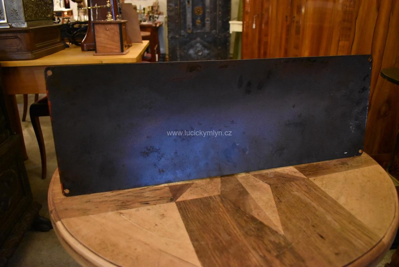 Silný ocelový a lehce vypouklý plech s nápisem chráněným lesklou skelnou glazurou. Originální starožitný sběratelský předmět v původním, generacemi opotřebeném stavu. Více oprýskaný smalt je viditelný na jednom místě v ploše a dále i na rohových okrajích. Starožitná cedule je vhodná nejen pro muzejníky a sběratele.