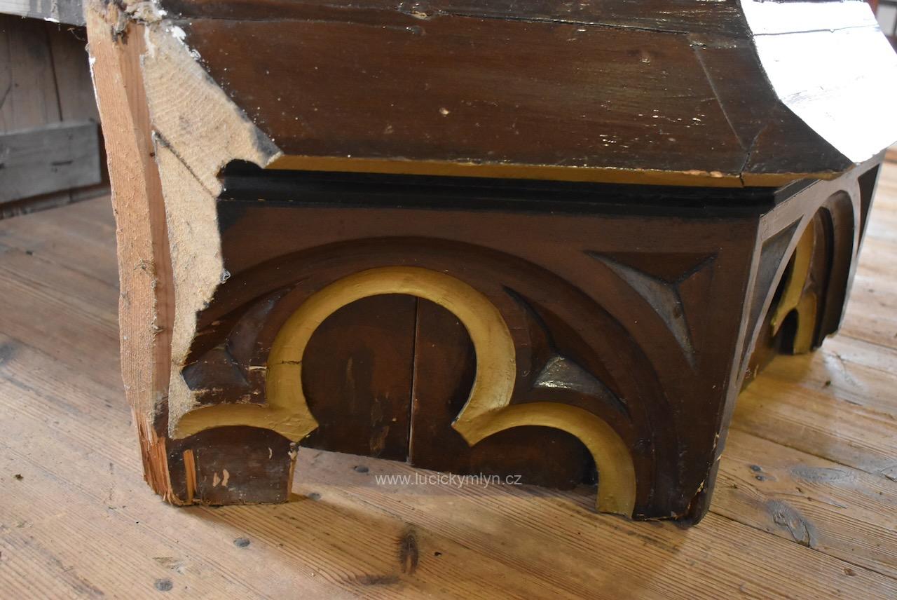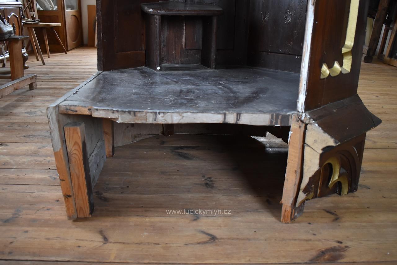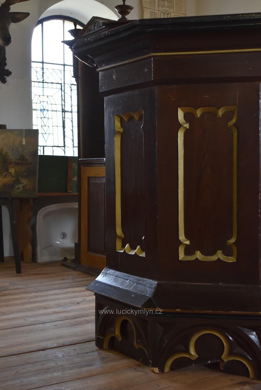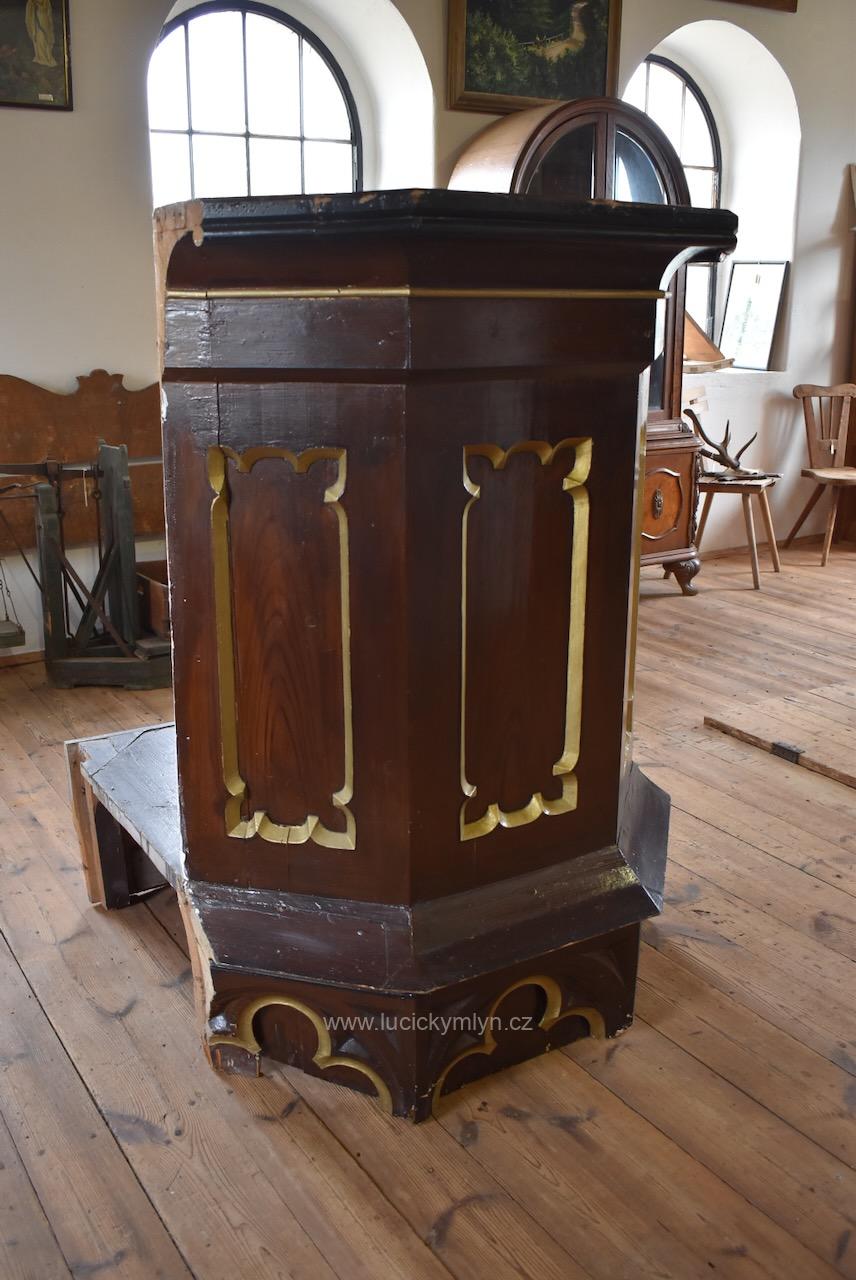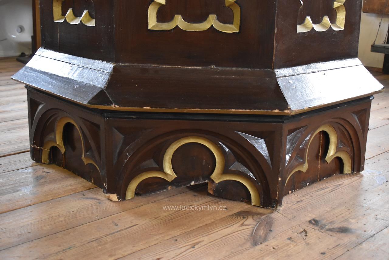 Starožitná kazatelna z dnes již neznámého venkovského kostela vyrobená v neogotickém stylu ze smrkového dřeva v 19. stol.