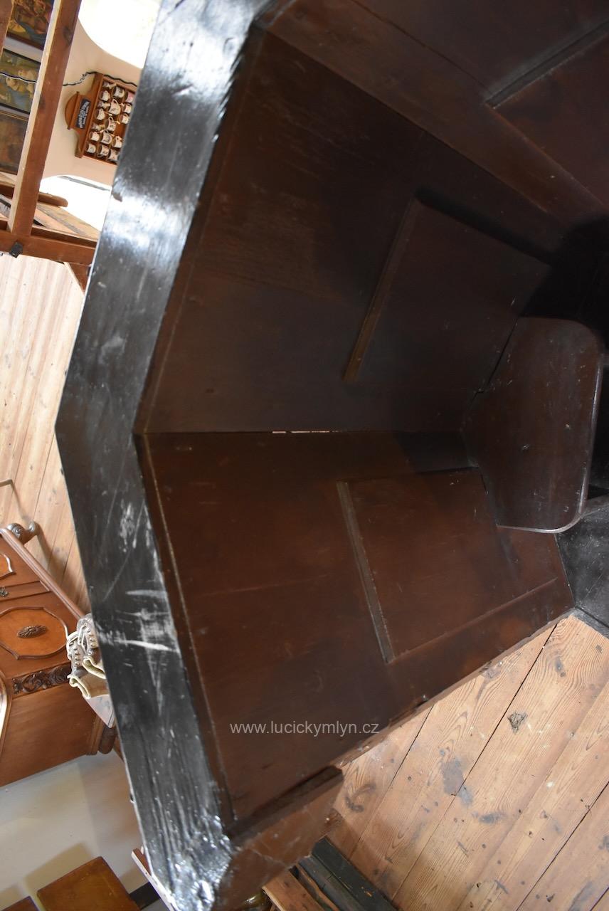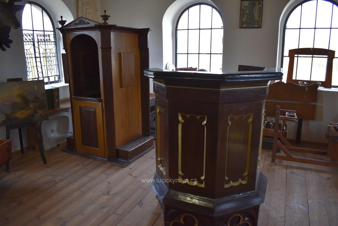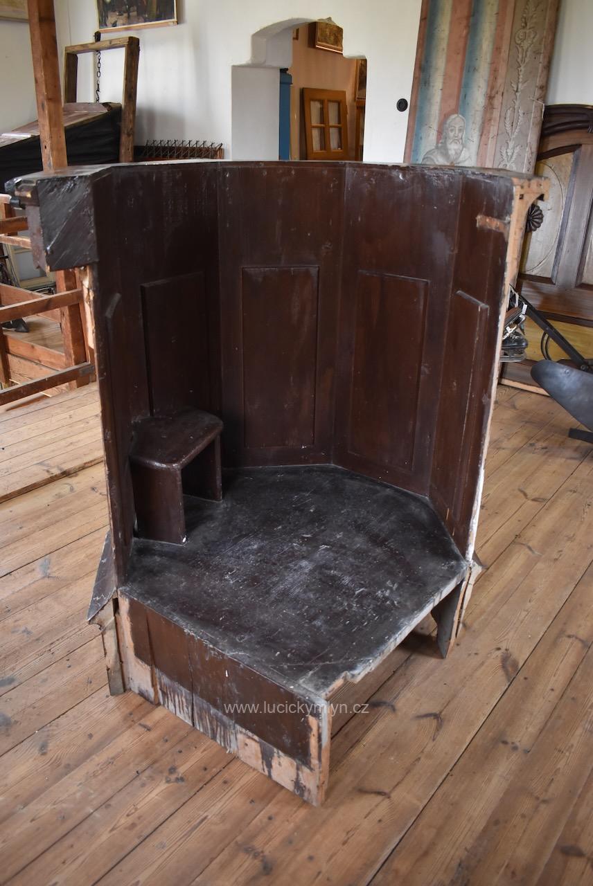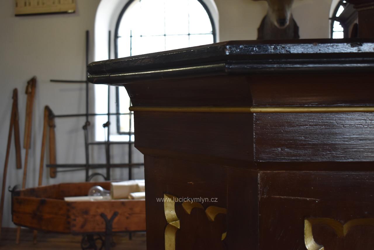 Starožitná kazatelna z dnes již neznámého venkovského kostela vyrobená v neogotickém stylu ze smrkového dřeva v 19. stol.