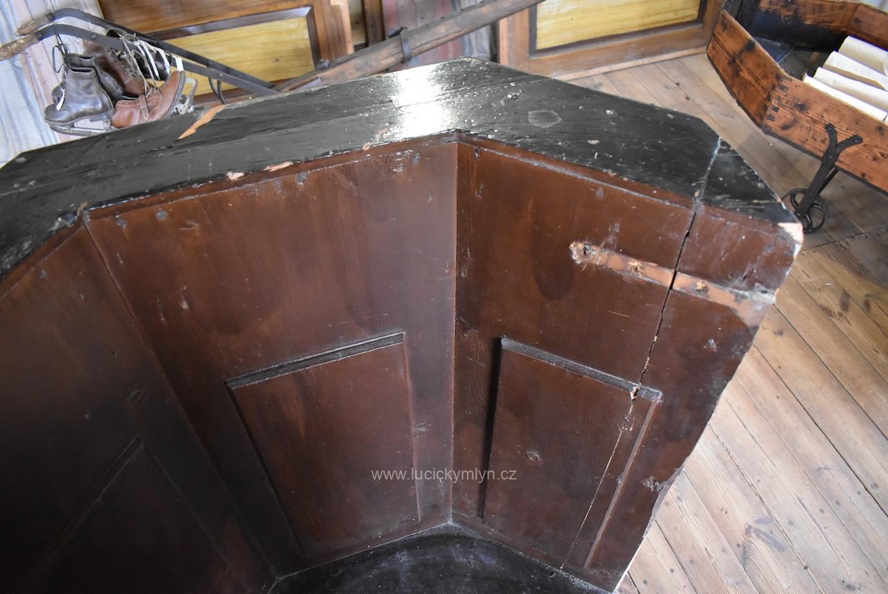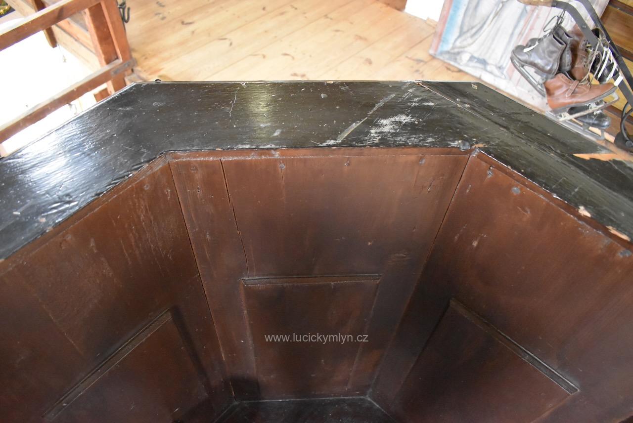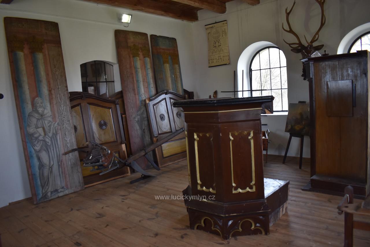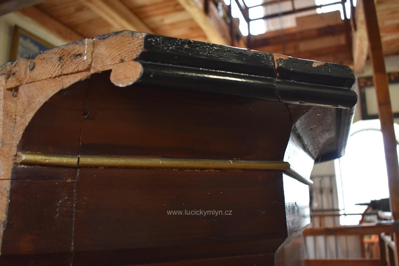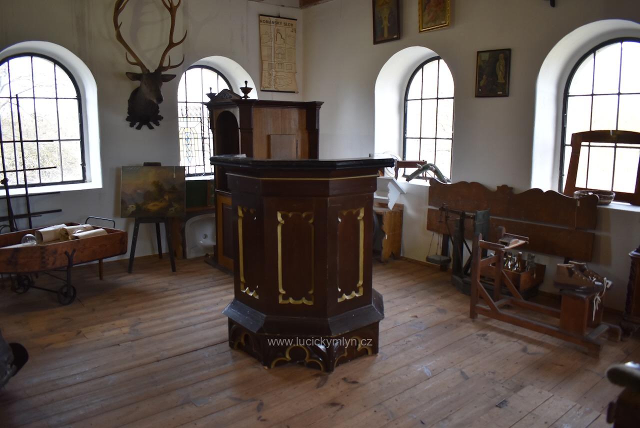 Starožitná kazatelna z dnes již neznámého venkovského kostela vyrobená v neogotickém stylu ze smrkového dřeva v 19. stol.