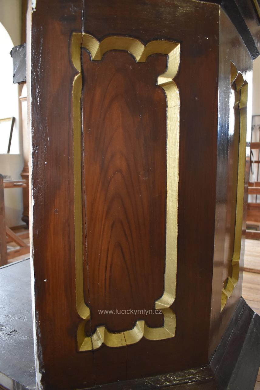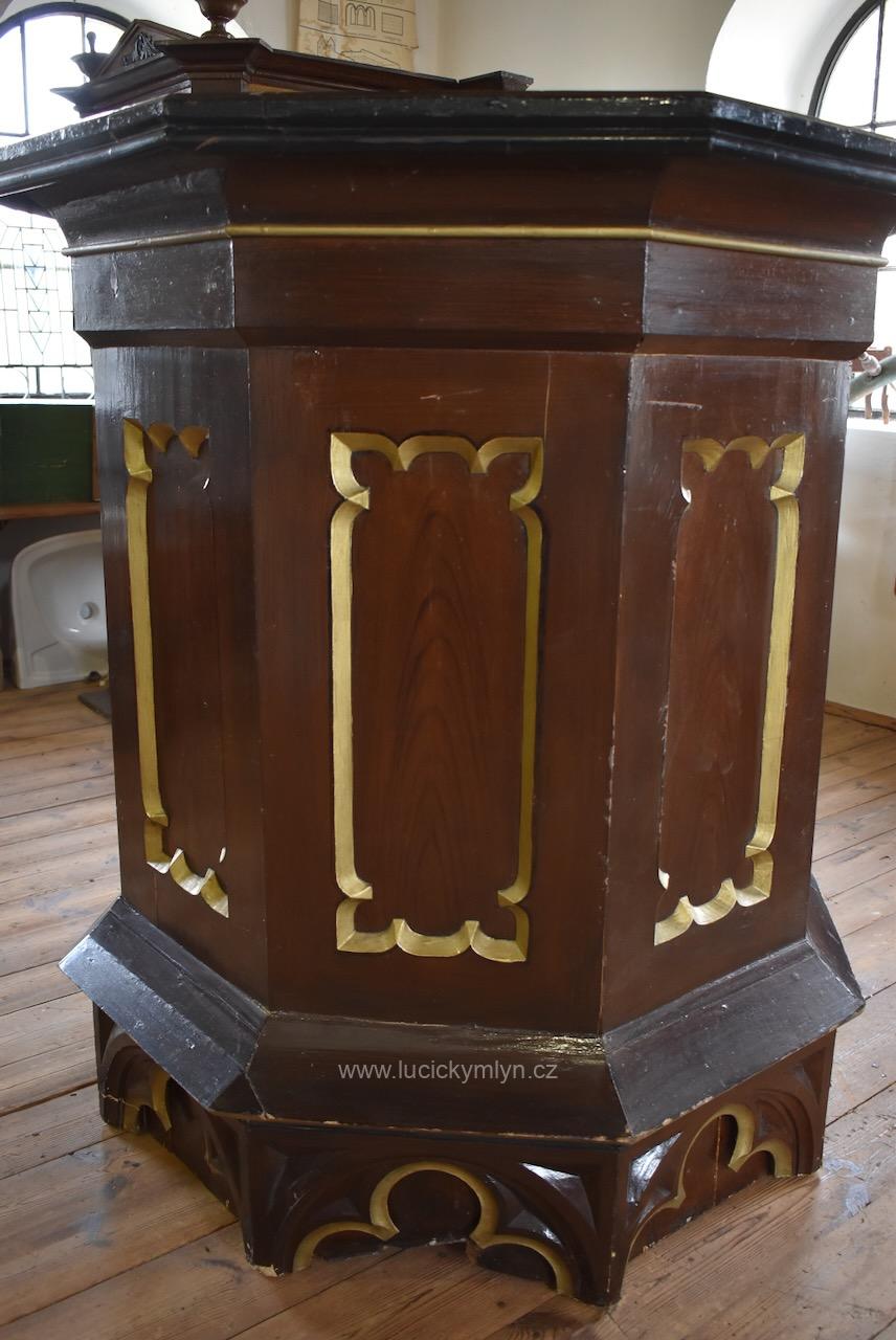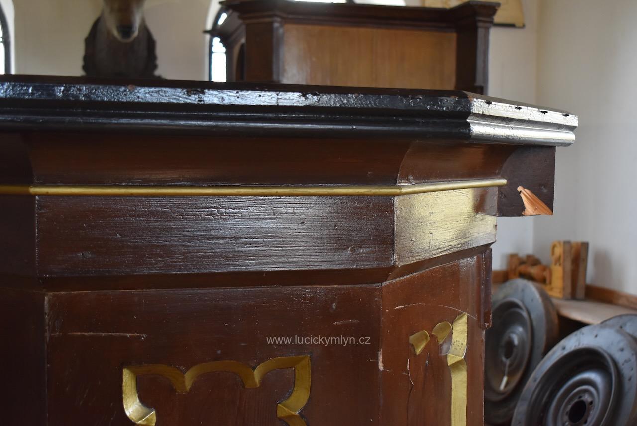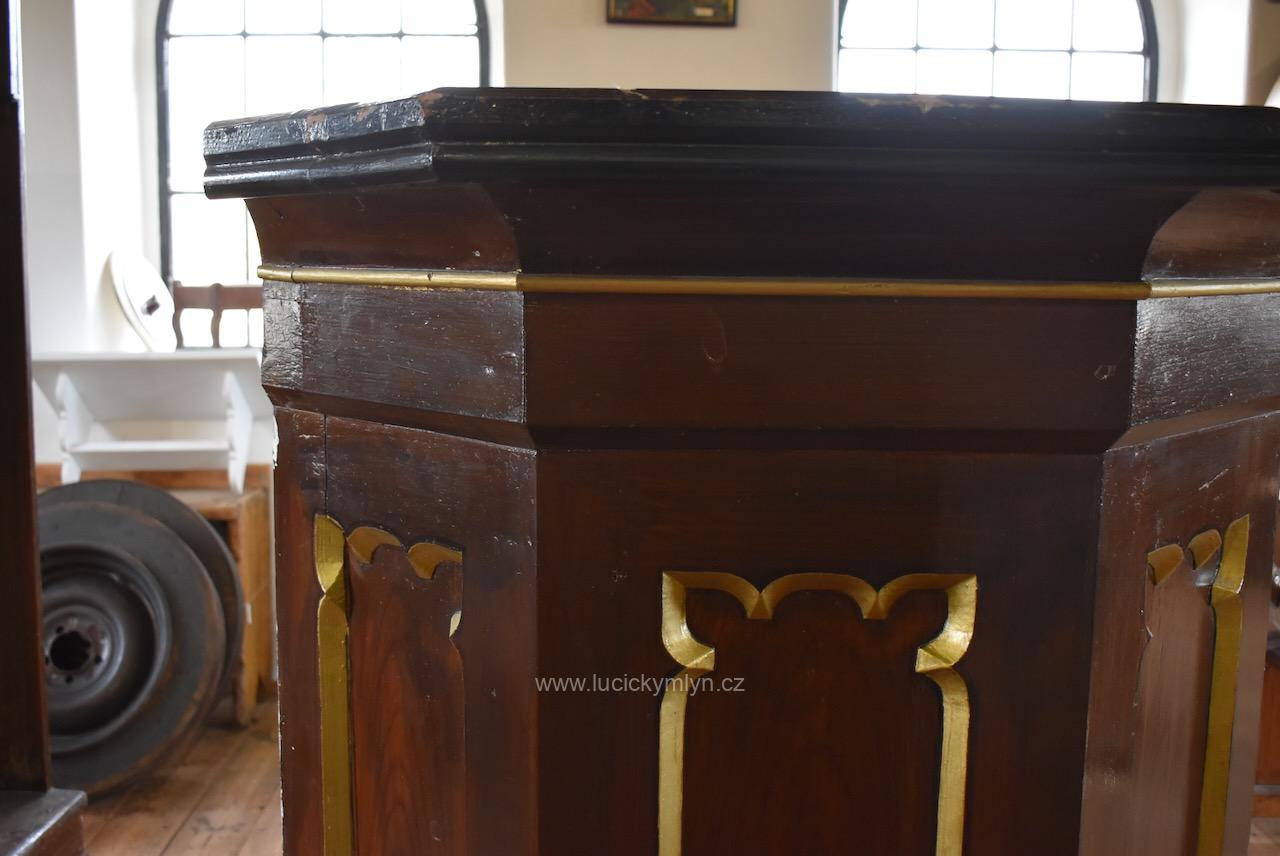Tato vyřazená kazatelna z měkkého dřeva pochází z venkovského prostředí a svým tvaroslovím navazuje na pozdně barokní až klasicistní tradici 19. století. Víceboký korpus s rytmizovanými profilacemi a malovanými zlacenými šambránami působí jako malý dřevěný „oltář slova“ uprostřed kostelní lodi, ze kterého nejeden kněz plamenně kázal slova Kristova o sedmi hříchách na které se už pozapomnělo. Uvnitř kazatelny se dochovalo původní dřevěné stupátko a jednoduché obložení stěn, na němž jsou stále patrné stopy původní povrchové úpravy. Spodní část kazetové kazatelny byla v minulosti účelově zkrácena. Podstavec je možné řemeslně doplnit podle stávajících profilací, nebo naopak ponechat v současné podobě a využít kazatelnu jako výrazný solitérní prvek v interiéru (domácí kaple, stylová knihovna nebo jiný nápaditý projekt). Přes provozní opotřebení nese tento ojedinělý kus silnou historickou a duchovní patinu. Interiérový prvek je vhodné citlivě renovovat a navrátit do sakrálního prostoru, nebo použít jako výrazný dekorativní objekt s autentickou atmosférou minulých století.