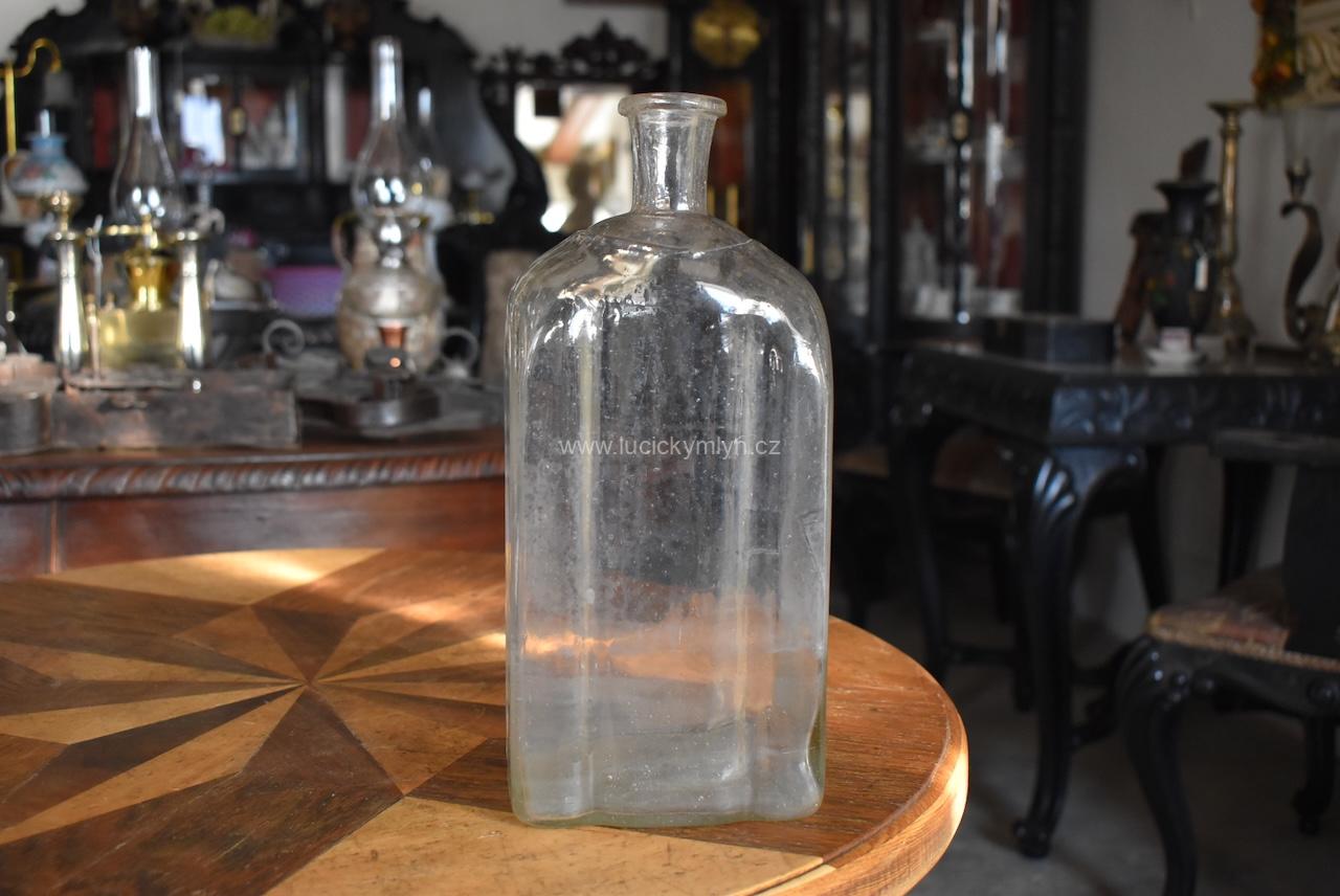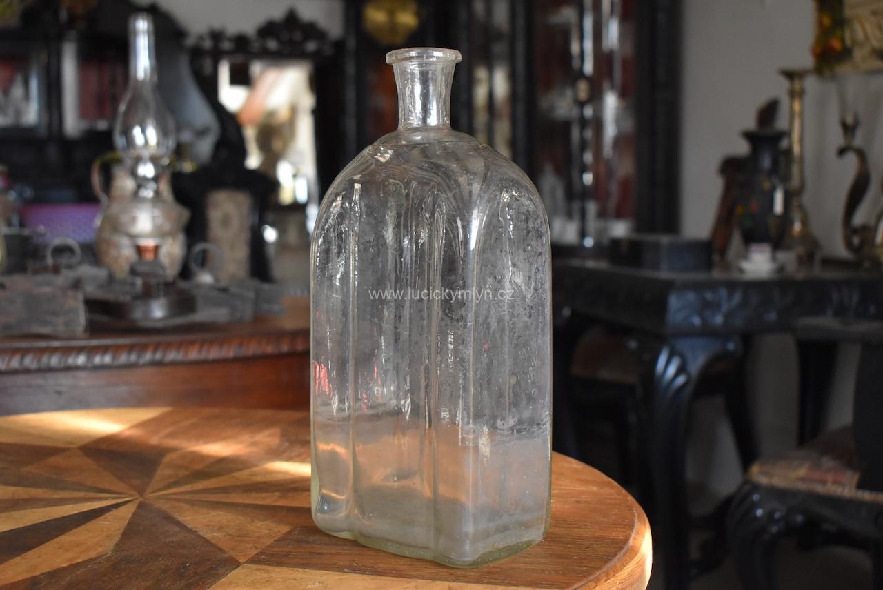 Větší starožitná, vzácně dochovaná barokní láhev na kořalku, zvaná pryska, ručně vyrobená z foukaného čirého skla