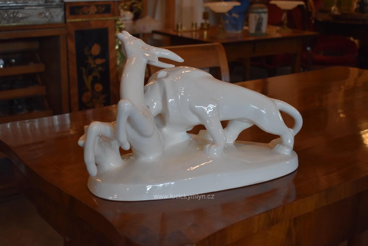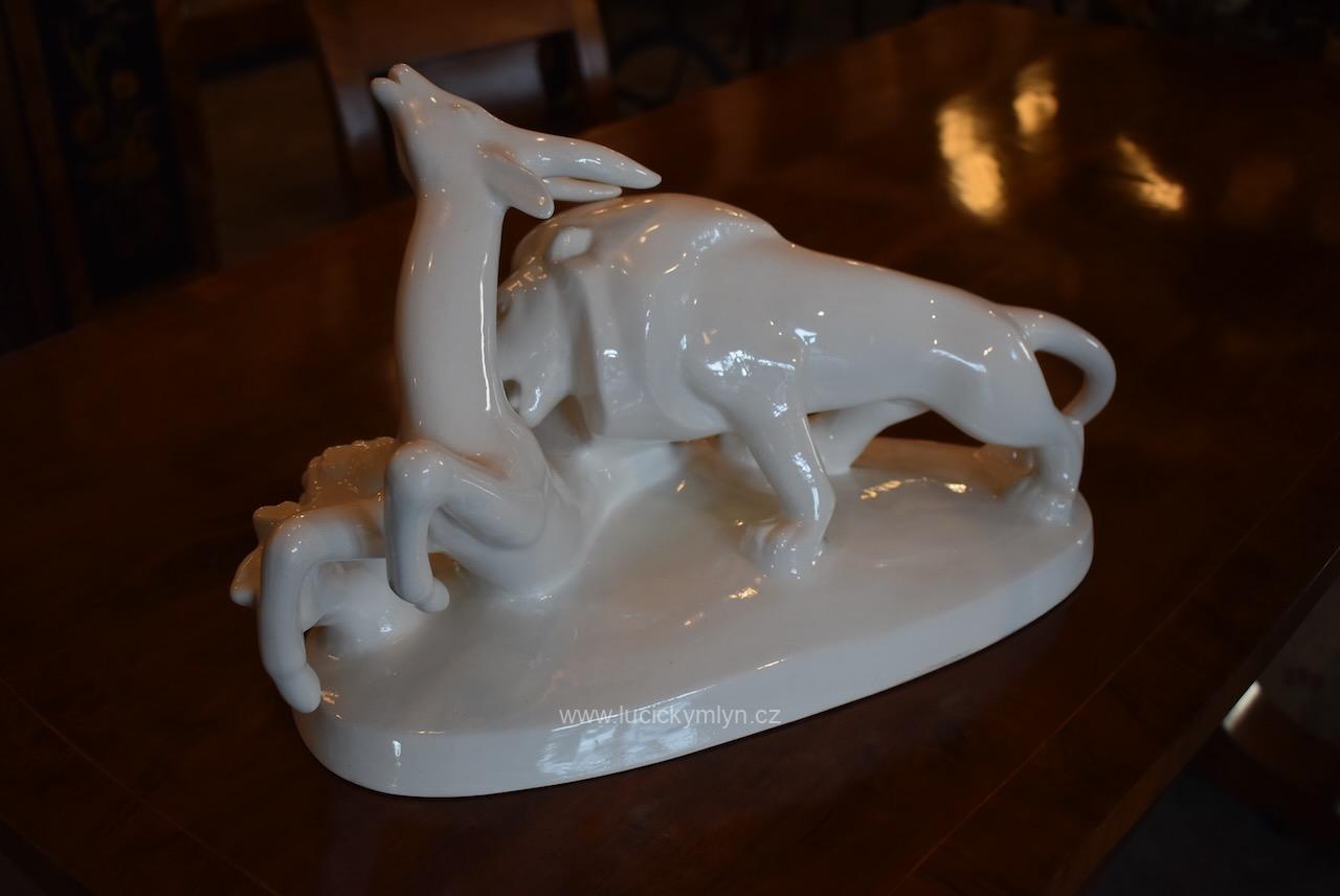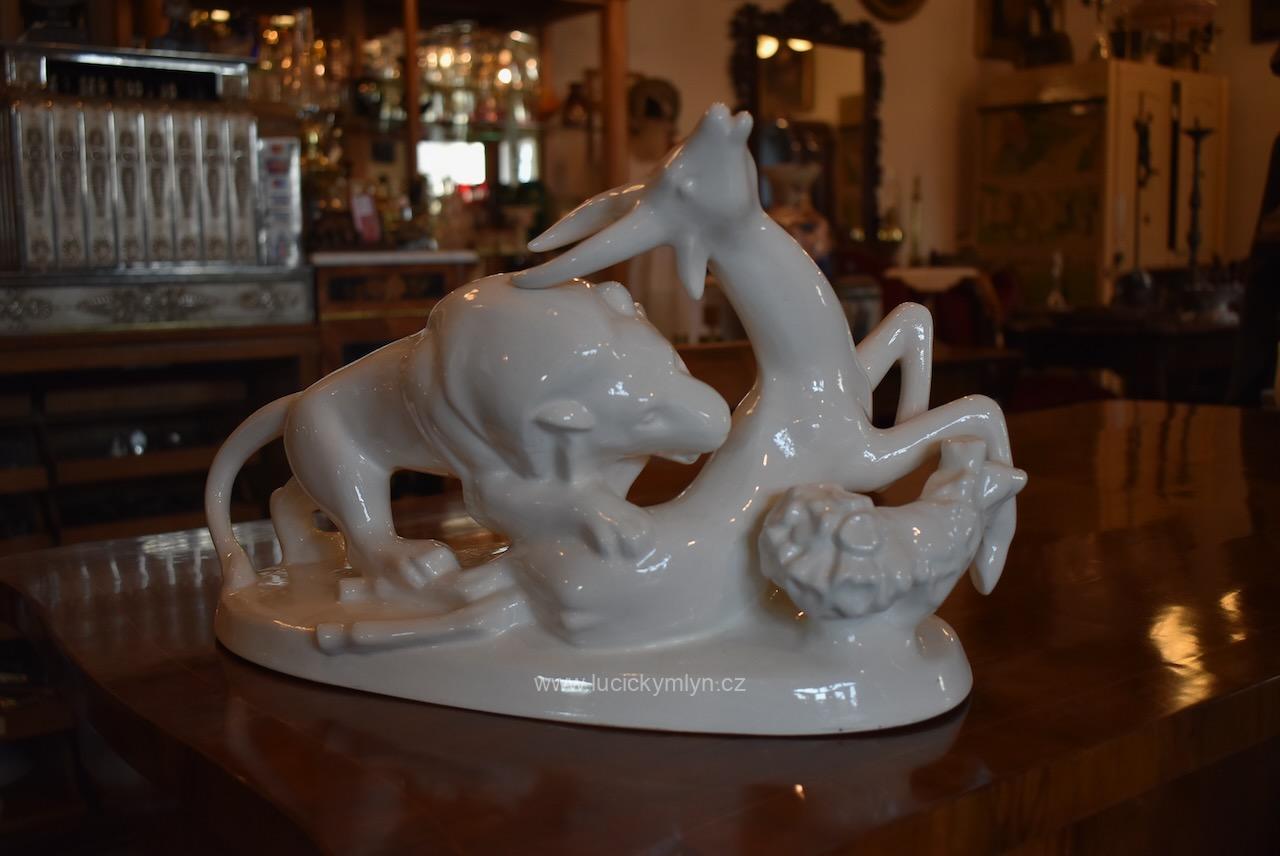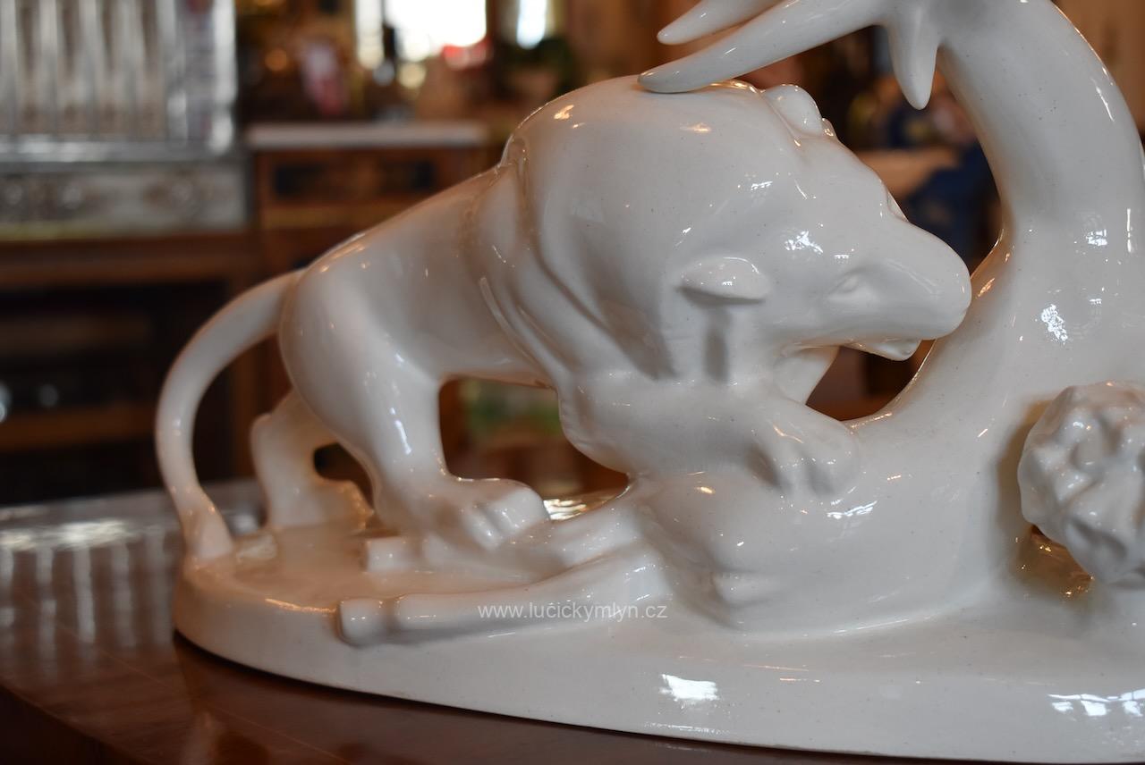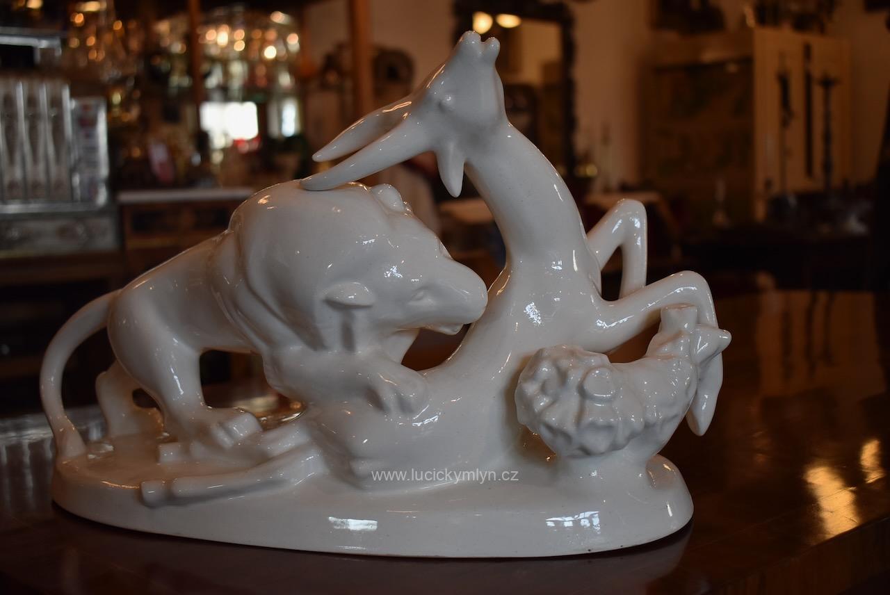 Starožitná keramická plastika – lev zdolávající antilopu, méně čitelná signatura – Dobiáš