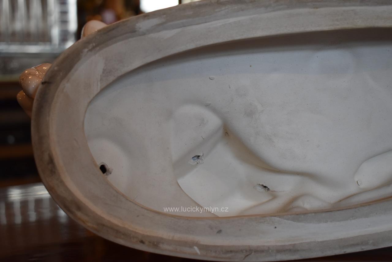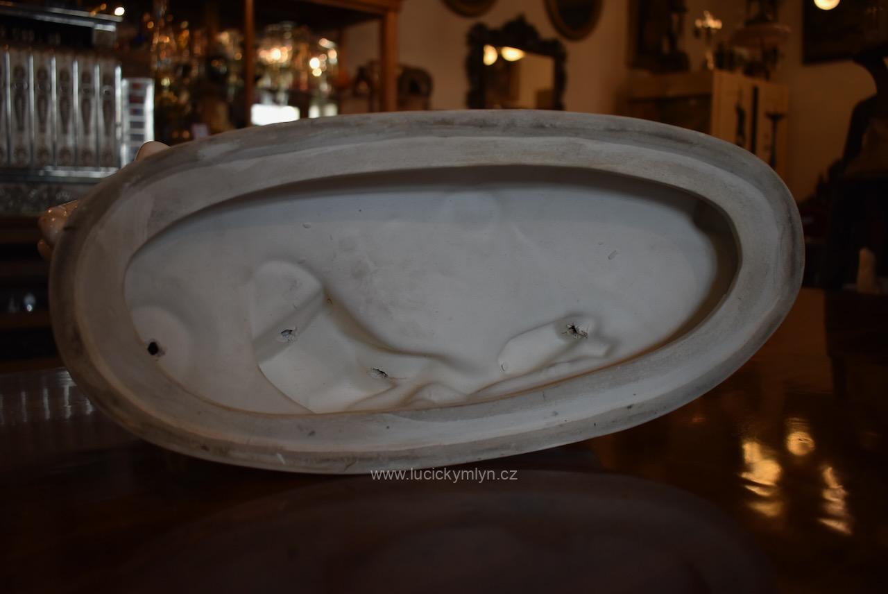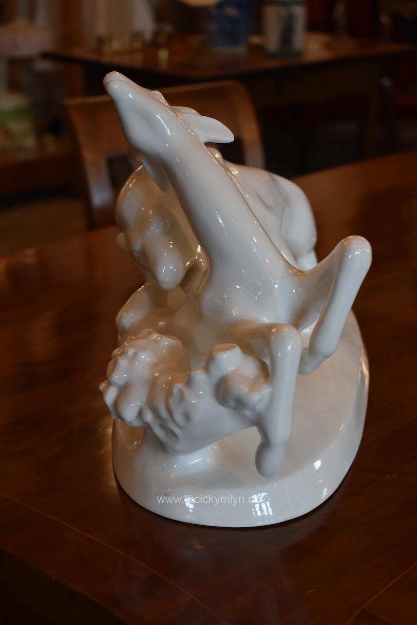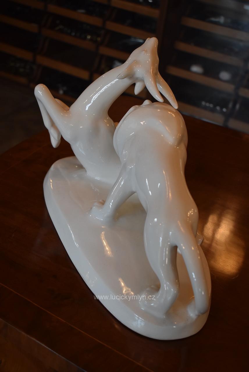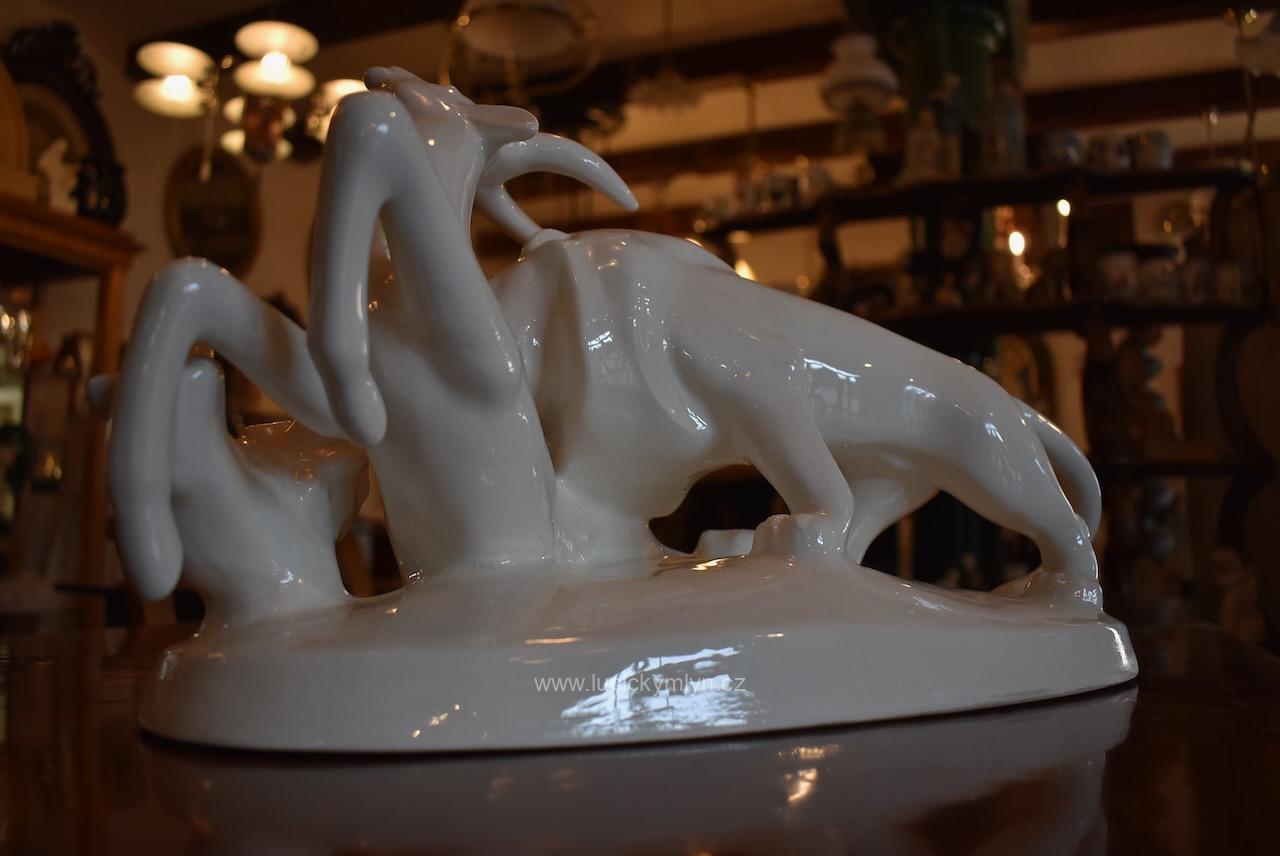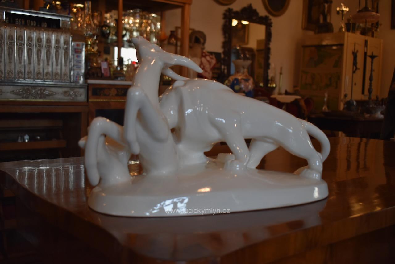 Starožitná keramická plastika – lev zdolávající antilopu, méně čitelná signatura – Dobiáš