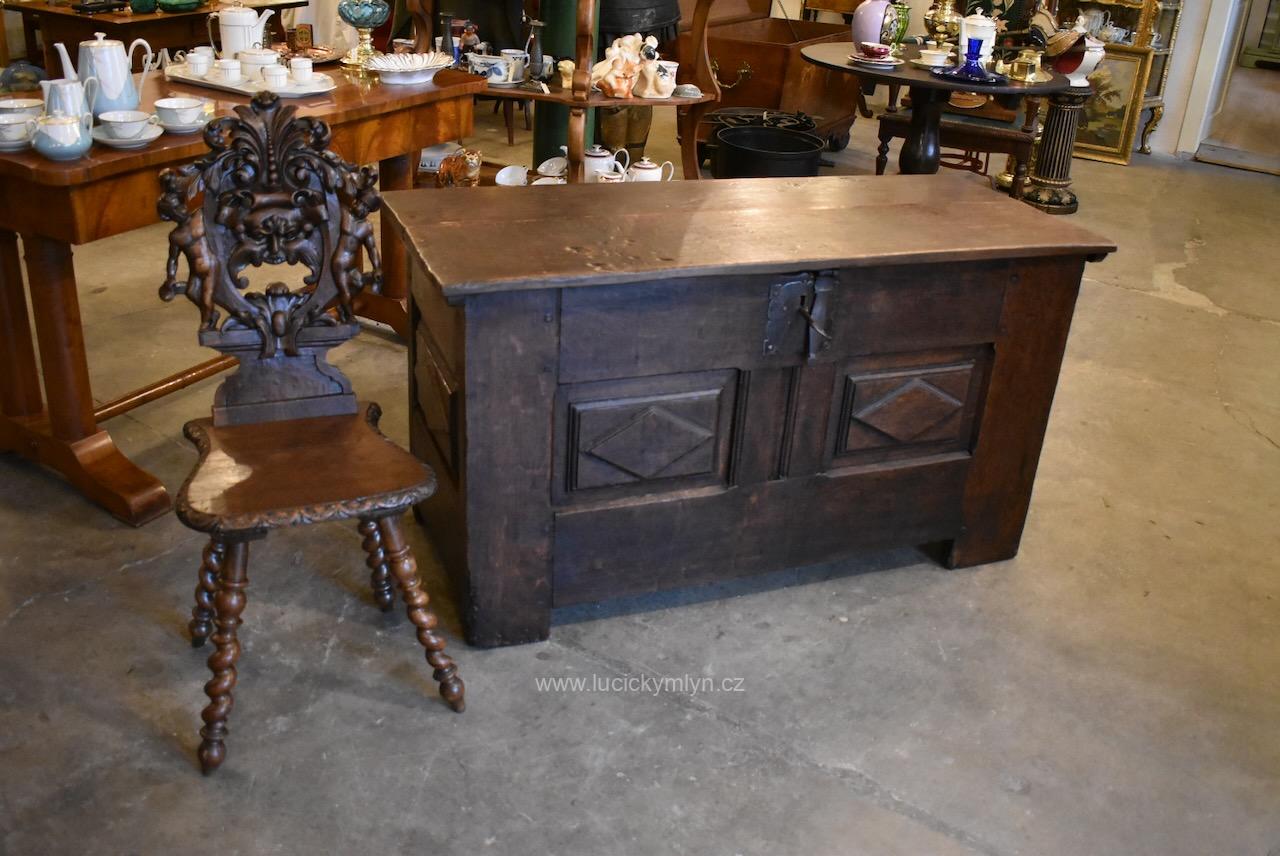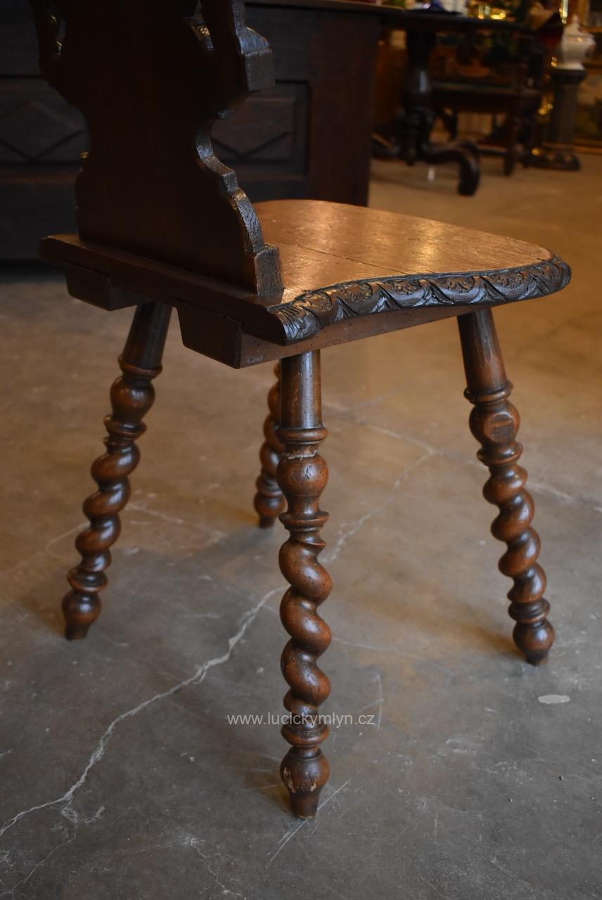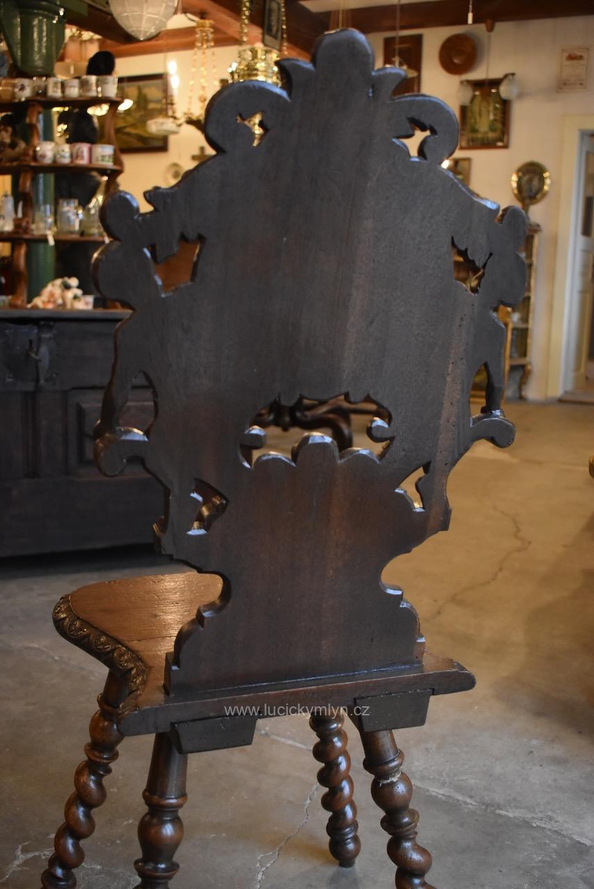 Zcela originální a zachovalá židle, byla ručně vyrobena z masivního dubu. Deskové dílce jsou pevně spojeny za pomoci čepů a dlabů. Dále bylo použito i tzv. rybinového spoje na spodní straně hlubokého sedáku. Tento staletími osvědčený způsob zapuštění vyztužujících svlaků, umožňuje i pevné ukotvení nohou v zrcadlově umístěných a kónicky vyvrtaných otvorech. Celými generacemi osvědčené spoje, byly pevně sklíženy kostním klihem a příčně zajištěny kolíčky a klínky. Šikmo roztažené a hluboko zapuštěné nohy jsou zárukou dobré stability. Šikovný truhlář je pomocí šlapacího soustruhu, působivě ozdobil v horní části kuželkovým soustružením a hlavní část, efektní technikou tzv. tordování, nebo-li šroubovice. Starožitná židle s bohatě řezaným opěradlem, provedená v čistém barokním slohu, byla pouze výsadou šlechty, bohatého měšťanstva či církve. Na své stáří 200 let či více se zachovala v překvapivě dobrém stavu. Po menší renovaci jsme provedli povrchovou úpravu kvalitním voskovým přípravkem. Starožitná reprezentativní židle je vhodná do historického interiéru, nebo k muzejním či filmařským účelům. S ohleduplným přístupem se dá tato krásná a cenná židle i užívat.