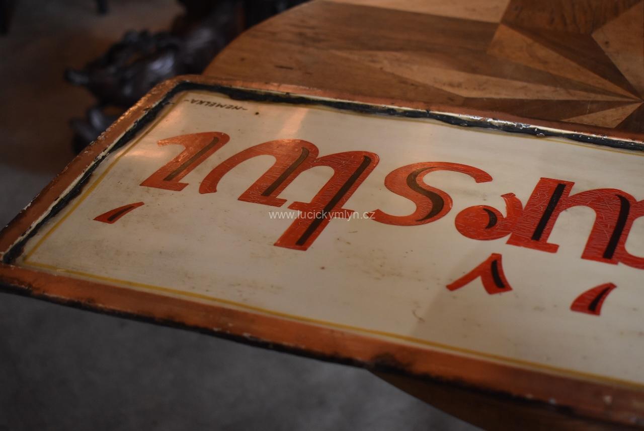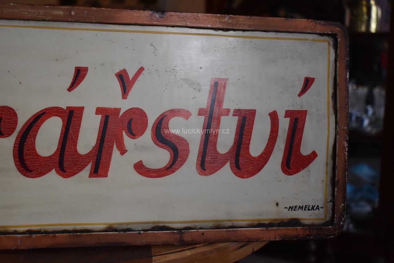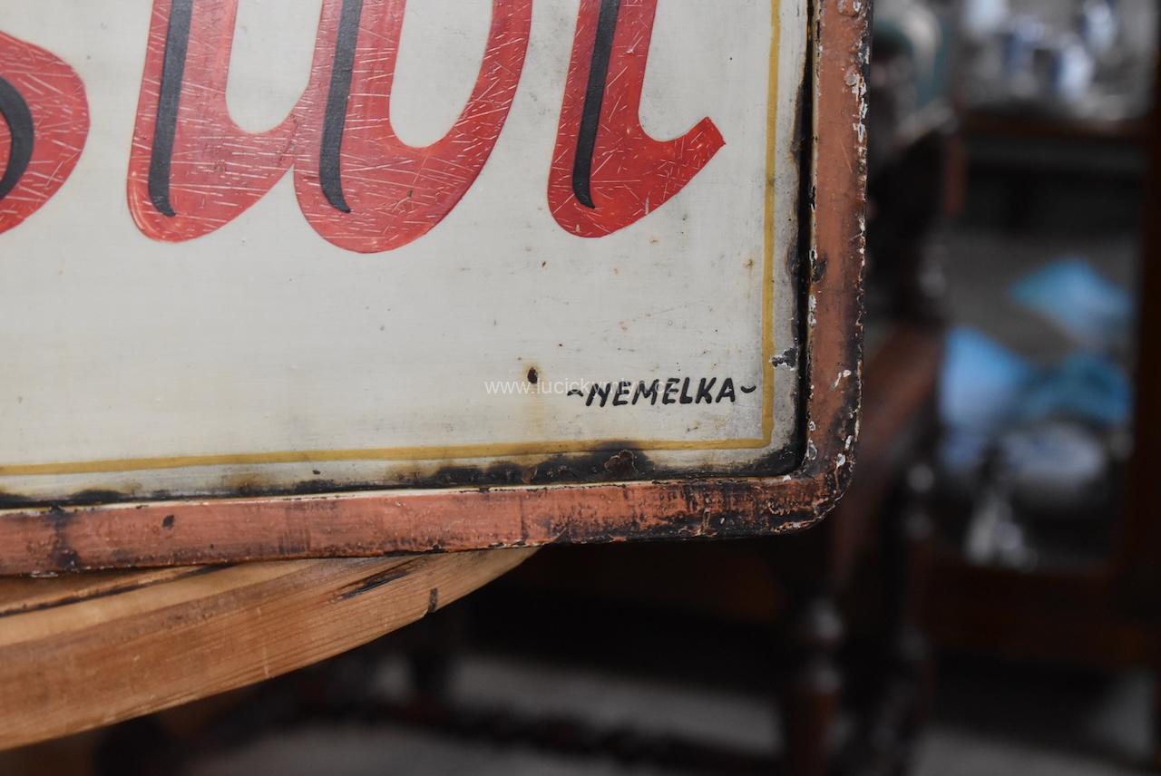 Originální, pestře vymalovaná reklamní cedule z ocelového plechu, využívá ruční techniky tzv. školeného krasopisu, který byl mnohdy povýšen na veřejné umění. Kvalita a nápaditost reklamního nápisu, byla sama o sobě i reklamou pro regionálního písmomalíře. Proto je i naše závěsná cedule označena jménem svého prvorepublikového tvůrce – NEMELKA-. Velmi dobrý původní stav s menším letitým opotřebením povrchu. Nostalgická, možná téměř stoletá cedule je vhodná pro muzejní či sběratelské účely, nebo potřebu filmu. Jistě by byla krásným interiérovým doplňkem cukrárny v prvorepublikovém stylu.