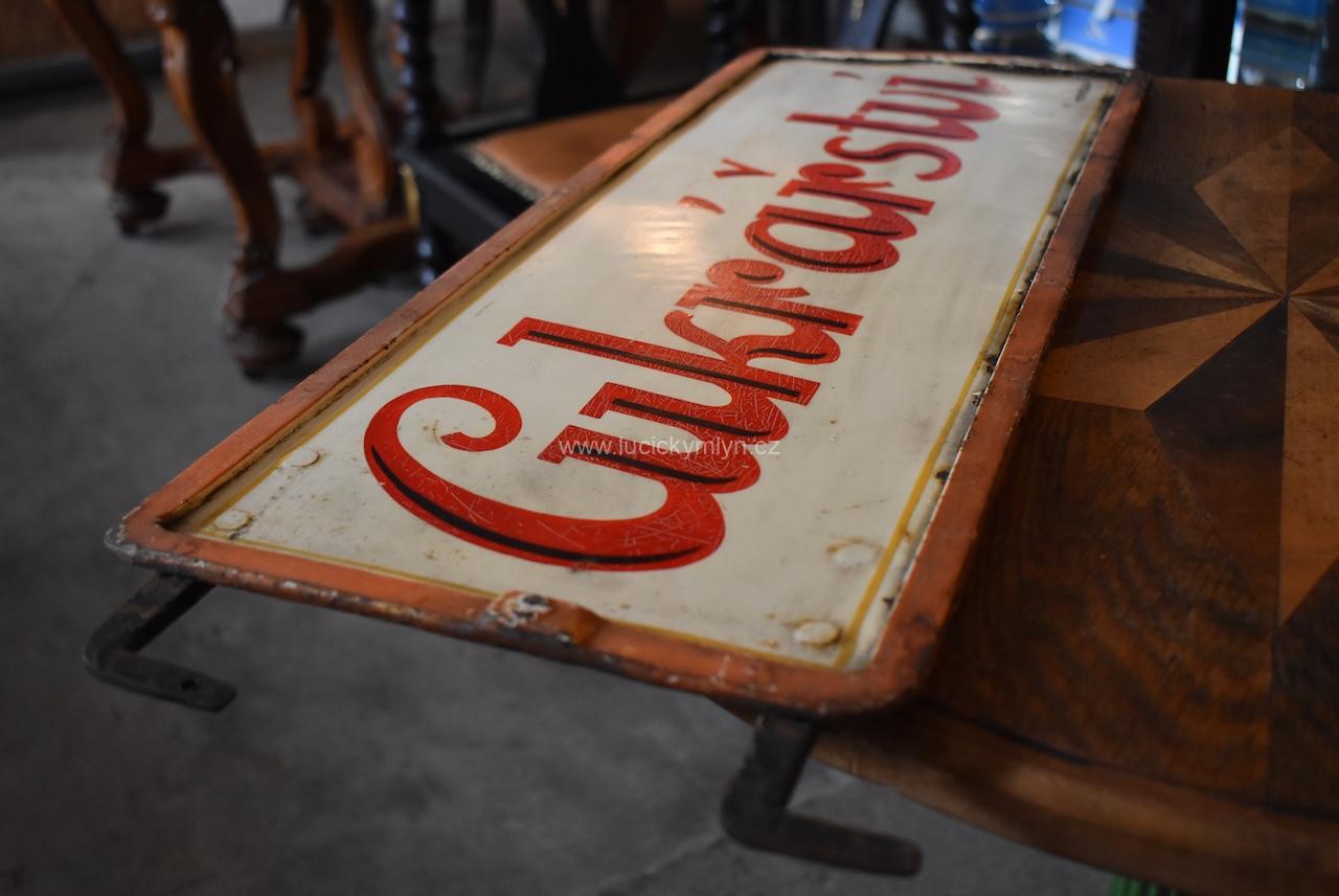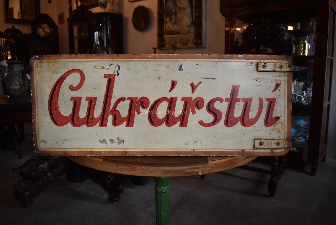 Starožitná prvorepubliková cedule CUKRÁŘSTVÍ, dílo zručného písmomalíře a zámečníka z plechu a nýtované pásoviny