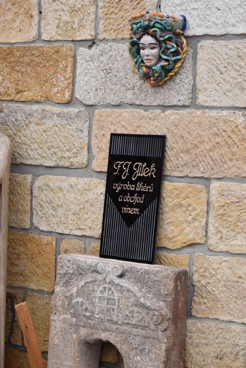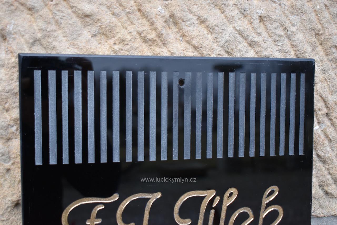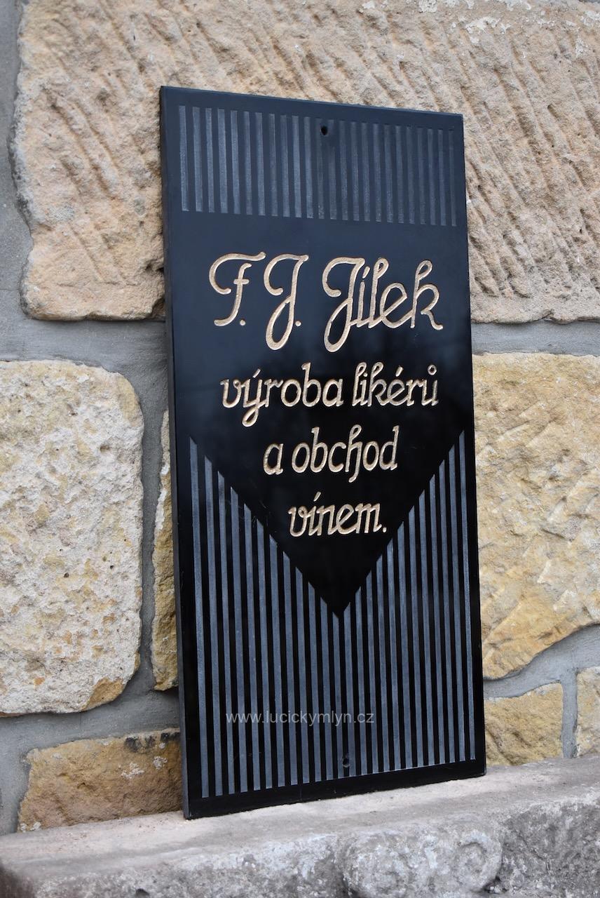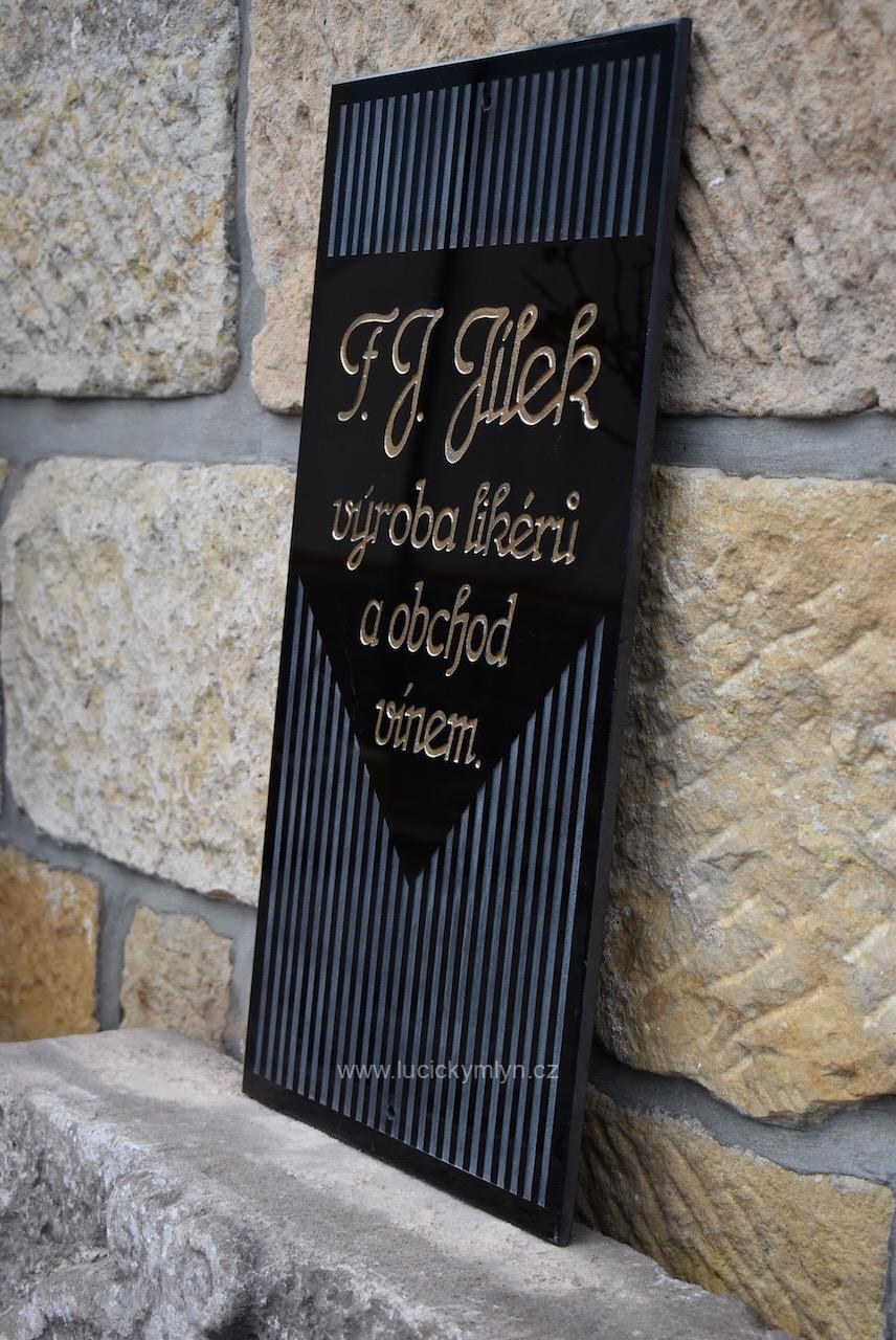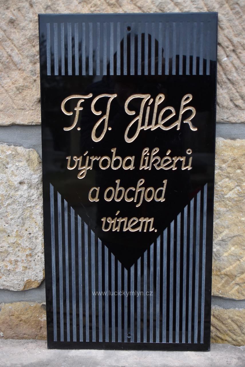 Silnější a dodnes nepoškozené reklamní označení sídla či provozovny má hluboce vybroušený a vyzlacený nápis se jménem F.J. JÍLEK na hladké centrální ploše. Nástěnná cedule byla vkusně oživena plošným páskovým rámováním, vertikálně vedeného brusu s efektní trojúhelnou centrální plochou. Silné obdélníkové sklo má v krajích otvory pro připevnění za pomoci vrutů s pohledovými krytkami. Asi stoletá, sběratelská či muzejní, starožitná cedule se zachovala bez poškození.