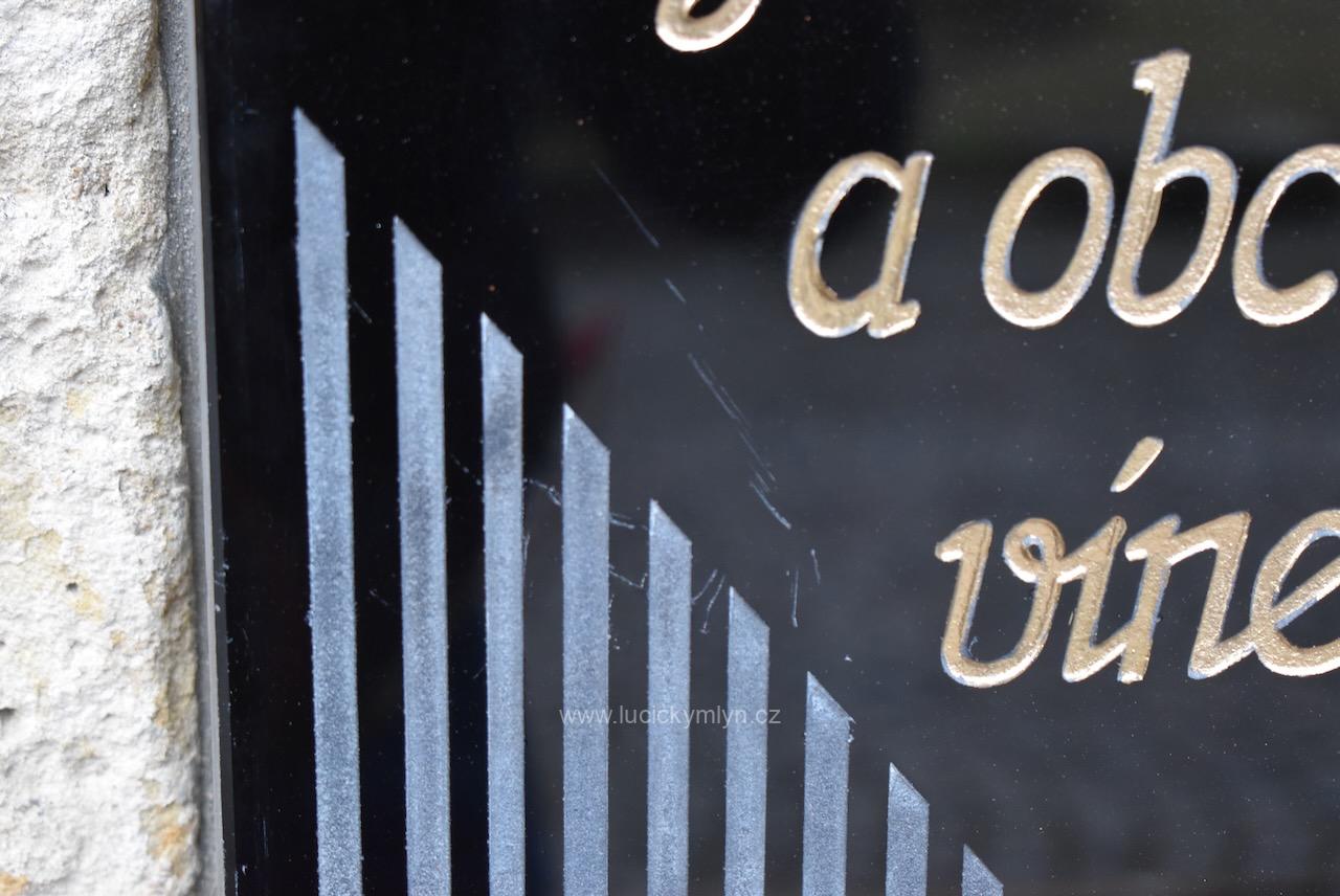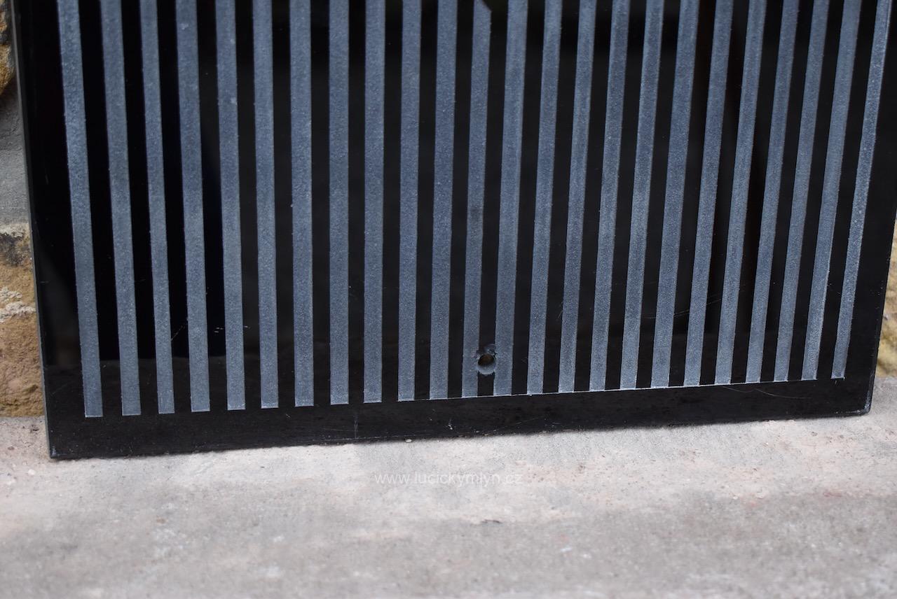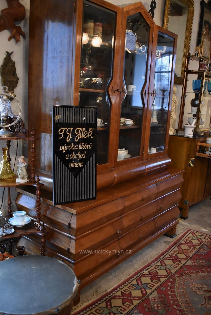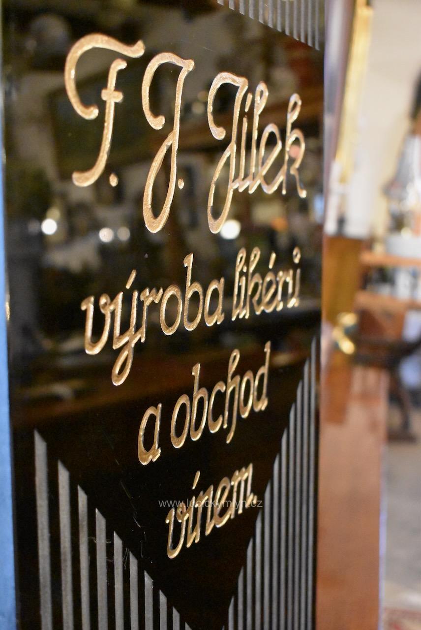 Starožitná reklamní cedule F.J. Jílek výroba likérů a obchod s vínem – originální předmět ve stylu ART-DECO z černého broušeného opaxitového skla
