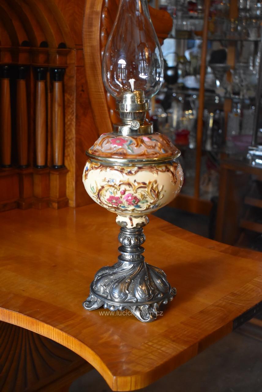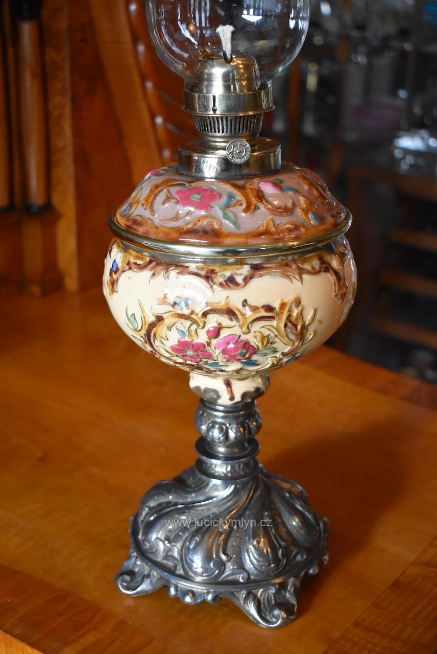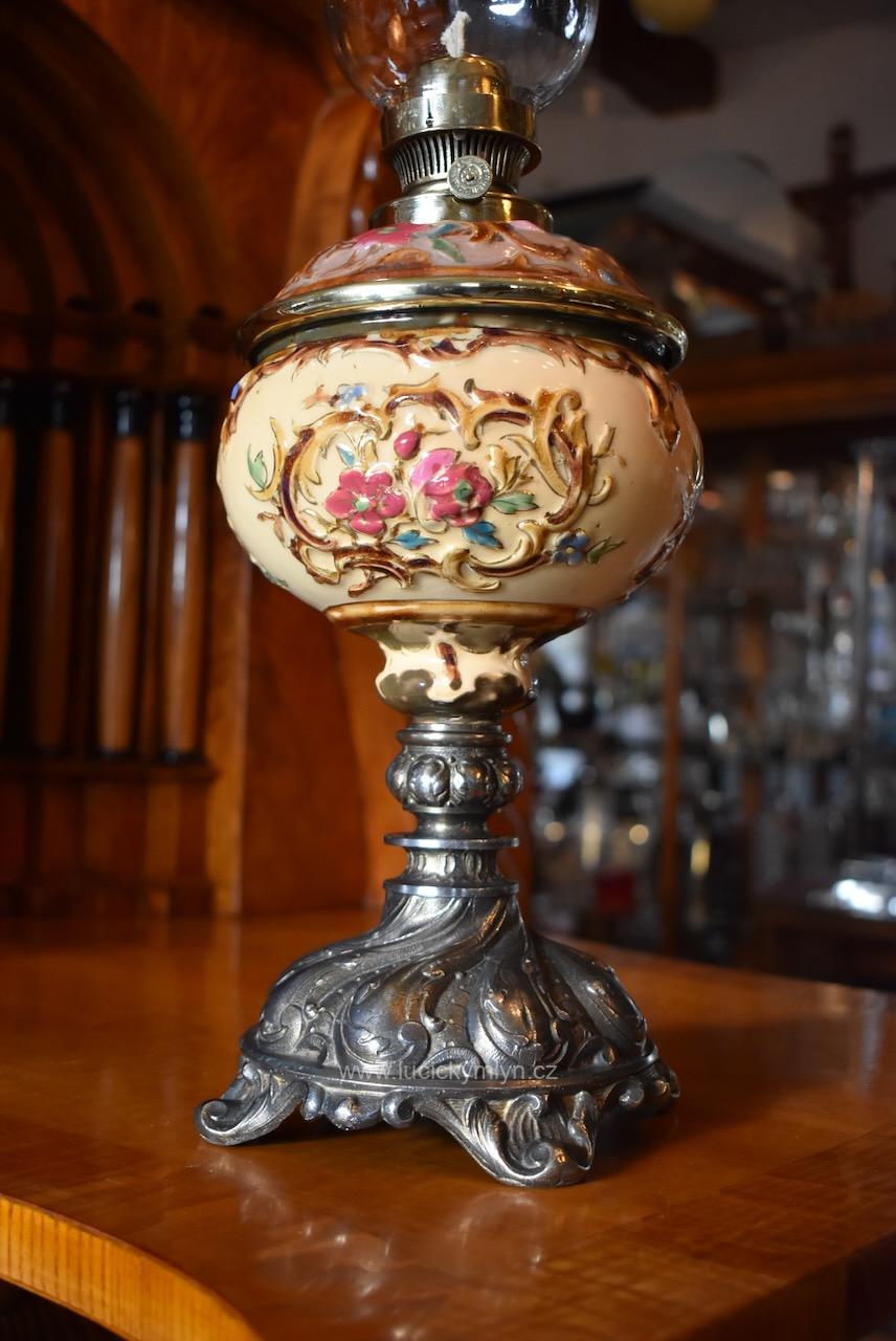 Starožitná měšťanská secesní petrolejová stolní lampa s okrasnou nádobkou plasticky ztvárněnou z pestře zdobené a ručně malované majoliky usazená na soustružené a bohatě ztvárněné podstavě z cínové slitiny