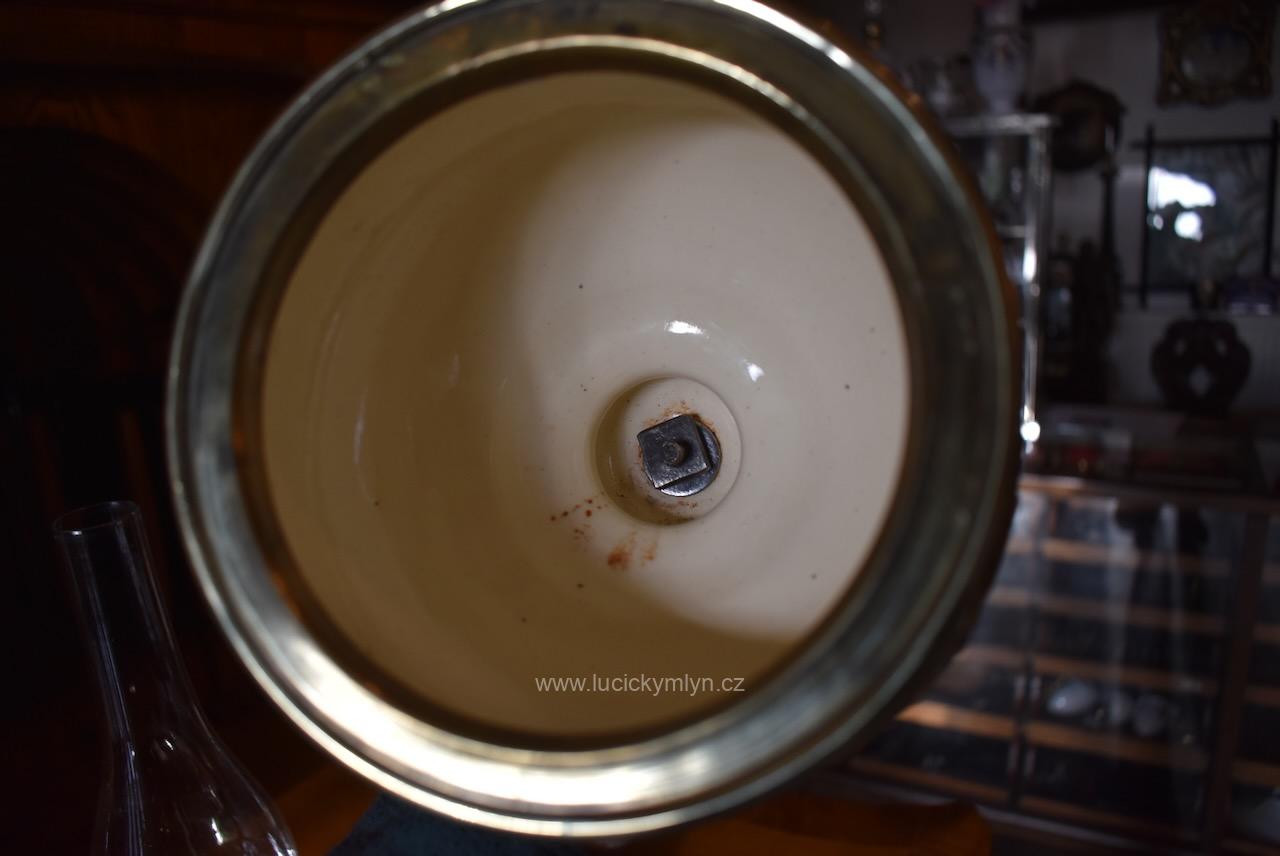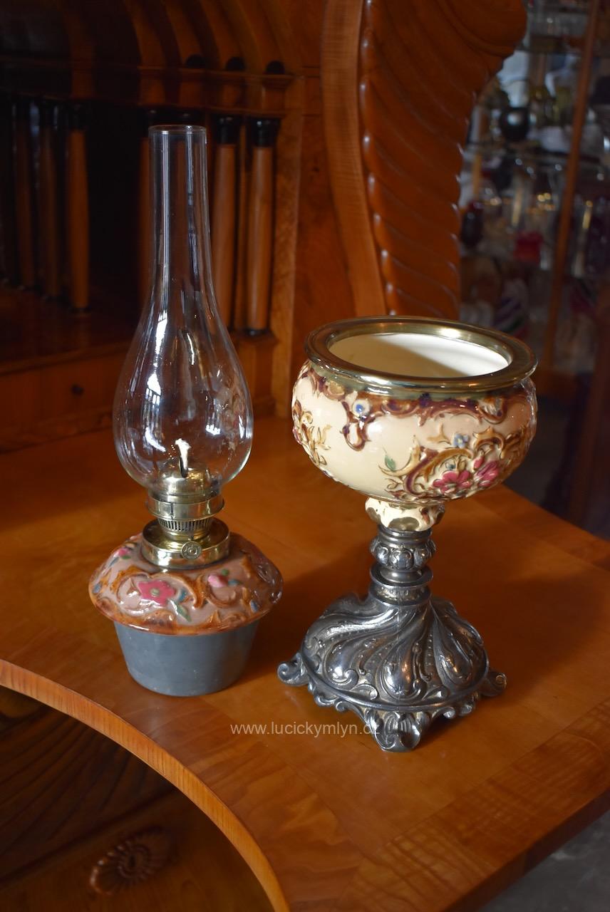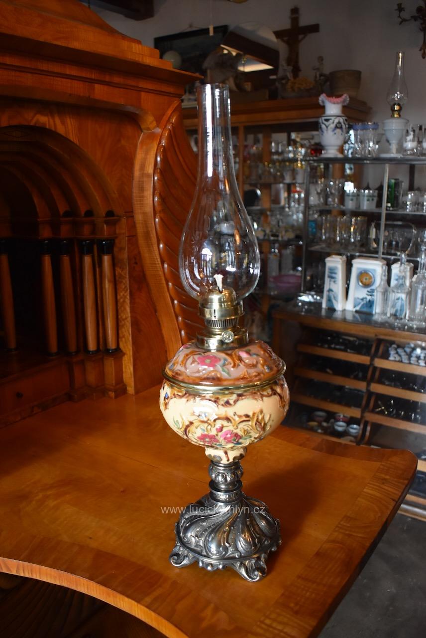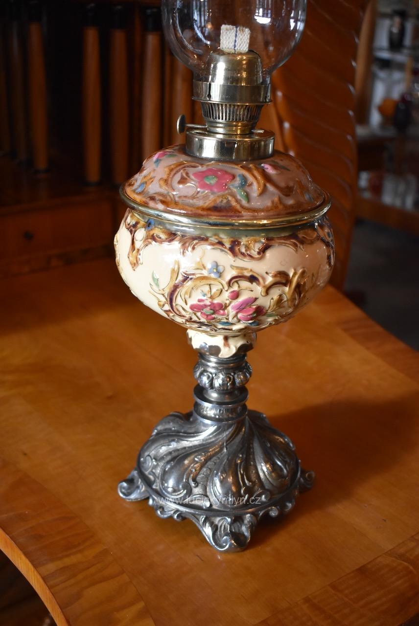 Starožitná měšťanská secesní petrolejová stolní lampa s okrasnou nádobkou plasticky ztvárněnou z pestře zdobené a ručně malované majoliky usazená na soustružené a bohatě ztvárněné podstavě z cínové slitiny