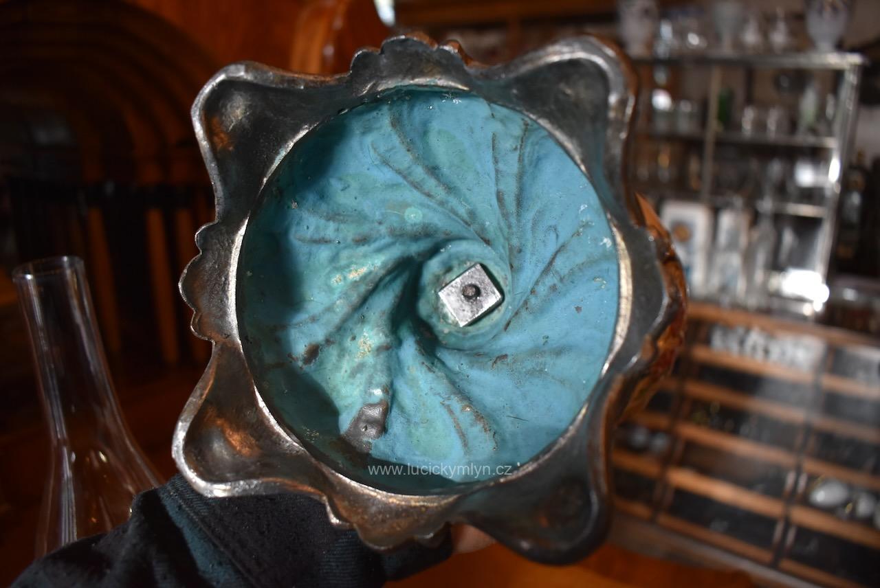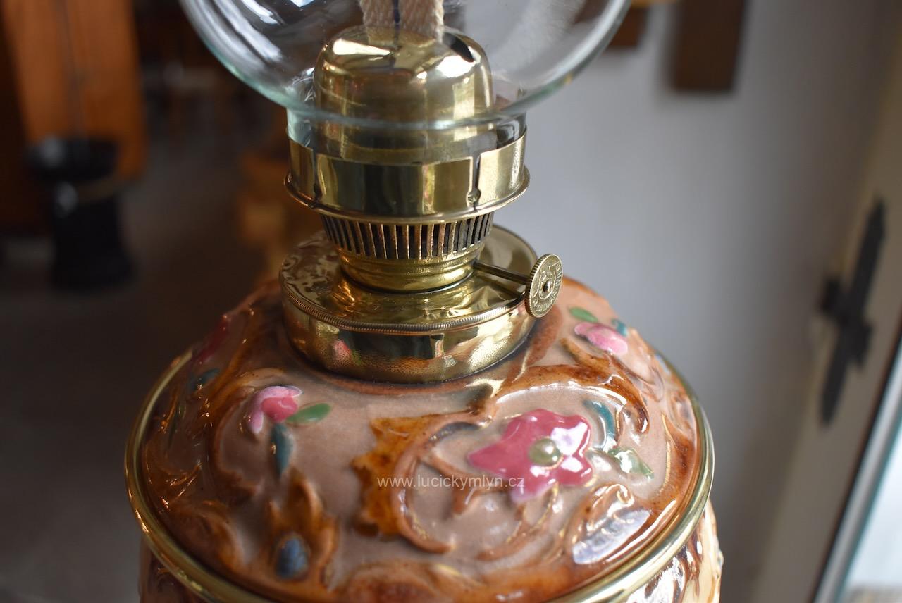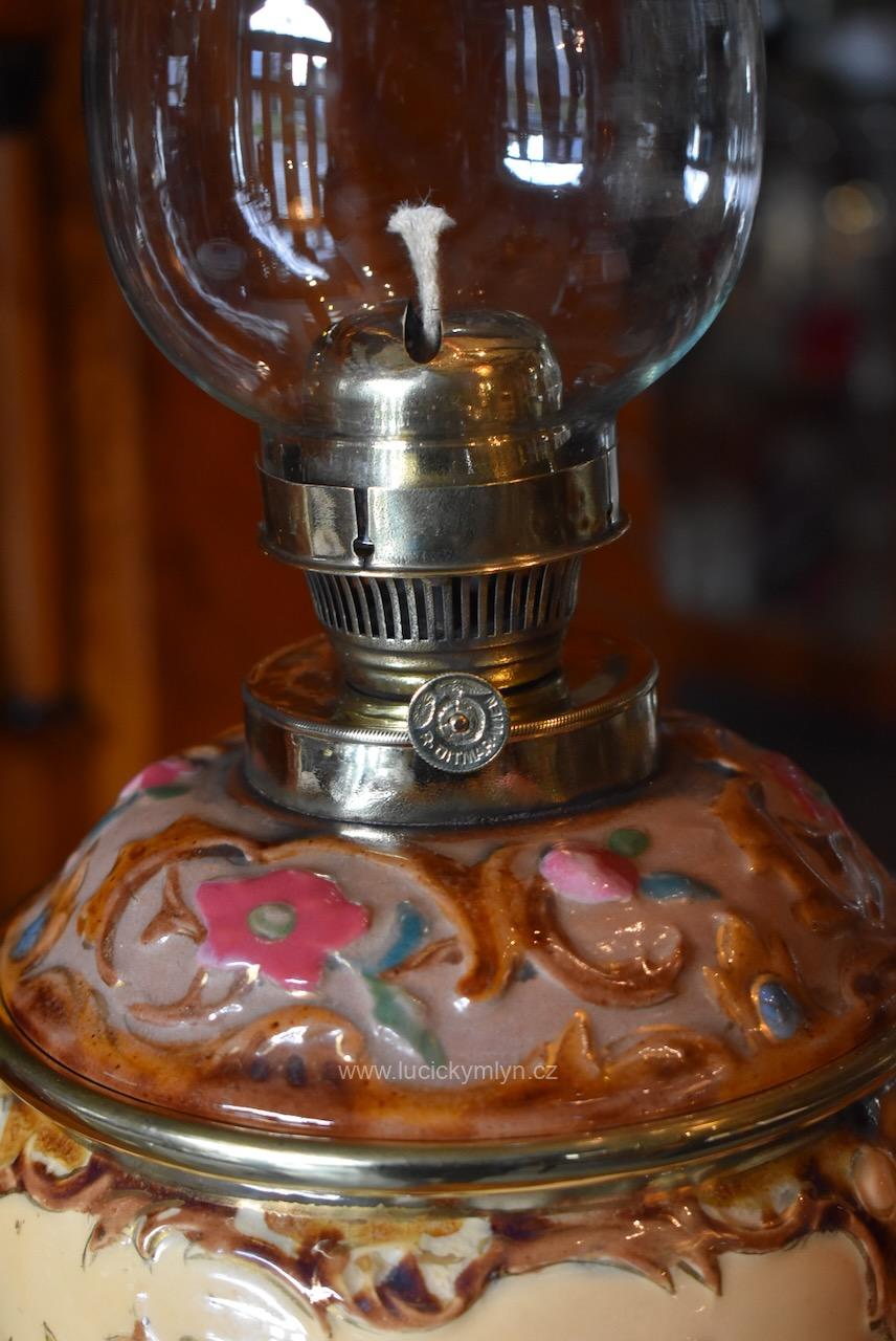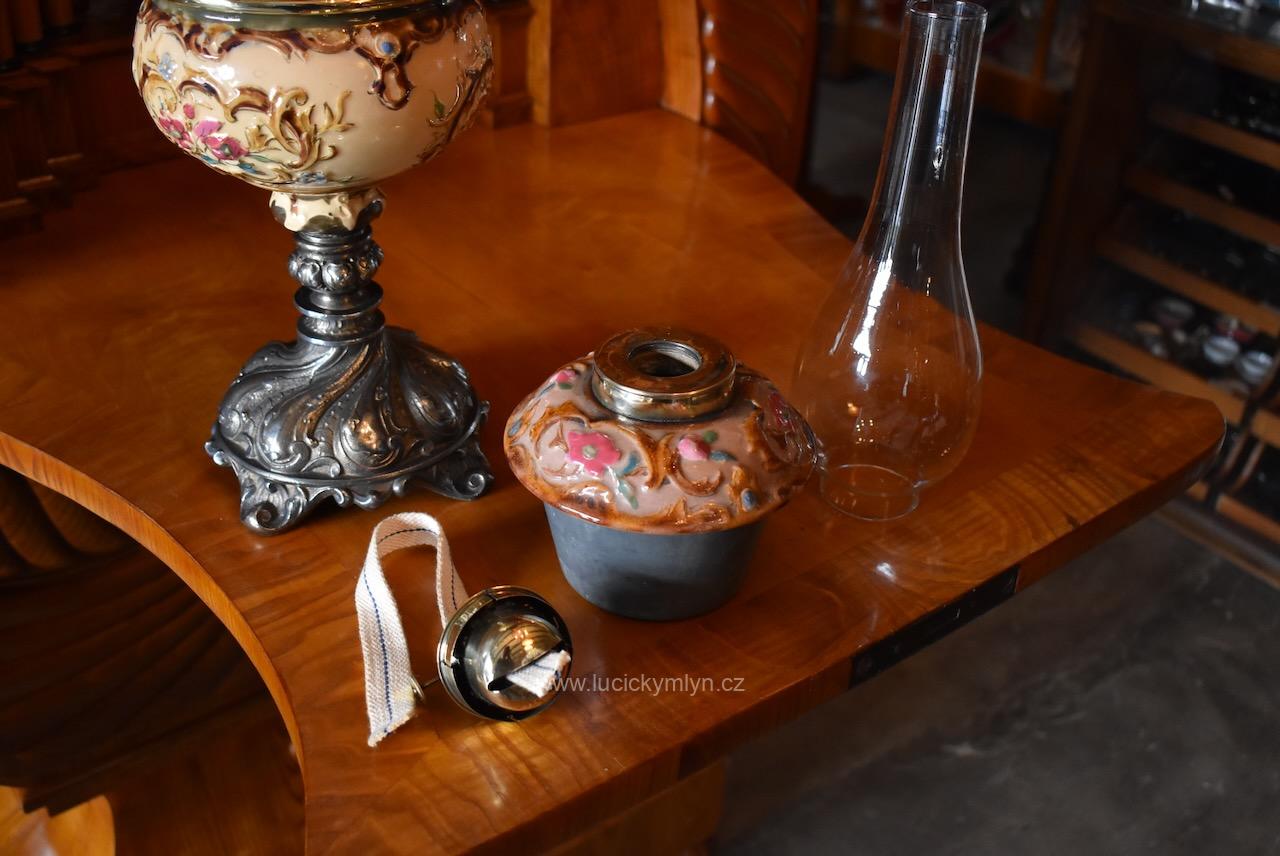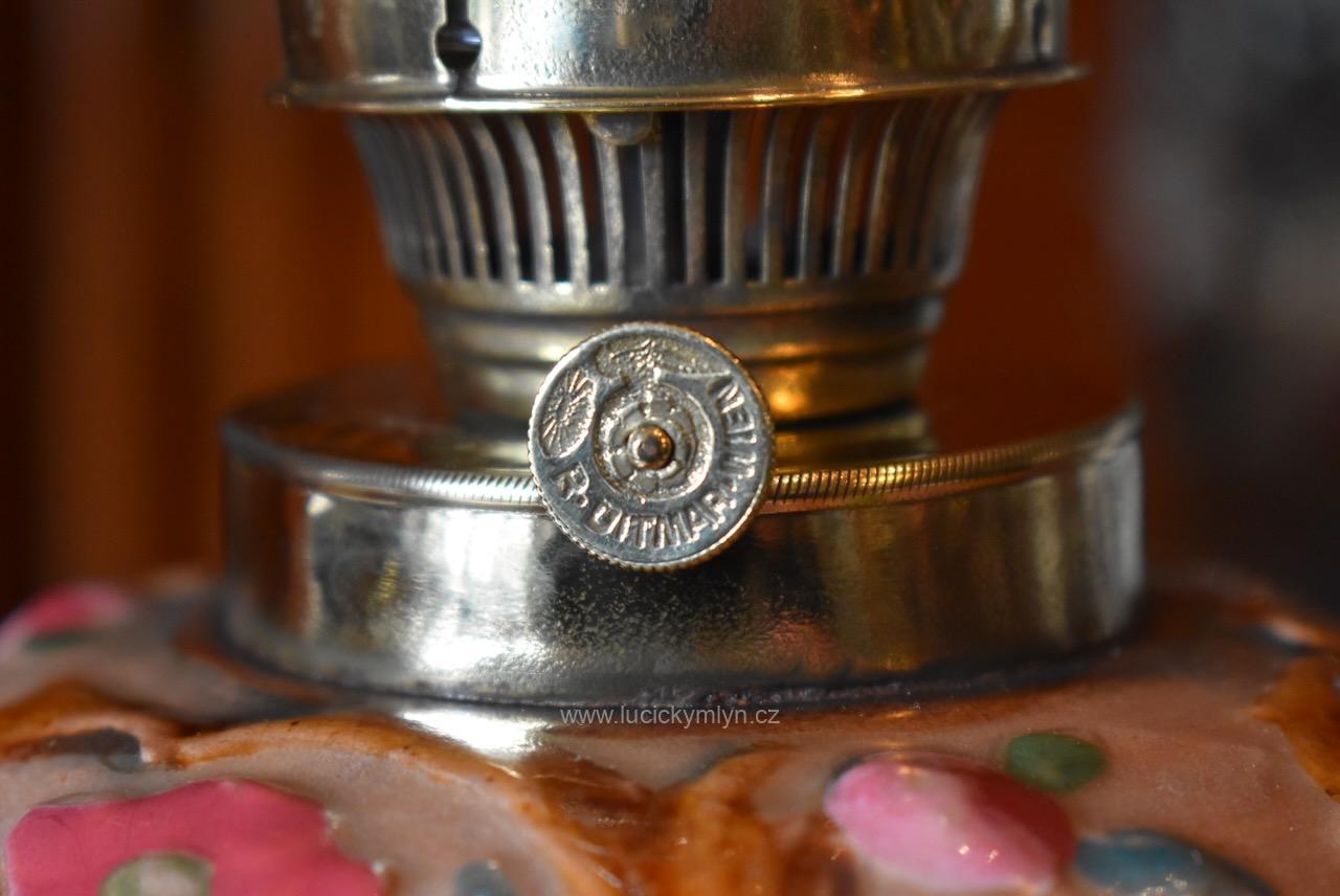 Honosná keramická nádoba s víčkem má tvar kalichu a dole úzký a téměř hladce modelovaný pas. Na oříškově světlém podkladu se lesknou světle vybarvené květy a rokokově i secesně stylizované rostlinné ornamenty. Bohatá výzdoba je umocněna kontrastním vybarvením i lesklou glazurou keramiky. Nádobka na olej z cínovaného plechu je upevněna ke spodní ploše lampového poklopu či víčka. Mosazný mechanismus pro posun knotu i přívod vzduchu, je precizně a velmi jemně prořezávaný a oživený tlačeným vzorem. Knotové kolečko je značeno tlačenou šesticípou hvězdou a označením výrobce – Ditmar WIEN. V přítlačných pacičkách je upevněn komínový cylindr z čirého skla. Velmi hezká starožitná lampa působivě okrášlená secesně-rokokovým motivem je vhodná nejen k dekoraci nebo pro sběratele. Krásný předmět z přelomu 19. a 20. stol. se zachoval v původním velmi dobrém stavu. Nyní je po vyčištění a pečlivé renovaci zcela funkční.
