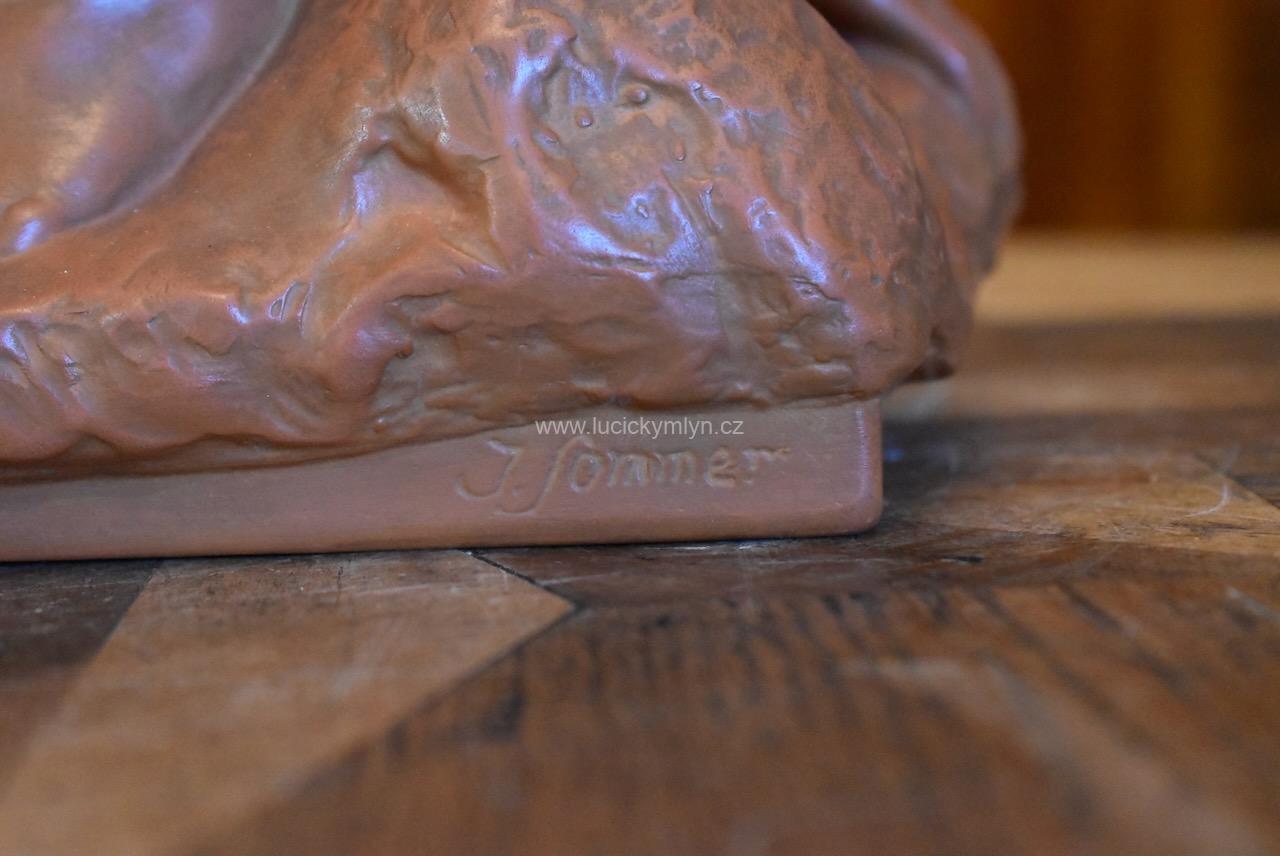 Starožitná keramická soška ženy s vinným hroznem – signováno J. Sommer, Bechyně
