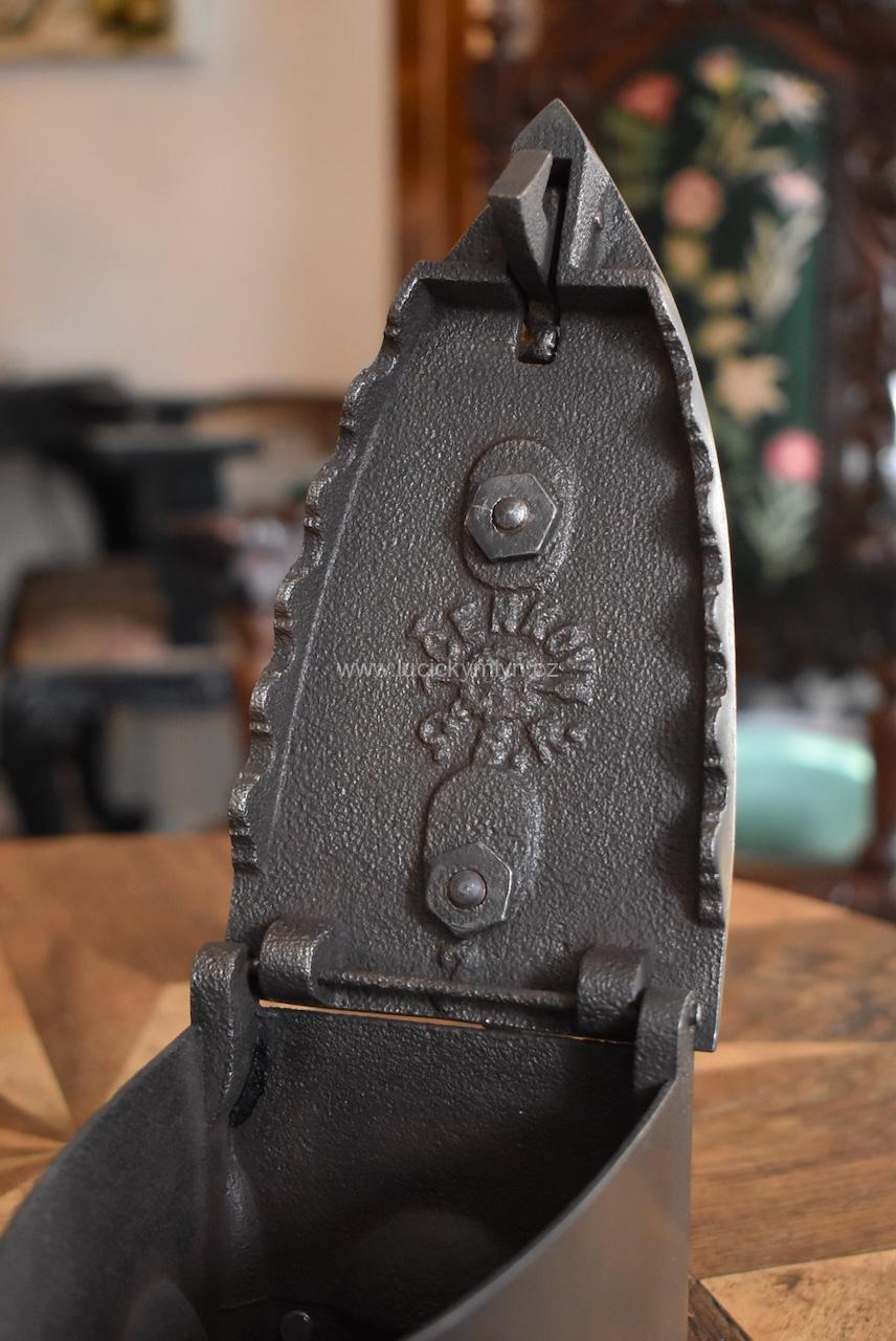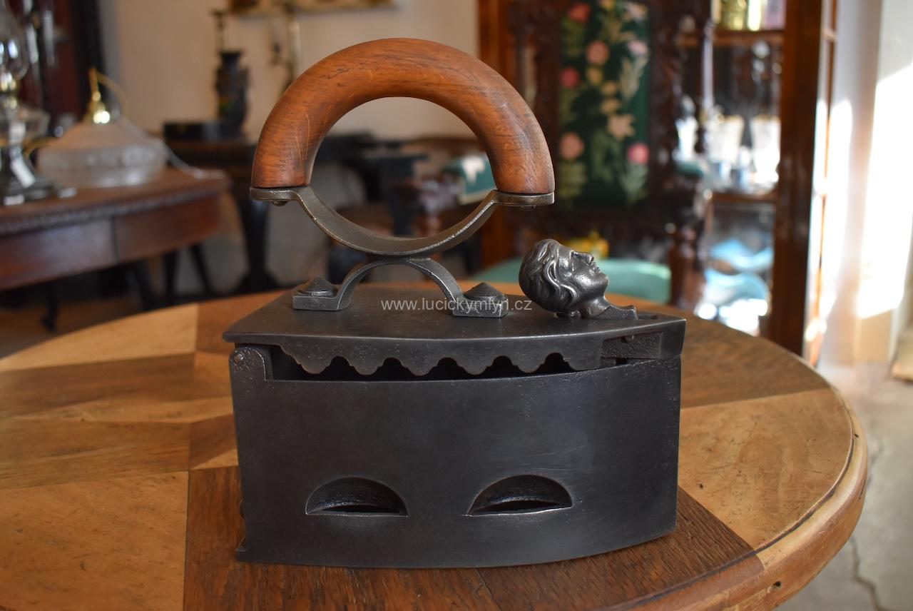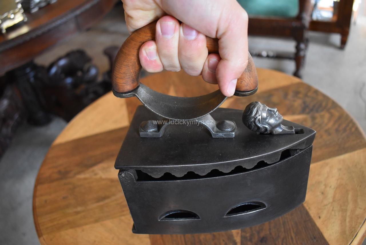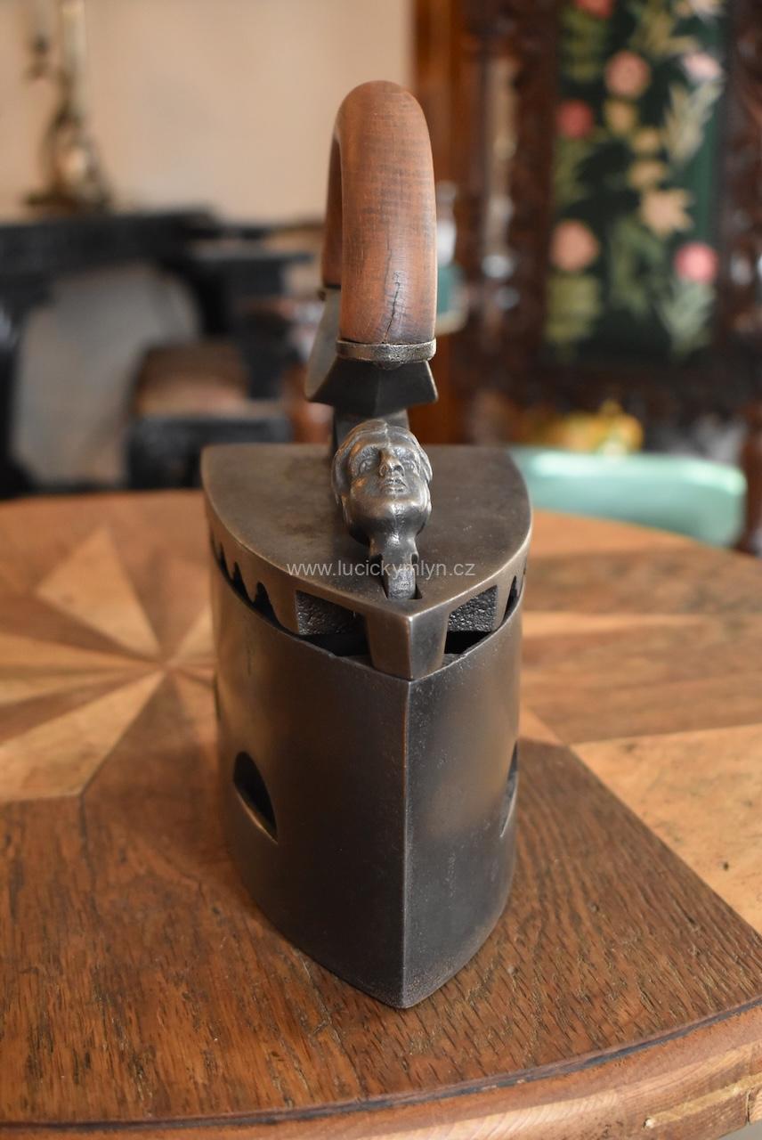 Tato sběratelsky zajímavá žehlička má zajišťovací mechanismus působivě ozdobený dílcem ve tvaru hlavičky. Po jejím naklopení dopředu se odjistí záklopná pojistka a vrchní část žehličky se odklopí. Jako palivo pro rozpálení této žehličky se používalo dřevěné uhlí. Po uvedení do provozu, stoupaly horké plyny vzhůru horními bočními otvory, a proto je obloukové držadlo z tvrdého bukového dřeva upevněné na zvýšené elegantní konzoli ve tvaru x. Tento originální předmět ze 3. čtvrtiny 19. století se zachoval v původním, velmi dobrém stavu a bez poškození. Starožitná žehlička je vhodná pro sběratele i muzejní sbírky. Nyní je tato hezká dekorace po vyčištění a celkové renovaci.