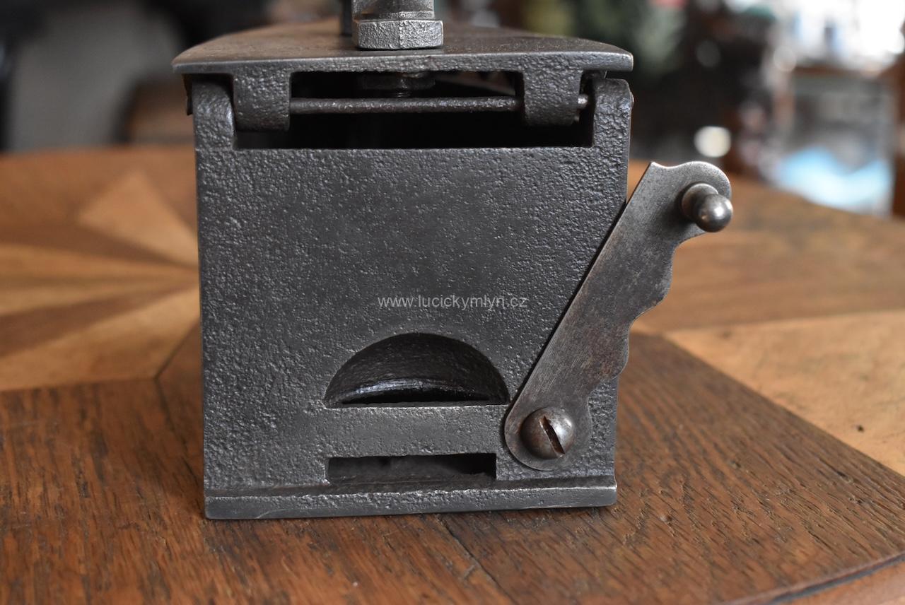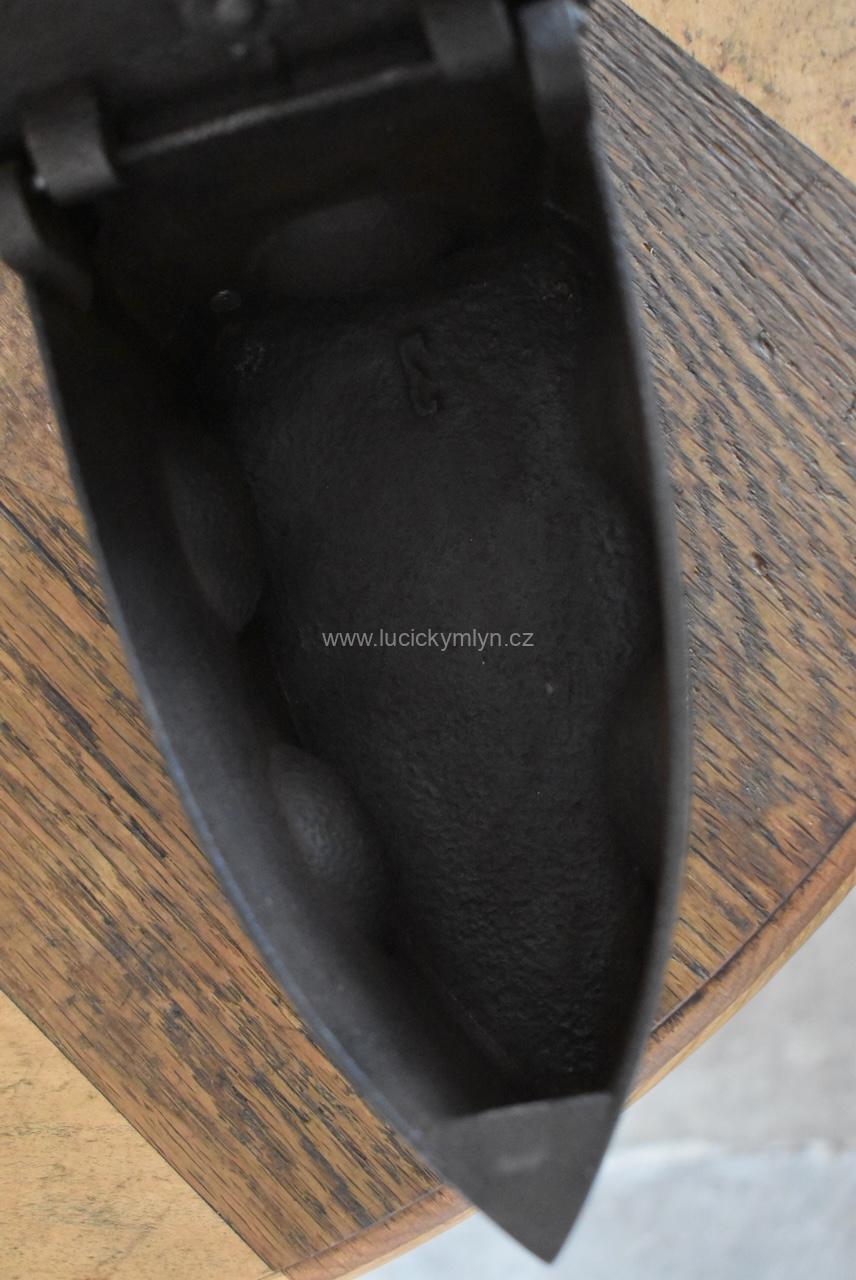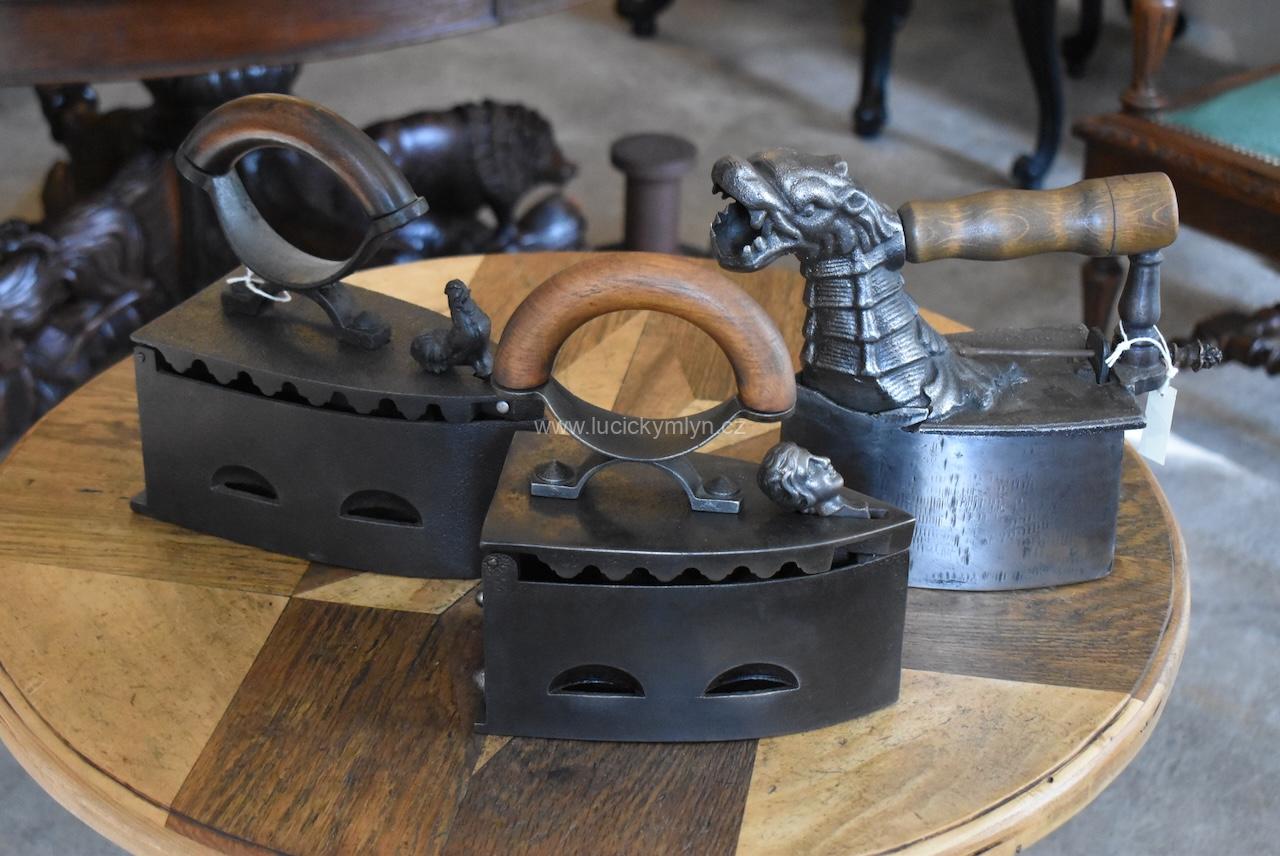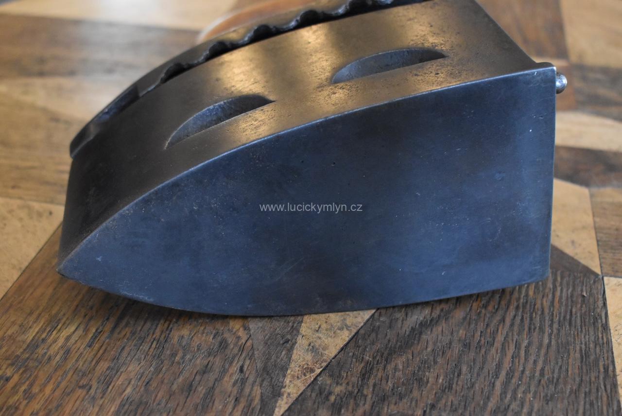 Tato sběratelsky zajímavá žehlička má zajišťovací mechanismus působivě ozdobený dílcem ve tvaru hlavičky. Po jejím naklopení dopředu se odjistí záklopná pojistka a vrchní část žehličky se odklopí. Jako palivo pro rozpálení této žehličky se používalo dřevěné uhlí. Po uvedení do provozu, stoupaly horké plyny vzhůru horními bočními otvory, a proto je obloukové držadlo z tvrdého bukového dřeva upevněné na zvýšené elegantní konzoli ve tvaru x. Tento originální předmět ze 3. čtvrtiny 19. století se zachoval v původním, velmi dobrém stavu a bez poškození. Starožitná žehlička je vhodná pro sběratele i muzejní sbírky. Nyní je tato hezká dekorace po vyčištění a celkové renovaci.