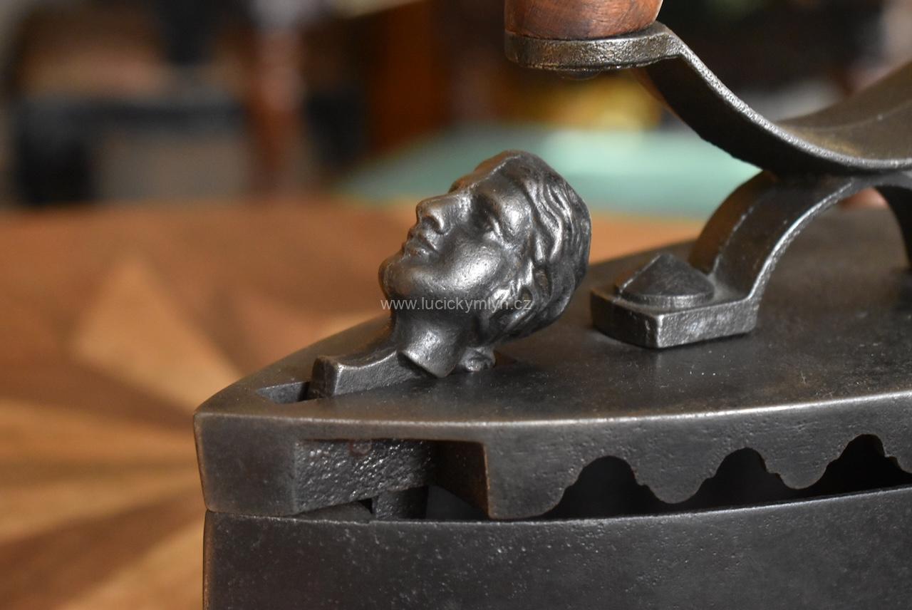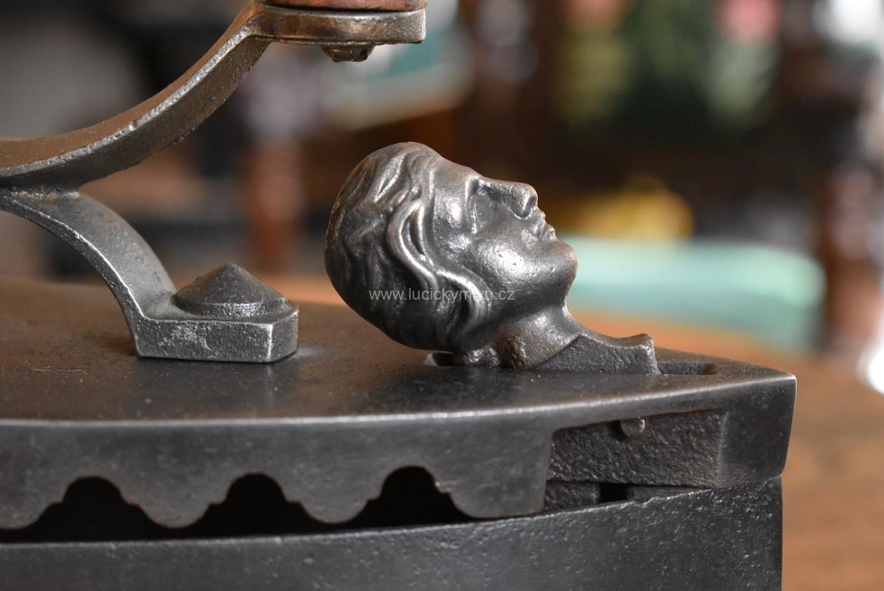 Starožitná žehlička z umělecké litiny na dřevěné uhlí zvaná „parník” ojediněle oživená hlavičkou dlouhovlasého idola