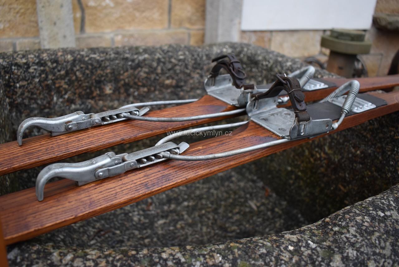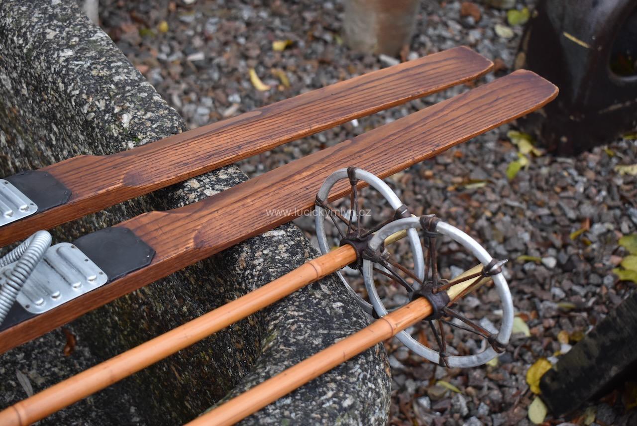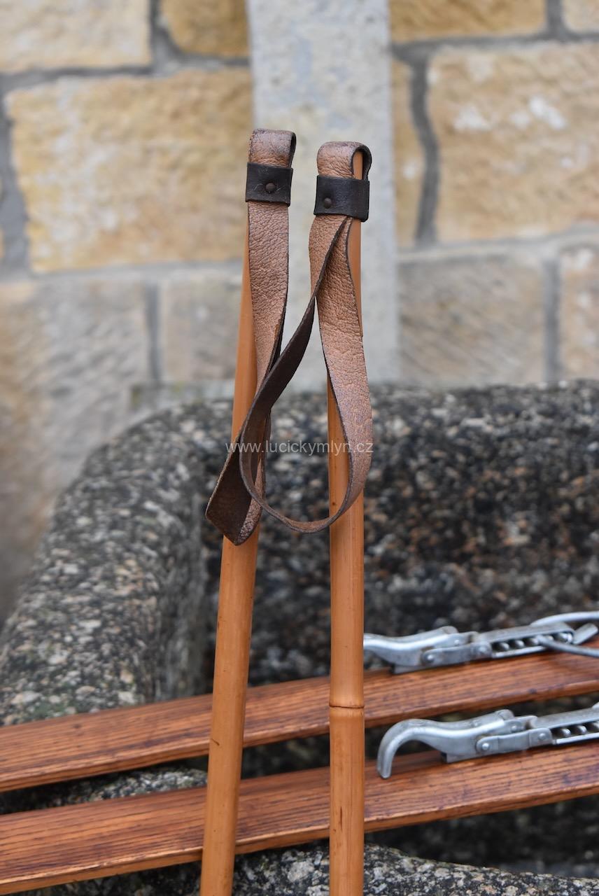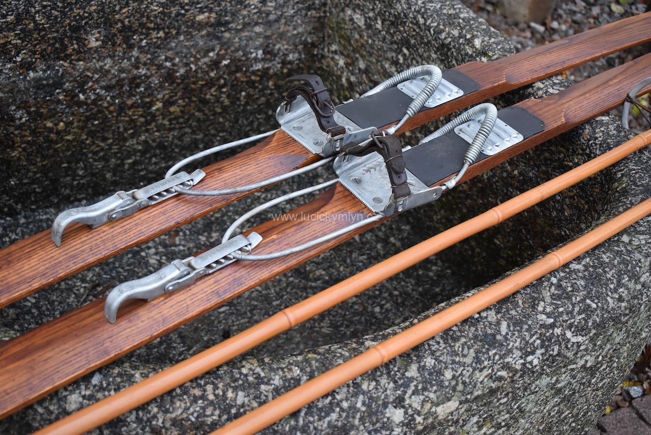 Starožitné lyže z pařeného jasanu s vázáním Massag Kandahar, Blesk KTN made in Czechoslovakia i s hůlkami