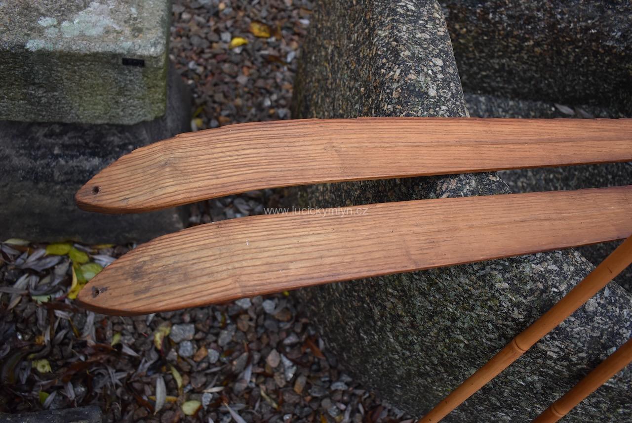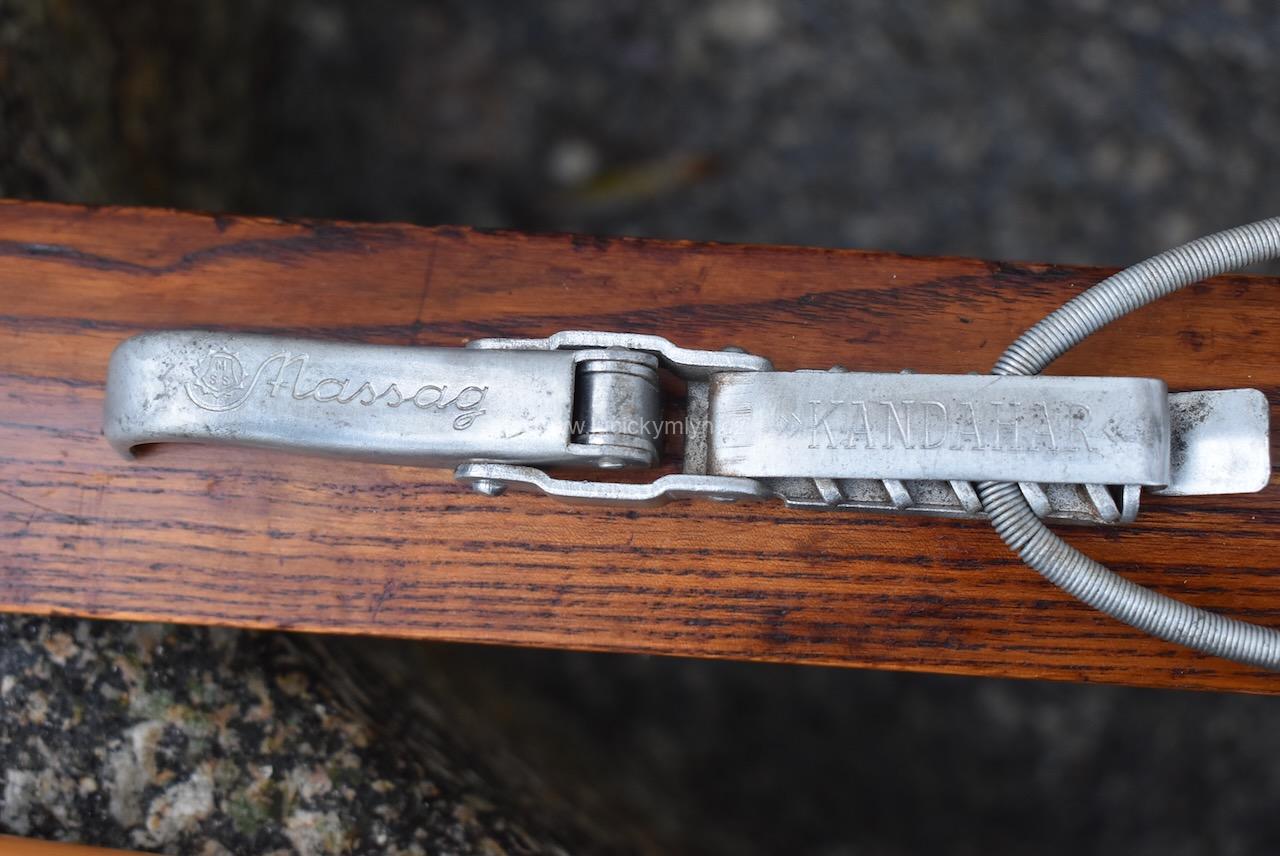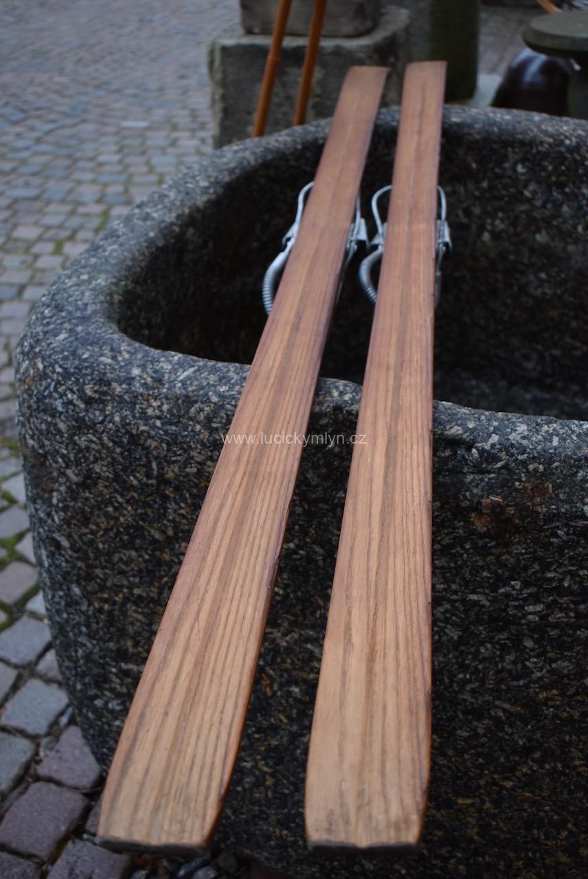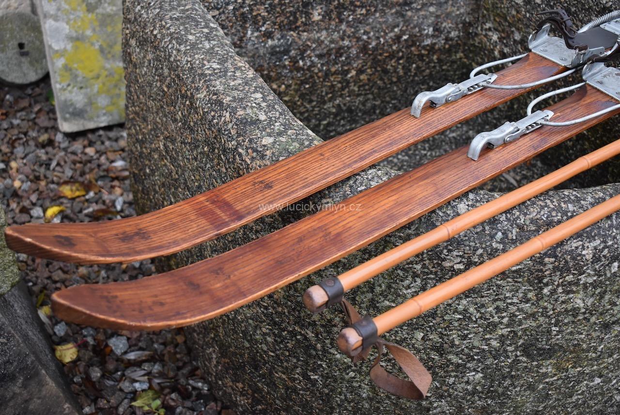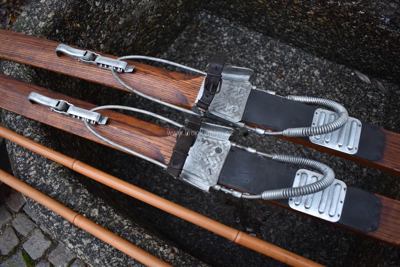 Starožitné lyže z pařeného jasanu s vázáním Massag Kandahar, Blesk KTN made in Czechoslovakia i s hůlkami