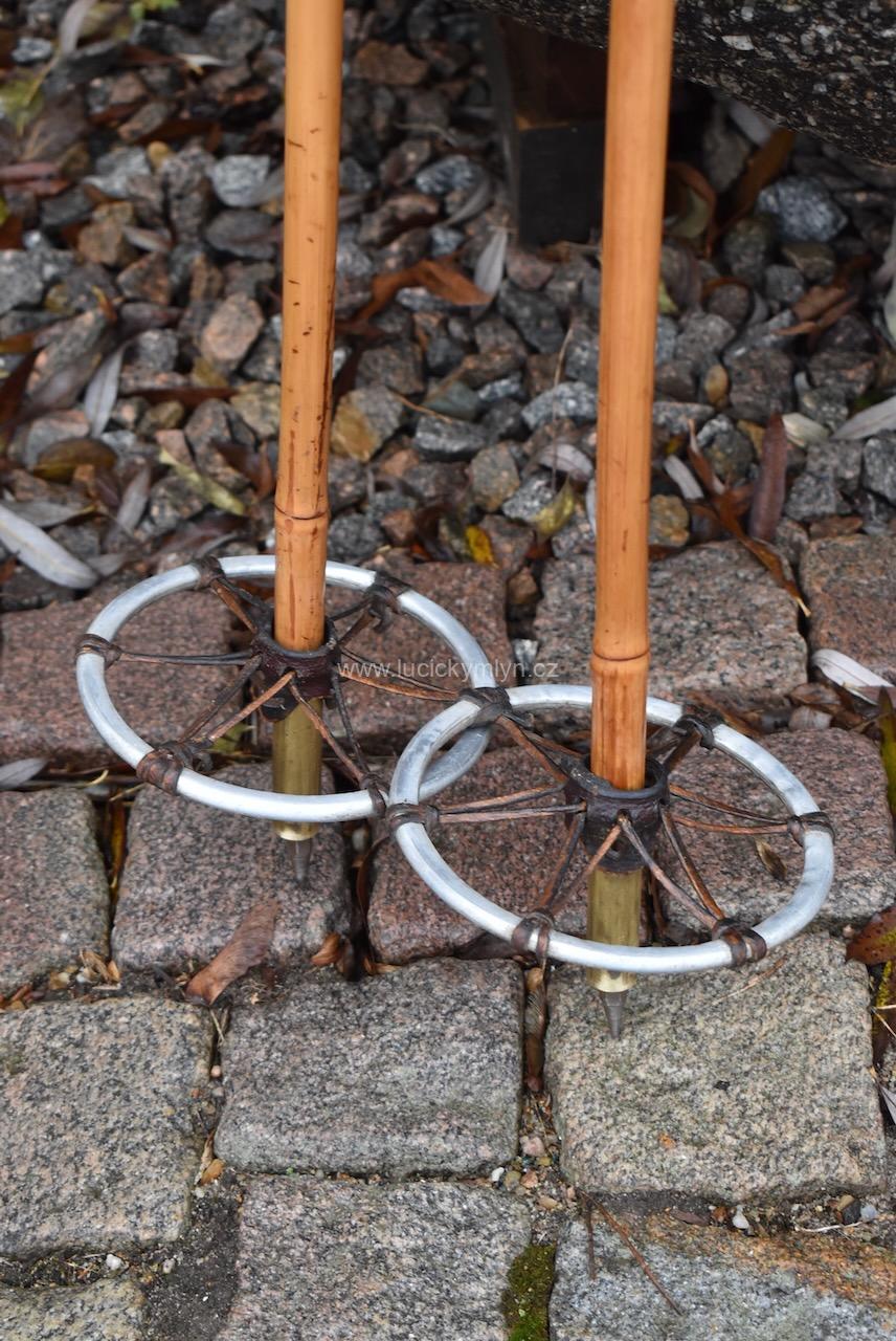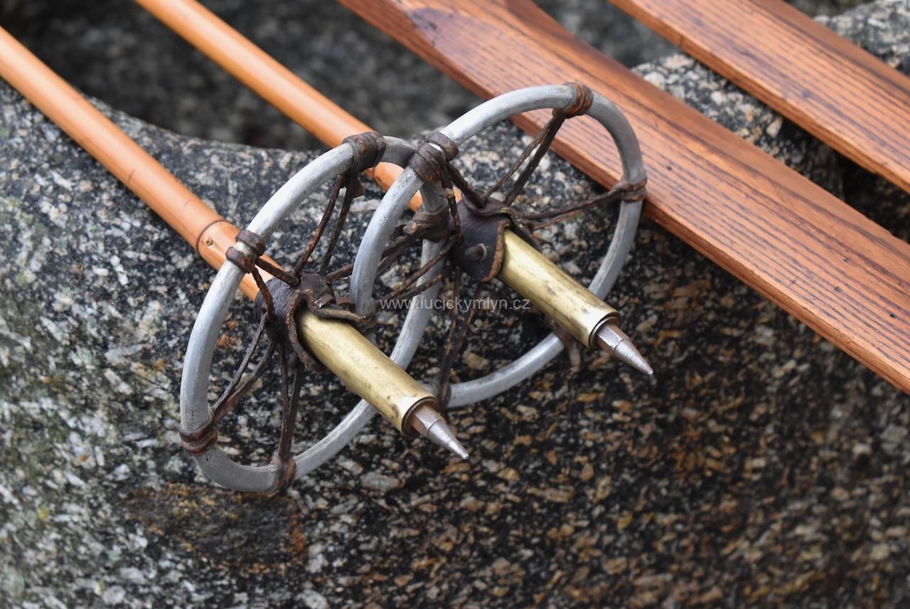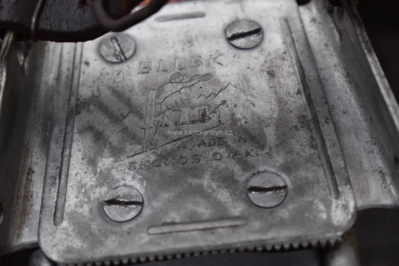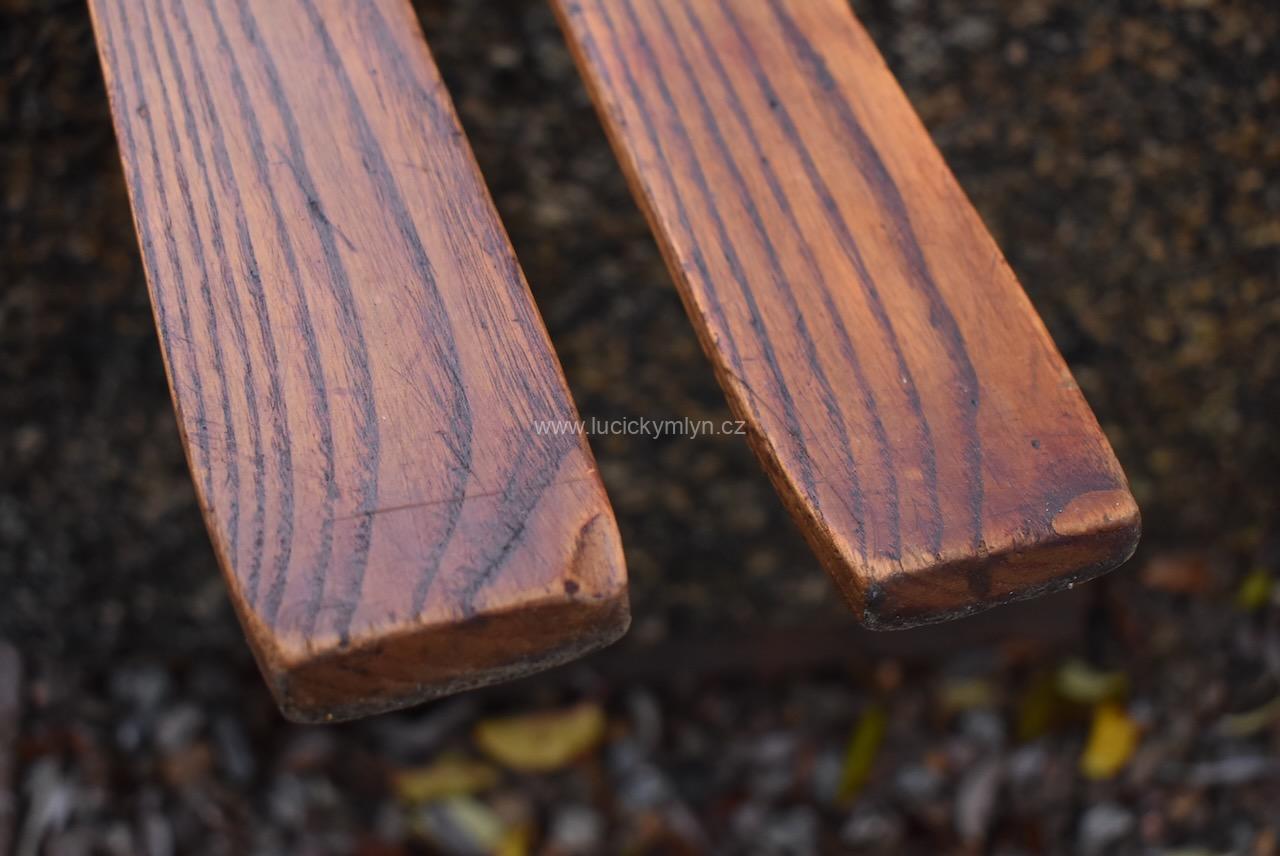 Starožitné lyže z pařeného jasanu s vázáním Massag Kandahar, Blesk KTN made in Czechoslovakia i s hůlkami