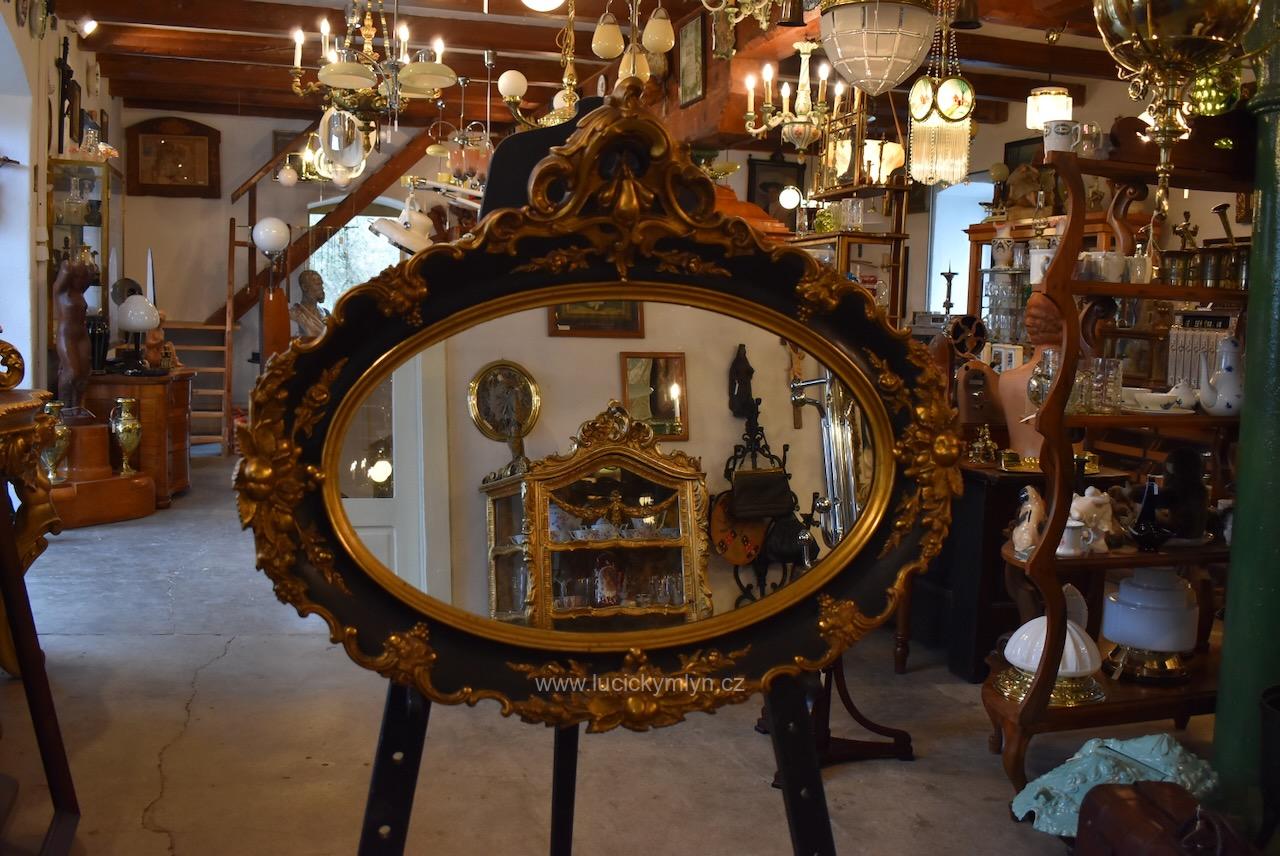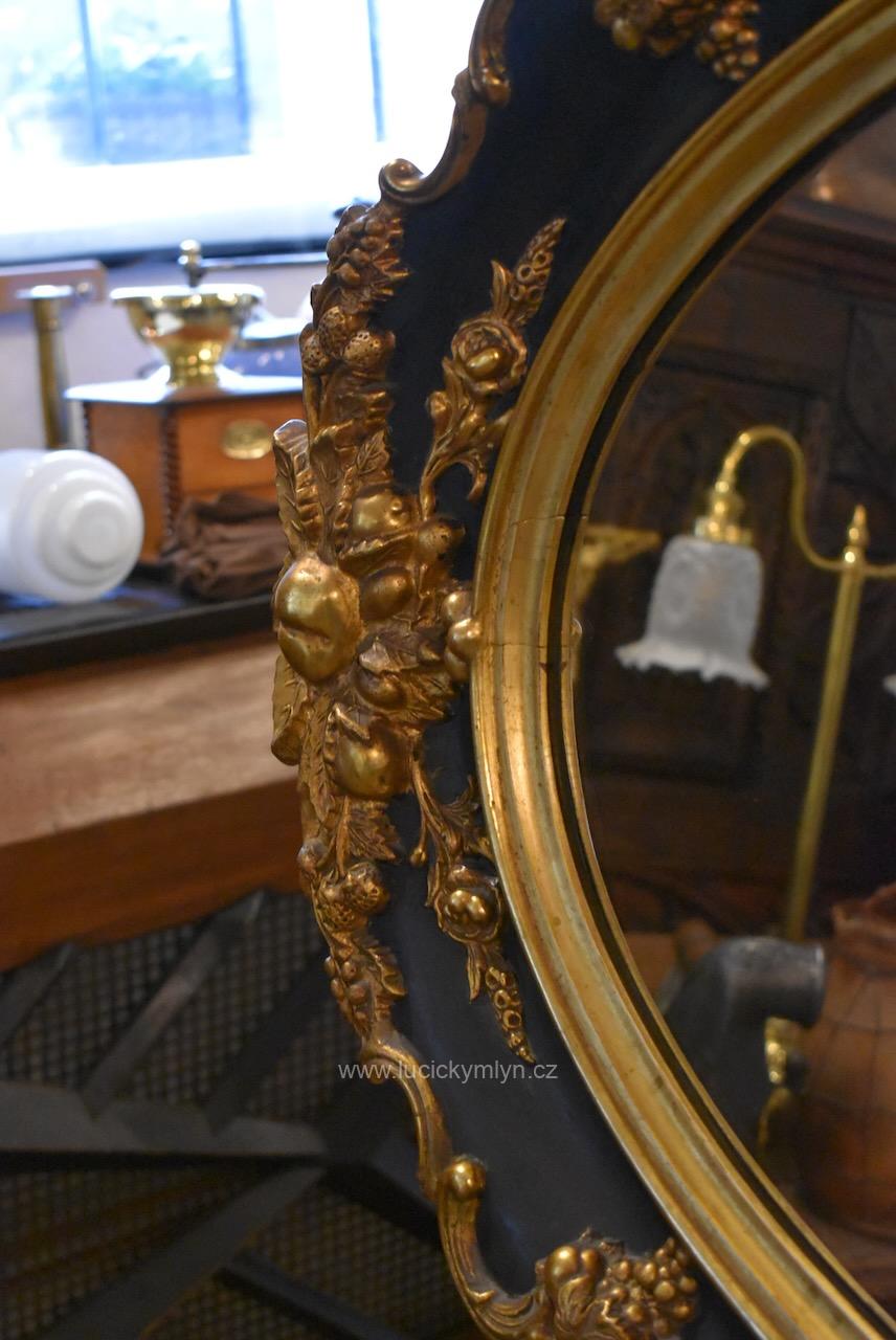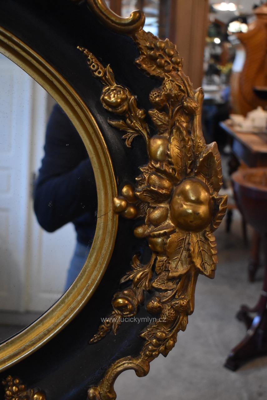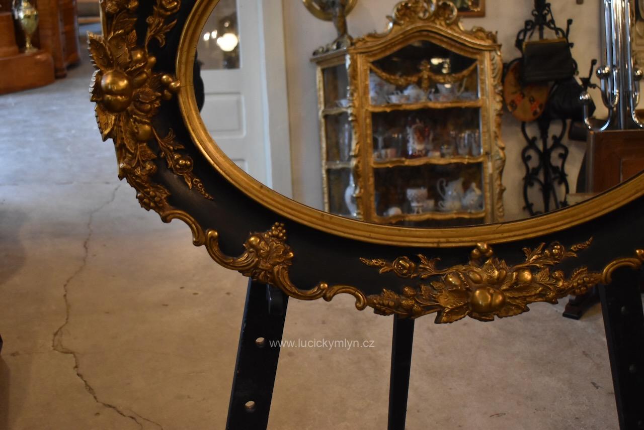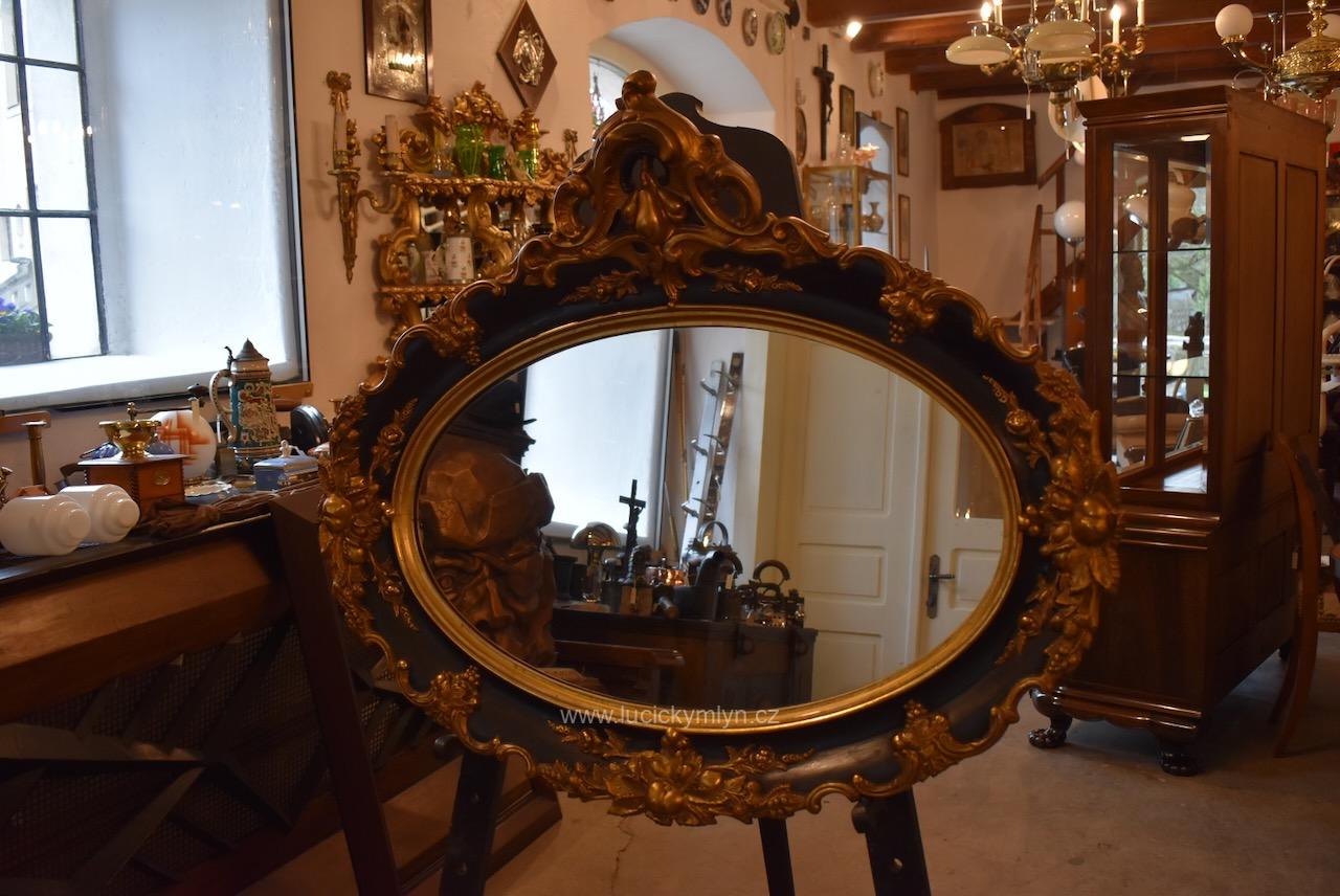 Reprezentativní zrcadlo má masivní, dřevěný, oválně tvarovaný rám se široce profilovanou a bohatě plasticky zdobenou lištou, jejíž hladká plocha je černě lakovaná a plastická obvodová výzdoba včetně vrchní řezby je opatřená temným zlacením. Robustní oválný rám je bohatě okrášlený zlacenými plastickými ornamenty – volutami, květinovými festony a centrálními kartušemi nahoře i dole. Vnitřní profil okolo zrcadloviny je zvýrazněn hladkým zlaceným prstencem, zadní strana je tradičně chráněna přibitými prkénky, takže jde o poctivé truhlářsko-řezbářské a též štukatérsky zdařilé řemeslo ze závěru 19. či počátku 20. století. Honosný starožitný zrcadlový rám je po částečné renovaci i vyčištění a včetně původního zrcadla připraven k zavěšení v reprezentační hale, nad konzolový stolek či do ložnice, kde dodá prostoru romantický až zámecký charakter.