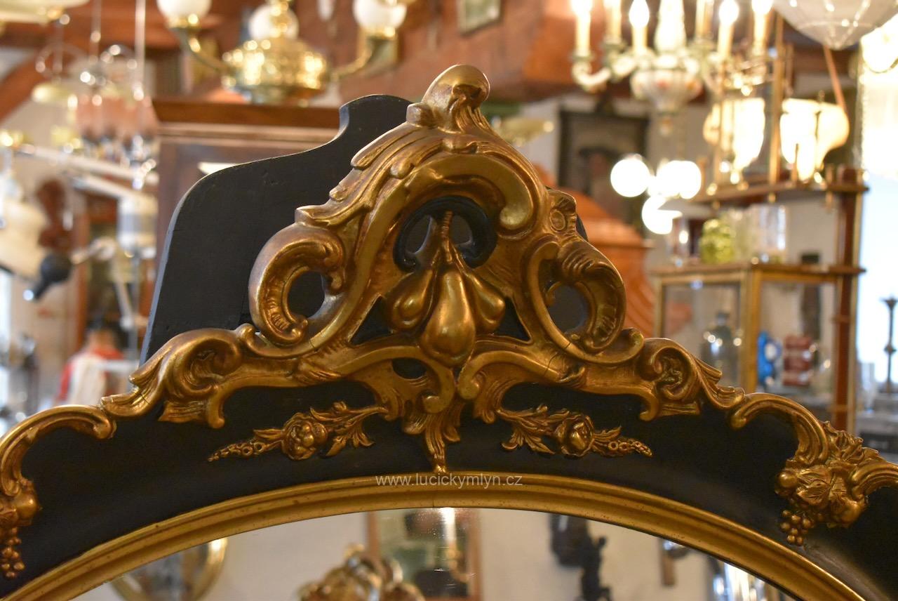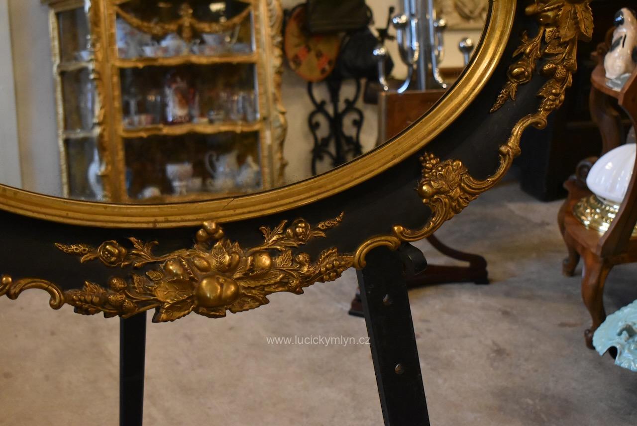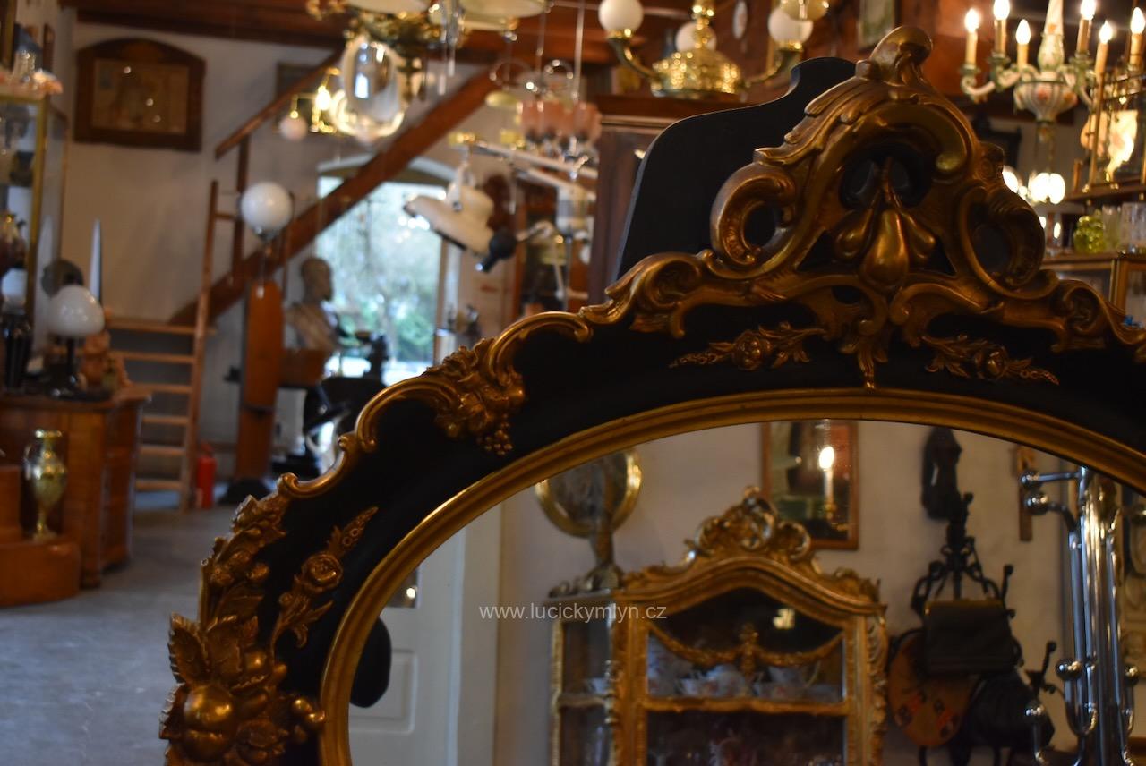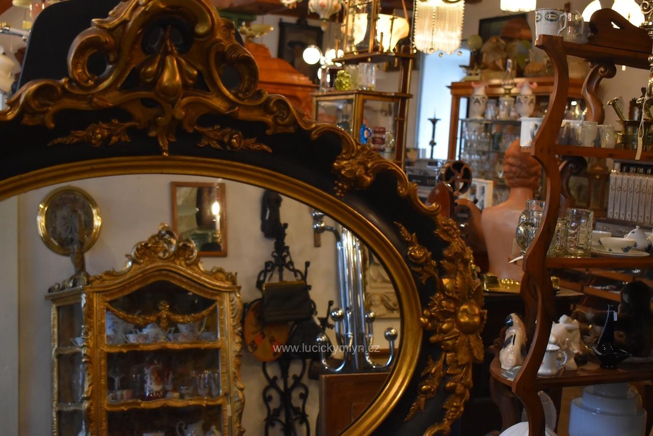 Reprezentativní zrcadlo má masivní, dřevěný, oválně tvarovaný rám se široce profilovanou a bohatě plasticky zdobenou lištou, jejíž hladká plocha je černě lakovaná a plastická obvodová výzdoba včetně vrchní řezby je opatřená temným zlacením. Robustní oválný rám je bohatě okrášlený zlacenými plastickými ornamenty – volutami, květinovými festony a centrálními kartušemi nahoře i dole. Vnitřní profil okolo zrcadloviny je zvýrazněn hladkým zlaceným prstencem, zadní strana je tradičně chráněna přibitými prkénky, takže jde o poctivé truhlářsko-řezbářské a též štukatérsky zdařilé řemeslo ze závěru 19. či počátku 20. století. Honosný starožitný zrcadlový rám je po částečné renovaci i vyčištění a včetně původního zrcadla připraven k zavěšení v reprezentační hale, nad konzolový stolek či do ložnice, kde dodá prostoru romantický až zámecký charakter.