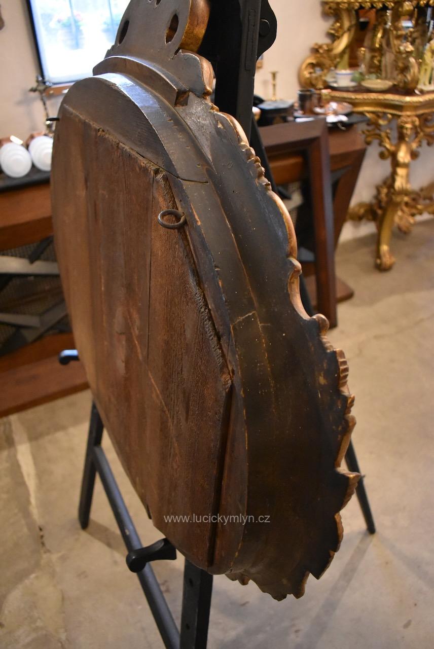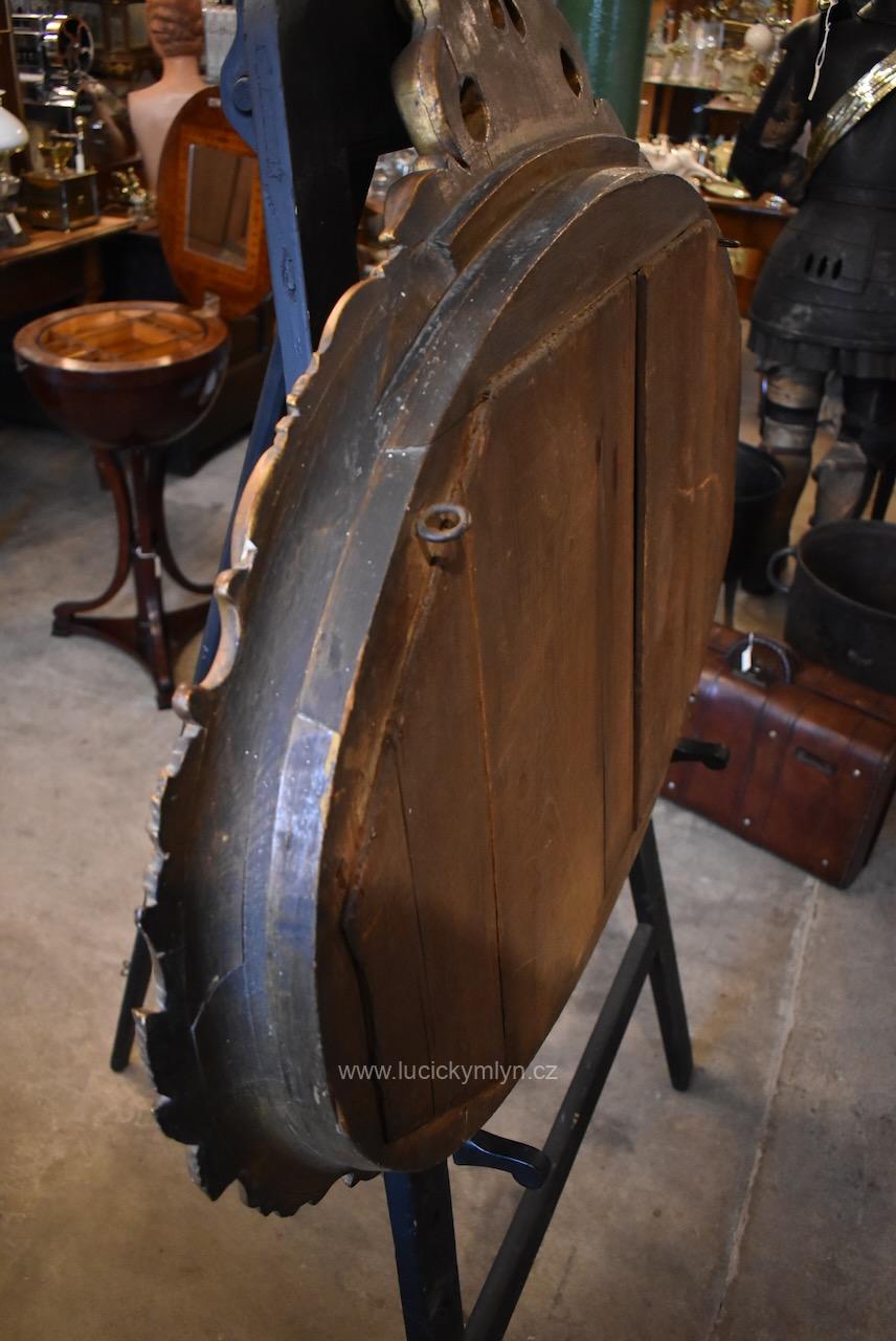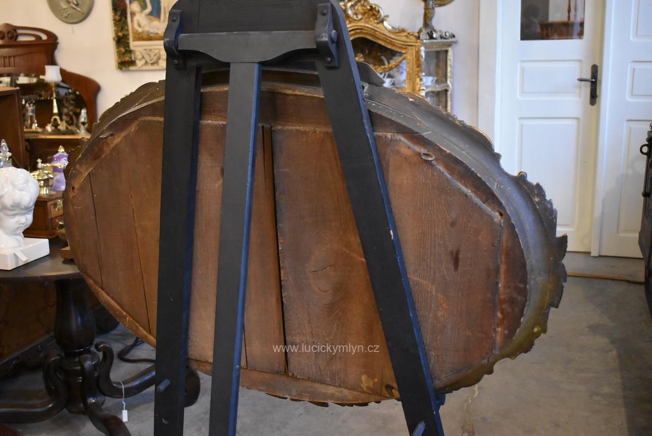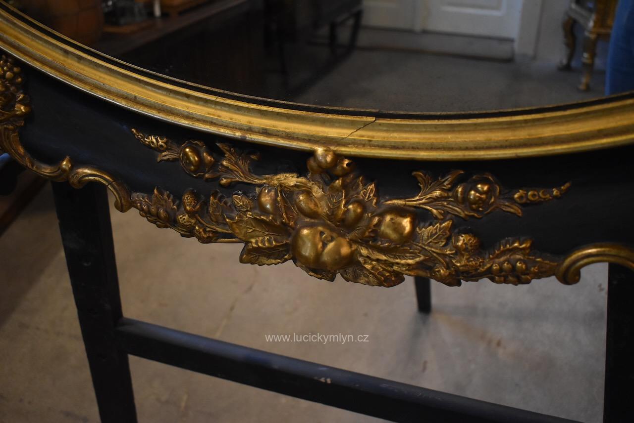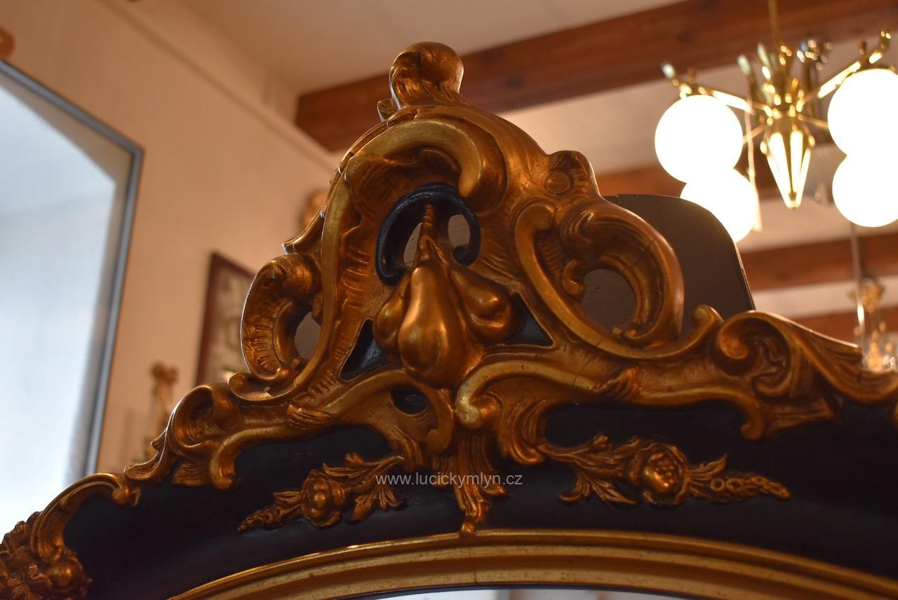 Reprezentativní zrcadlo má masivní, dřevěný, oválně tvarovaný rám se široce profilovanou a bohatě plasticky zdobenou lištou, jejíž hladká plocha je černě lakovaná a plastická obvodová výzdoba včetně vrchní řezby je opatřená temným zlacením. Robustní oválný rám je bohatě okrášlený zlacenými plastickými ornamenty – volutami, květinovými festony a centrálními kartušemi nahoře i dole. Vnitřní profil okolo zrcadloviny je zvýrazněn hladkým zlaceným prstencem, zadní strana je tradičně chráněna přibitými prkénky, takže jde o poctivé truhlářsko-řezbářské a též štukatérsky zdařilé řemeslo ze závěru 19. či počátku 20. století. Honosný starožitný zrcadlový rám je po částečné renovaci i vyčištění a včetně původního zrcadla připraven k zavěšení v reprezentační hale, nad konzolový stolek či do ložnice, kde dodá prostoru romantický až zámecký charakter.