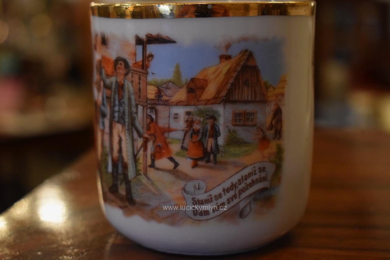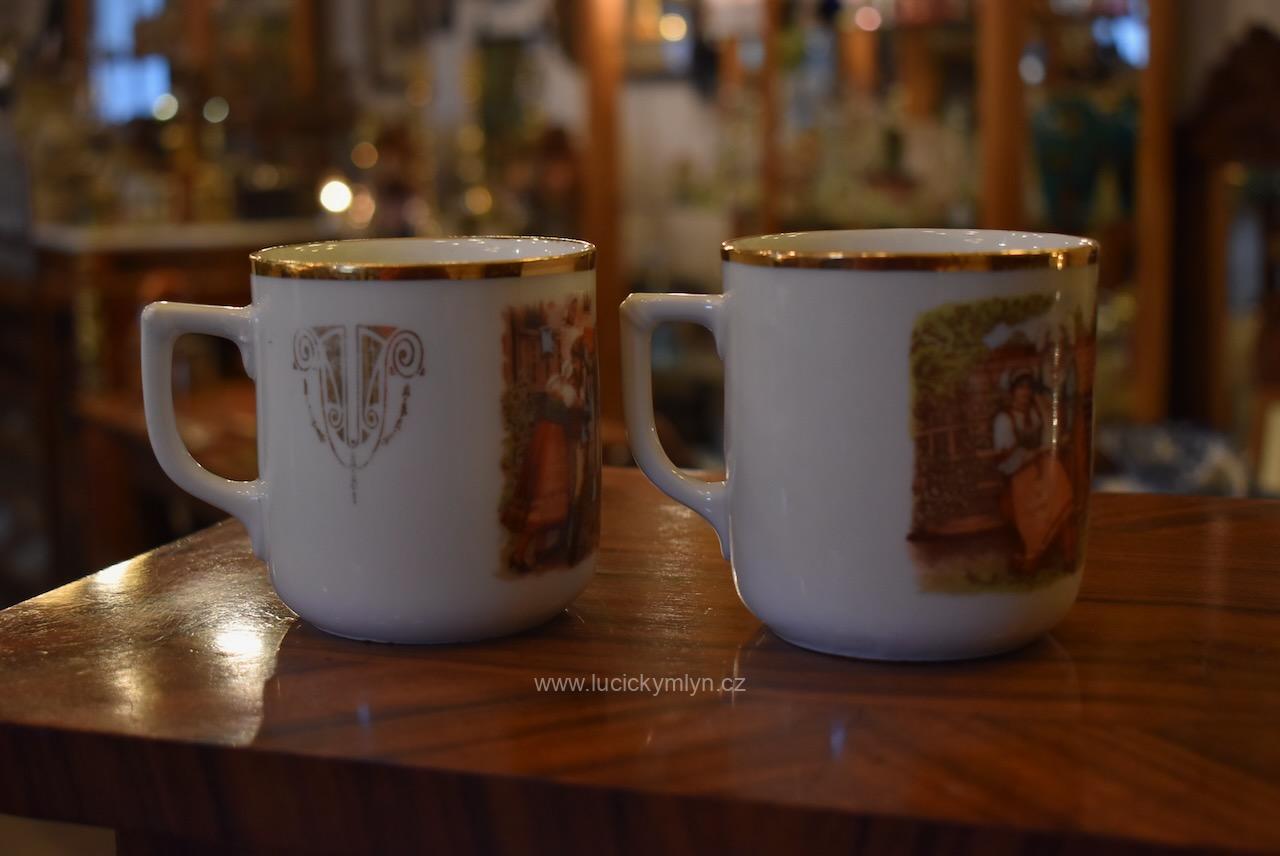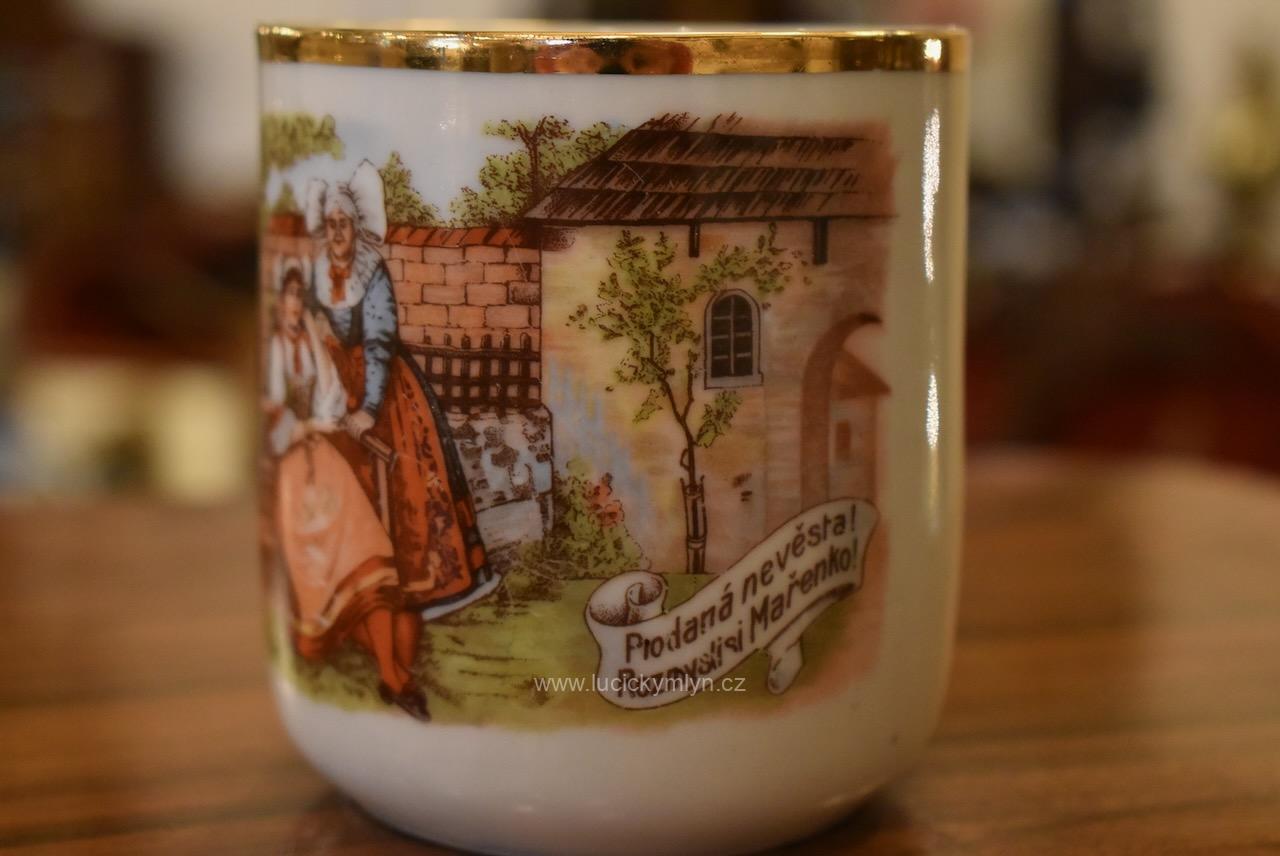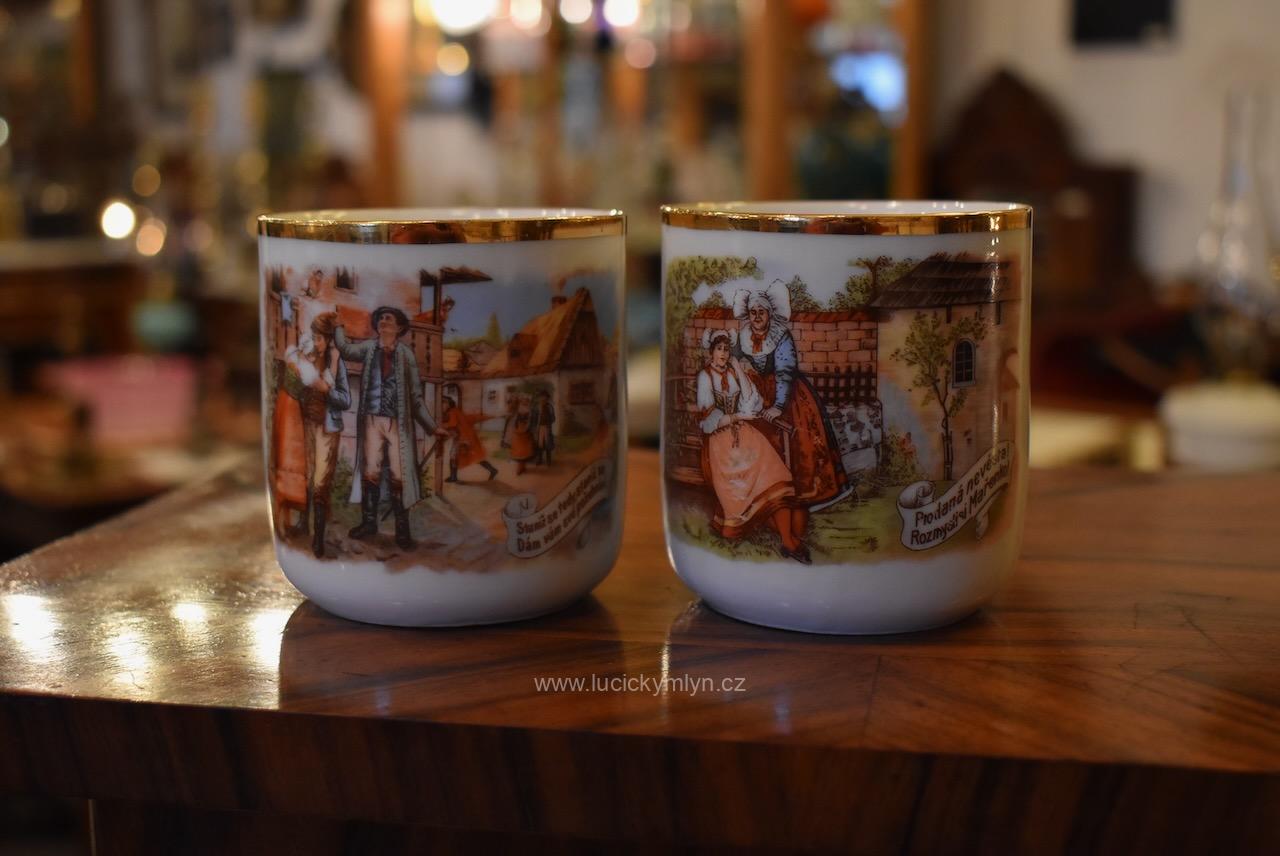 Starožitné porcelánové hrnečky s vyhledávaným malebným motivem oblíbených obrázků „Prodaná nevěsta“