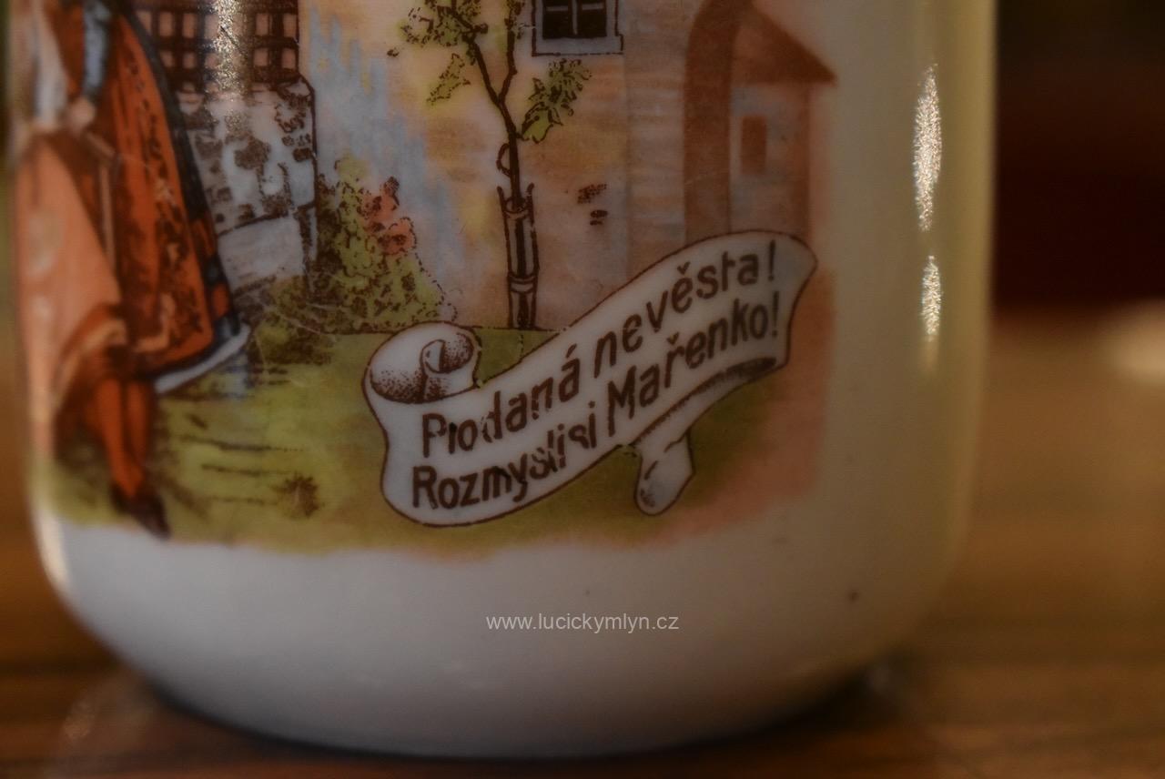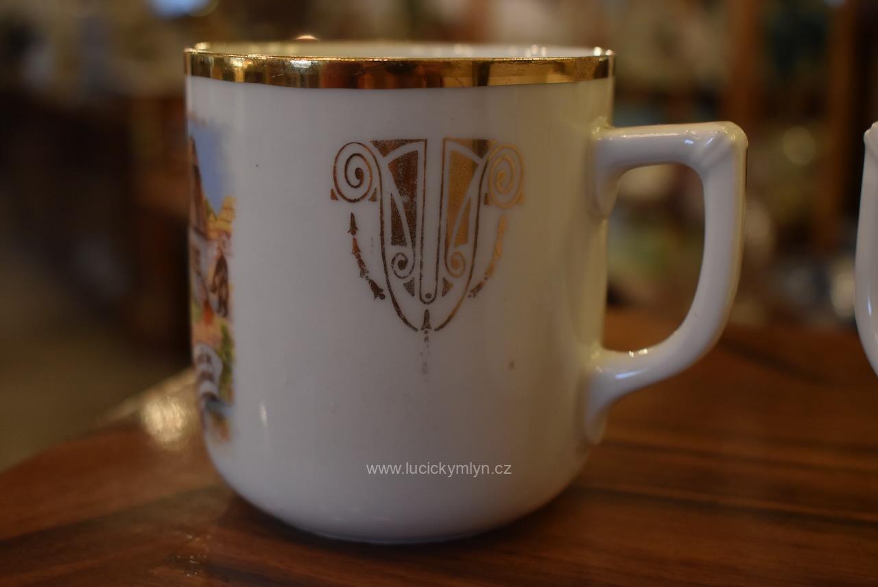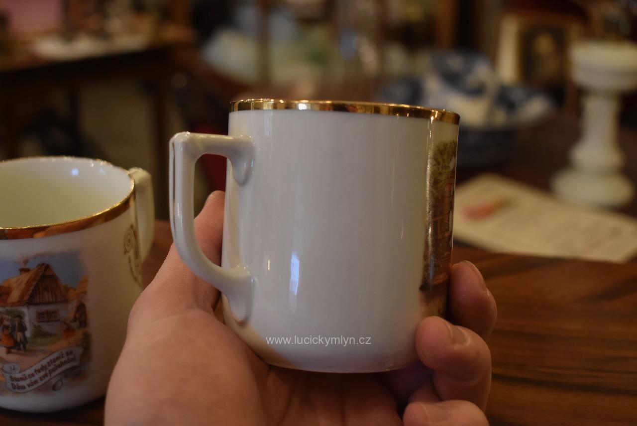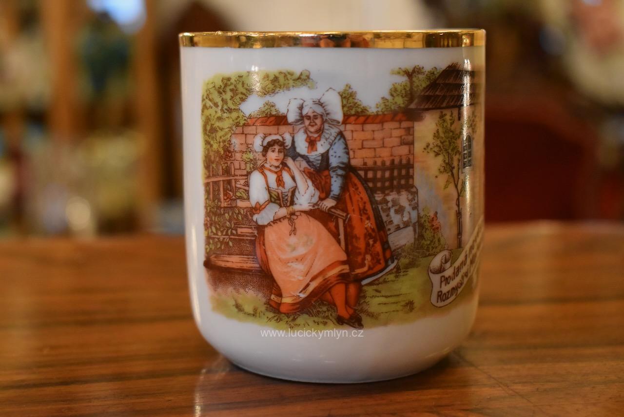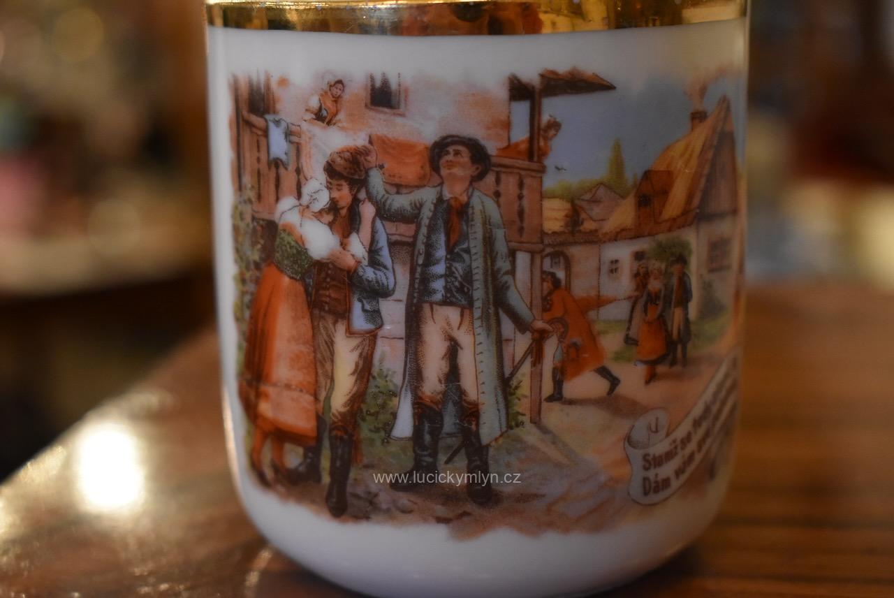 Starožitné porcelánové hrnečky s vyhledávaným malebným motivem oblíbených obrázků „Prodaná nevěsta“