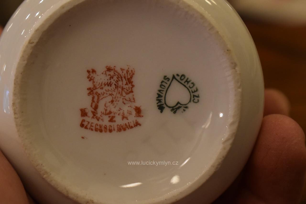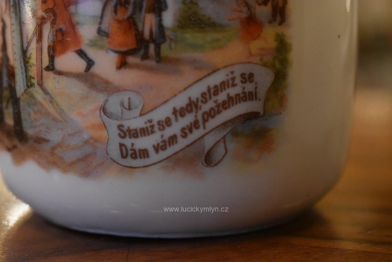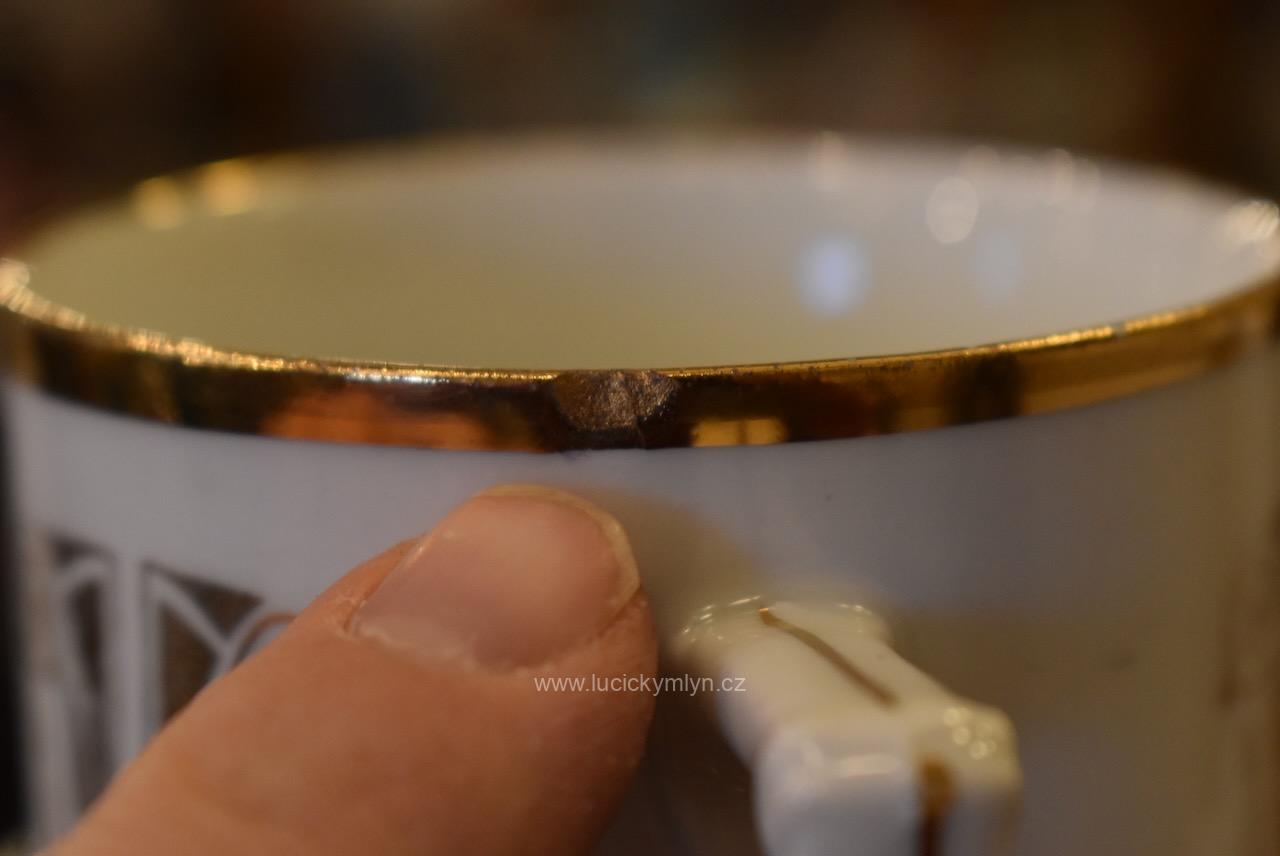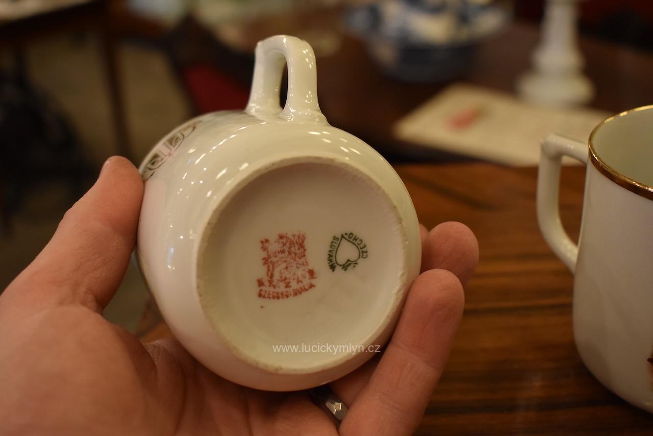 Starožitné porcelánové hrnečky s vyhledávaným malebným motivem oblíbených obrázků „Prodaná nevěsta“