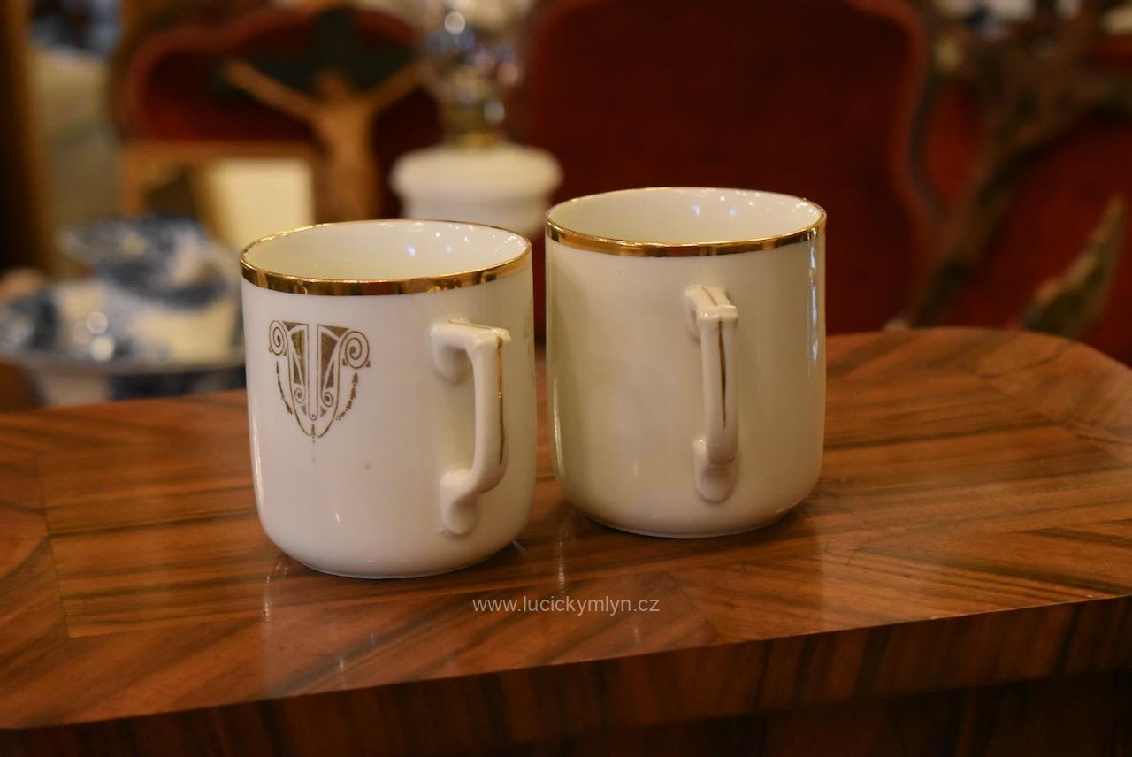 Secesní hrnečky byly vyrobeny počátkem 20. století. Tento motiv Prodané nevěsty výrobce zhotovil technikou barevného tisku. Jeden z hrnečků je na stranách blíže k oušku, působivě přizdoben jemně zlacenými rostlinnými ornamenty. Hrnečky mají též širokou zlatou linku na horním okraji. Sběratelský porcelán pochází z období vrcholné secese a byl vyroben okolo roku 1920. Hrnečky mají na pravé dolní straně obrázku, ozdobně psané, mluvené repliky doprovázející daný děj české národní opery. Starožitné hrnečky se zachovaly v původním dobrém stavu, až na jeden, dříve již zlatě zaretušovaný okrajový oťuk nad ouškem u hrnečku se secesními ornamenty. Jinak pouze minimální povrchové opotřebení viz. foto. Hrnečky jsou vhodné k doplnění tématické kolekce a mohou posloužit k dekoraci, nebo ke sběratelským účelům.