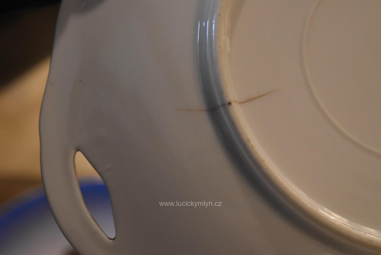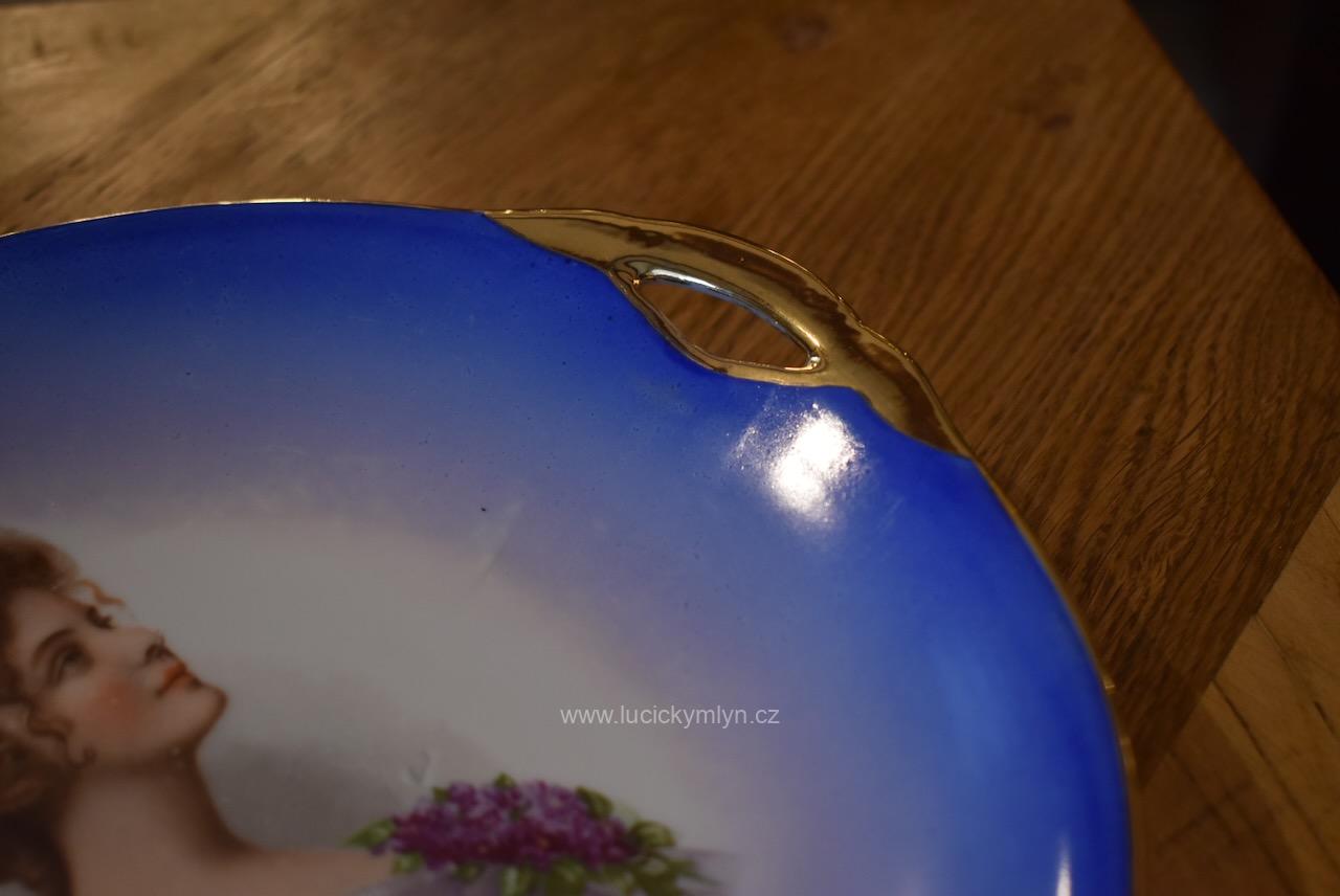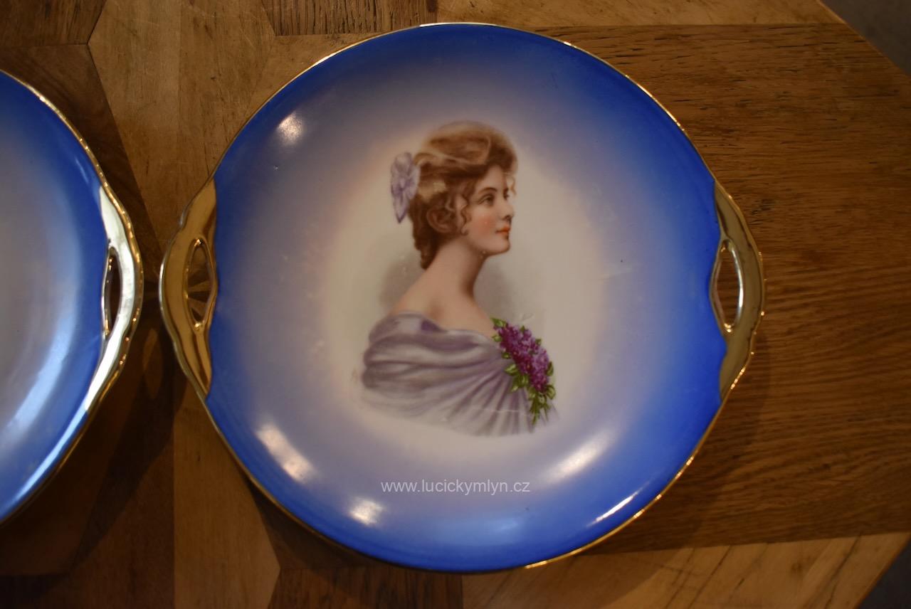 Dva dekorativní talíře z bílého porcelánu oživené modro-fialovým přechodovým podkladem, ozdobené dobovým, přeneseným barevným portrétem krásných a elegantních dam z vyšší společnosti a plasticky tvarovanými, bohatě zlacenými uchy. Typické „salonní“ závěsné talíře z období kolem roku 1900–1915, patrně středoevropská (německo‑česká) výroba; bez značky, v pěkném původním stavu, vhodné jako romantická nástěnná dekorace. Jeden z talířů má na zadní straně drobnou a nepodstatnou jednostrannou technologickou naprasklinku, jež pochází nejspíše ještě z výroby.