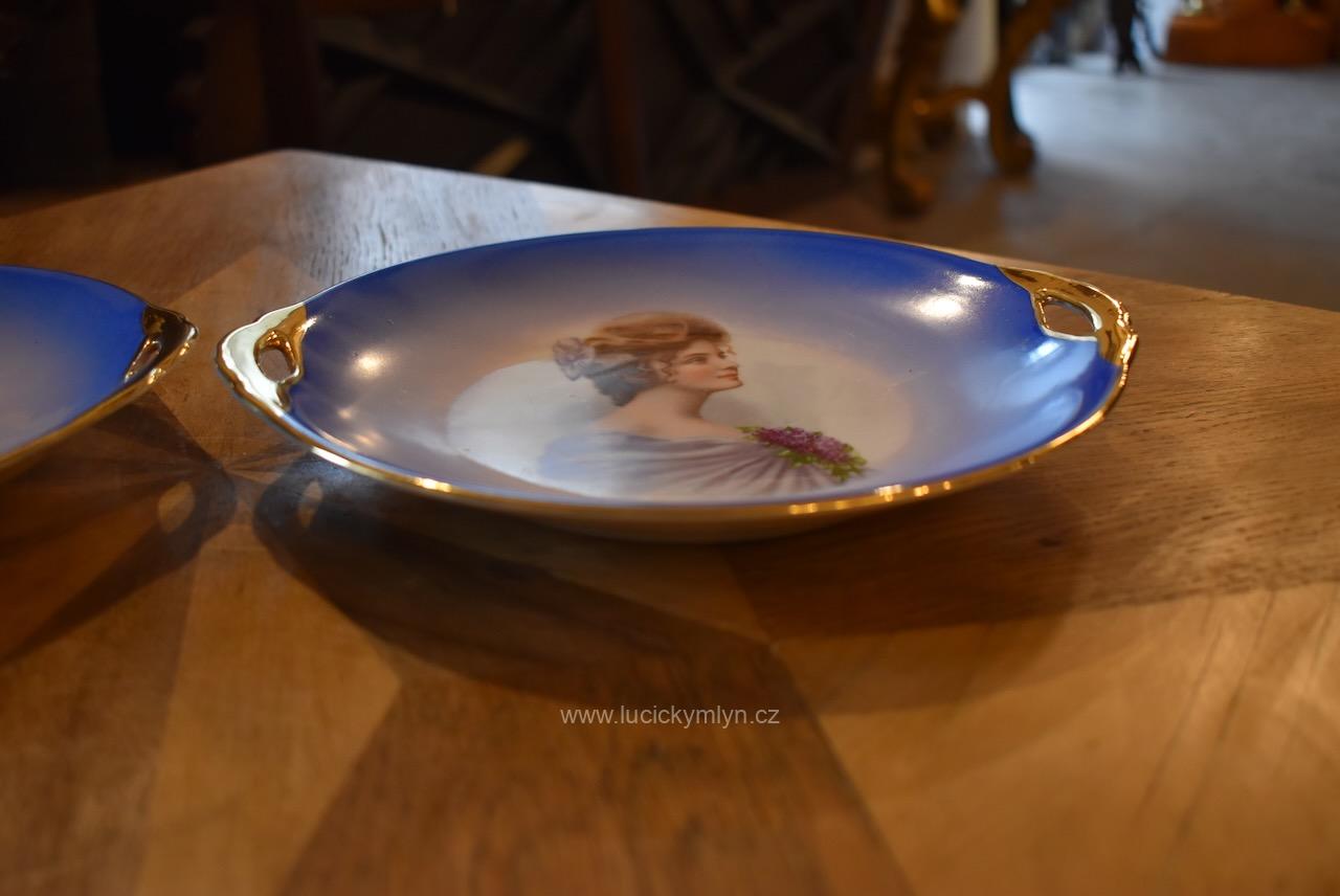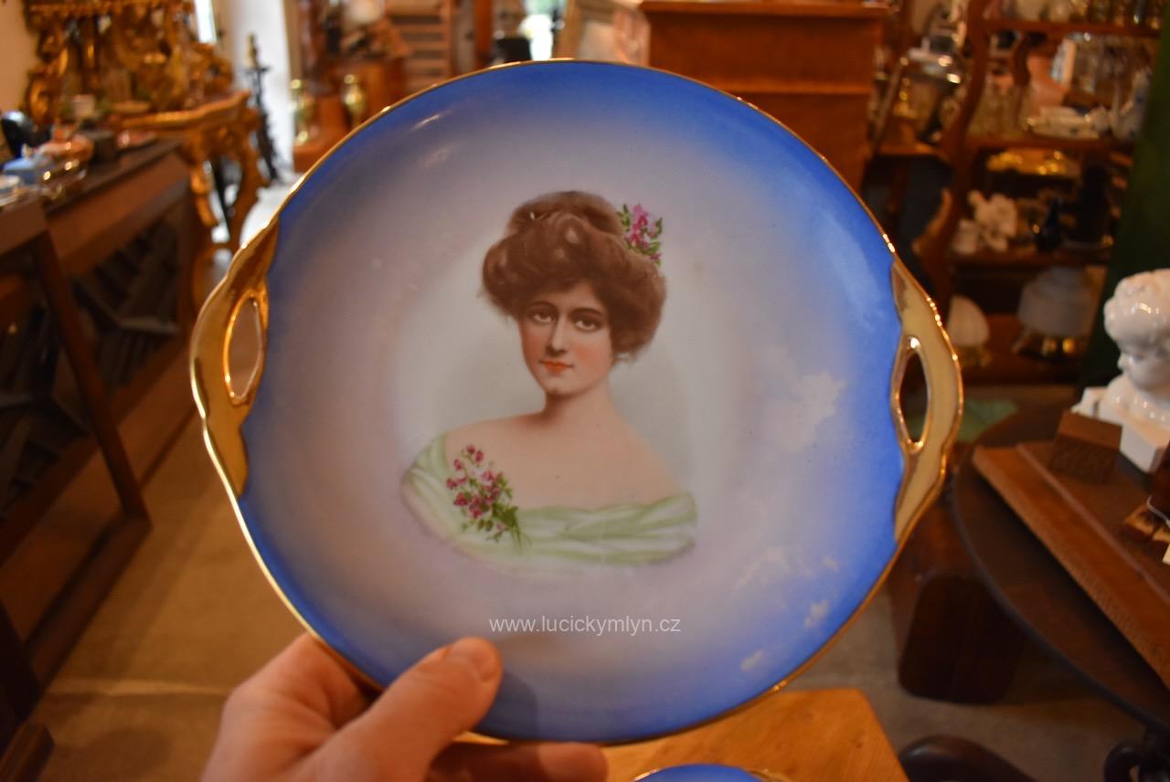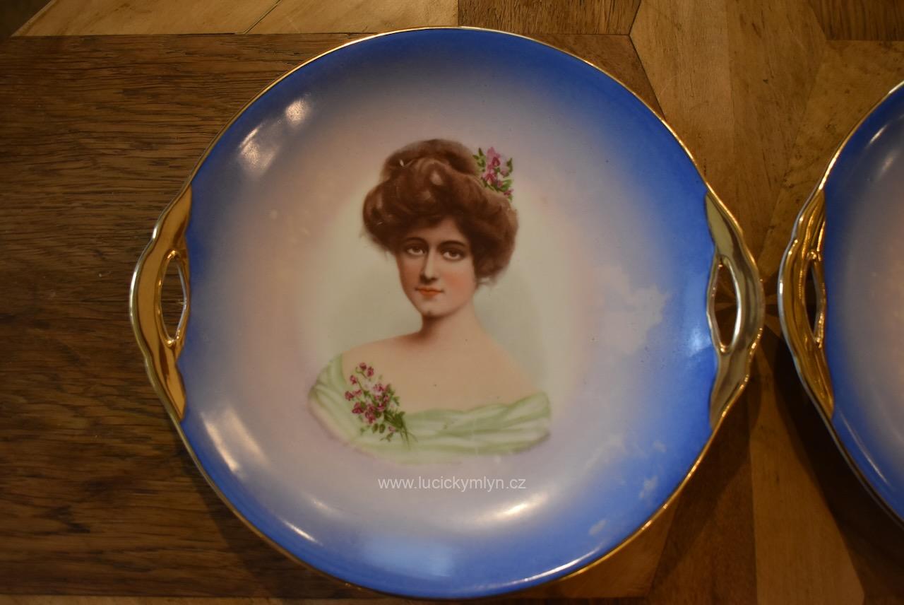 Starožitné secesní porcelánové talíře nejen pro sváteční servírování – měšťanský dekorativní porcelán působivě ozdobený kolorovanými portréty krásných dam i bohatým okrajovým zlacením s vykrojenými oušky