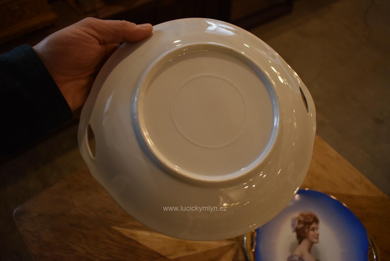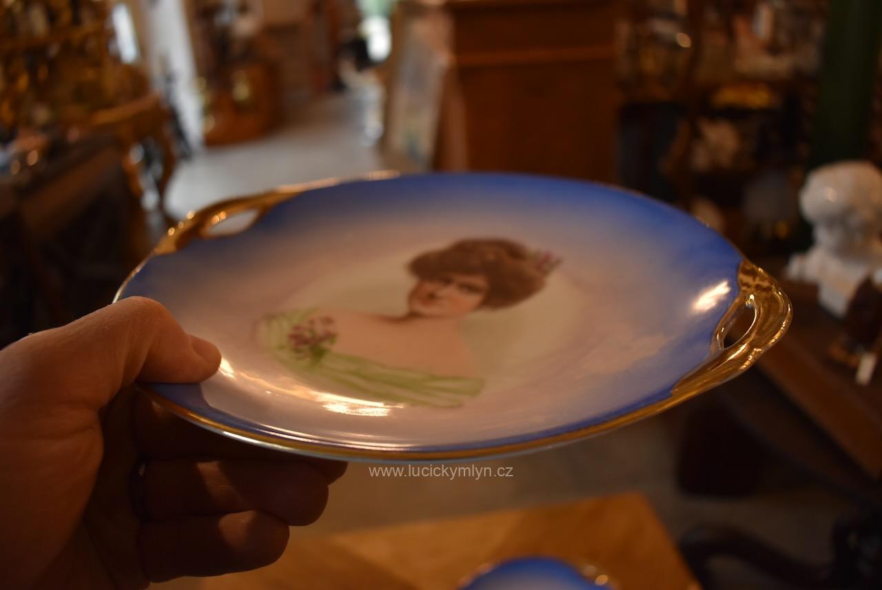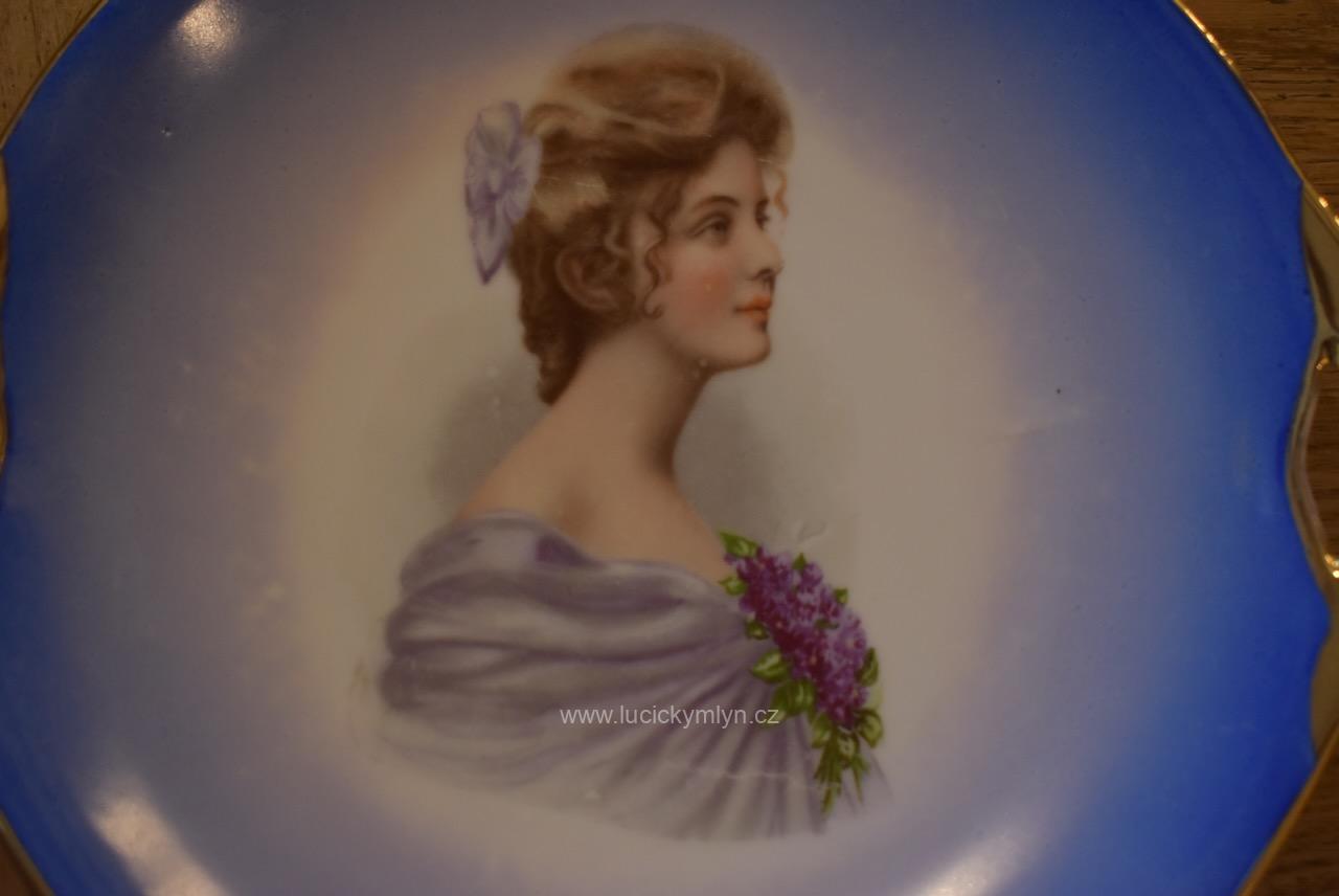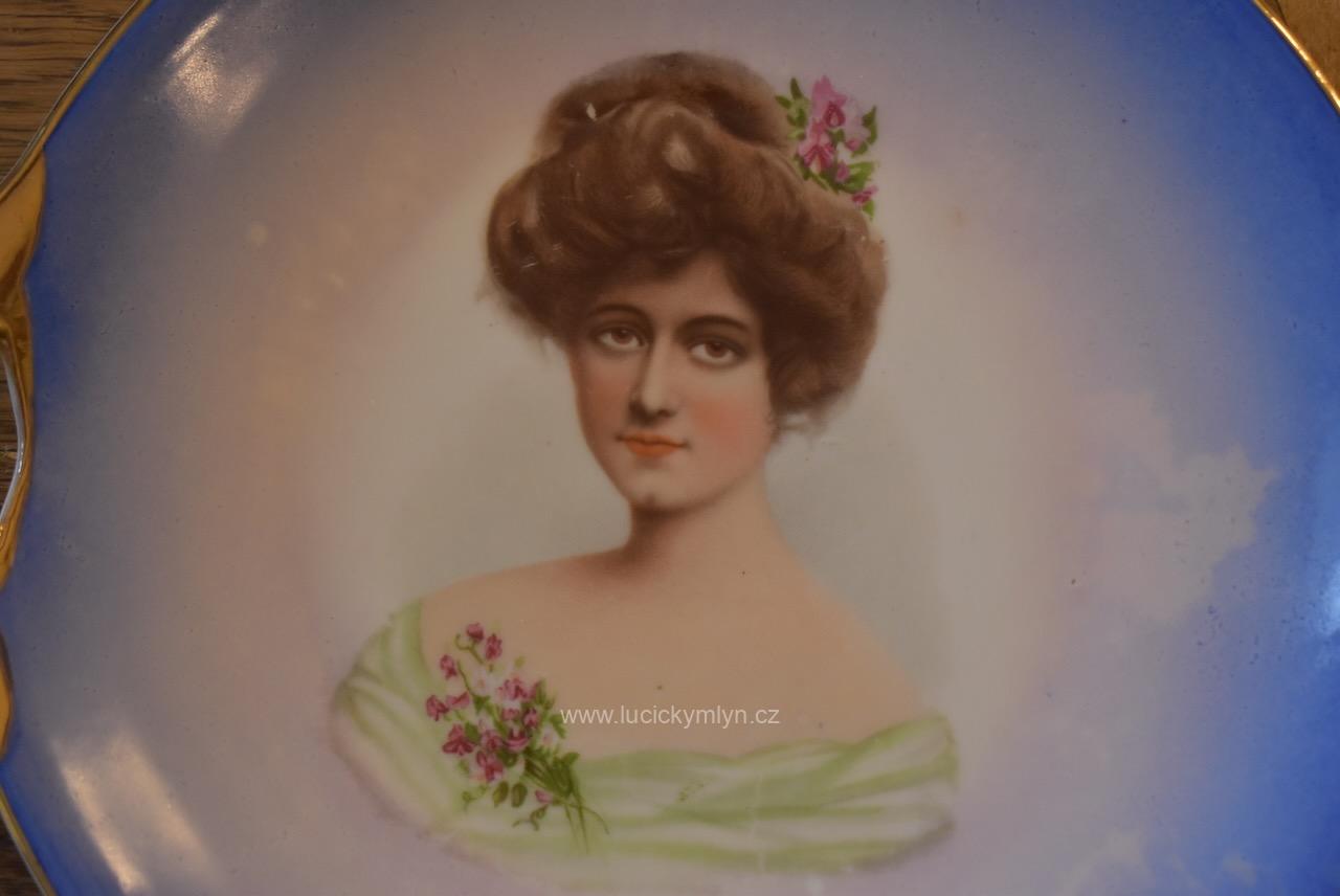 Starožitné secesní porcelánové talíře nejen pro sváteční servírování – měšťanský dekorativní porcelán působivě ozdobený kolorovanými portréty krásných dam i bohatým okrajovým zlacením s vykrojenými oušky