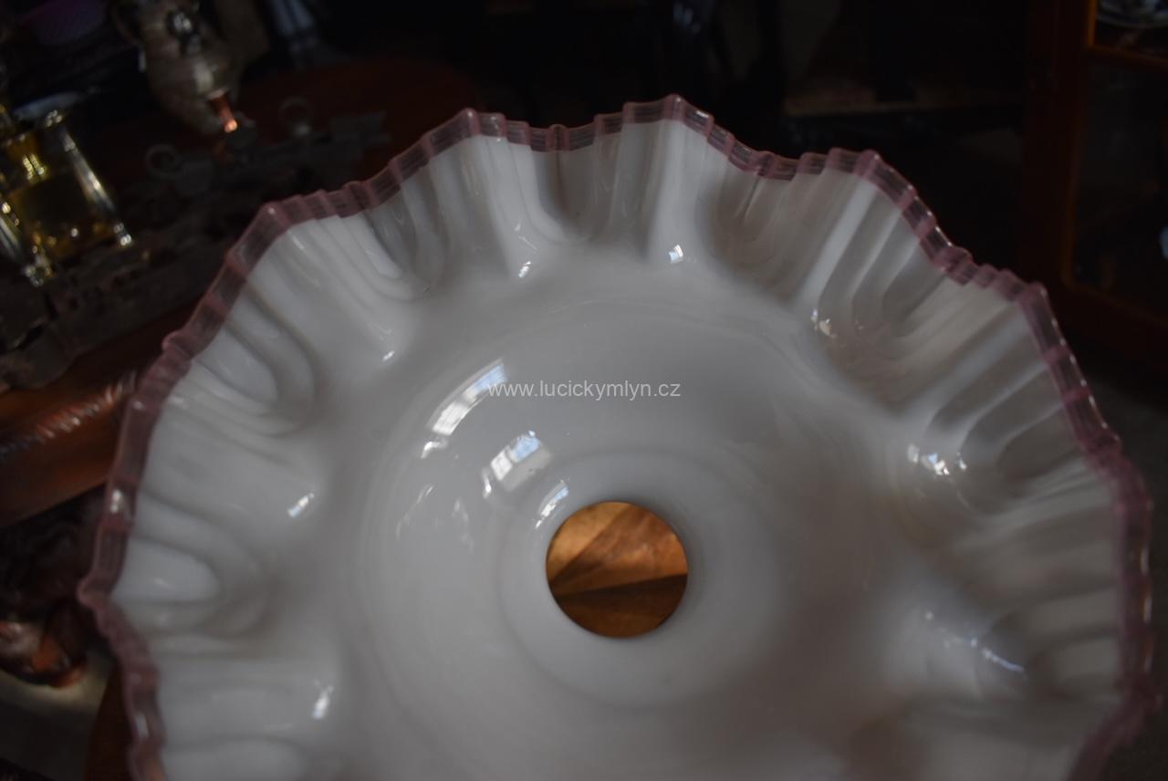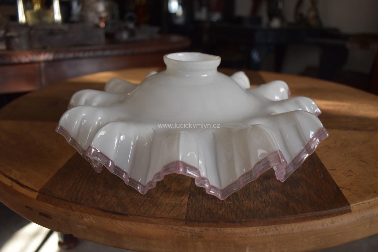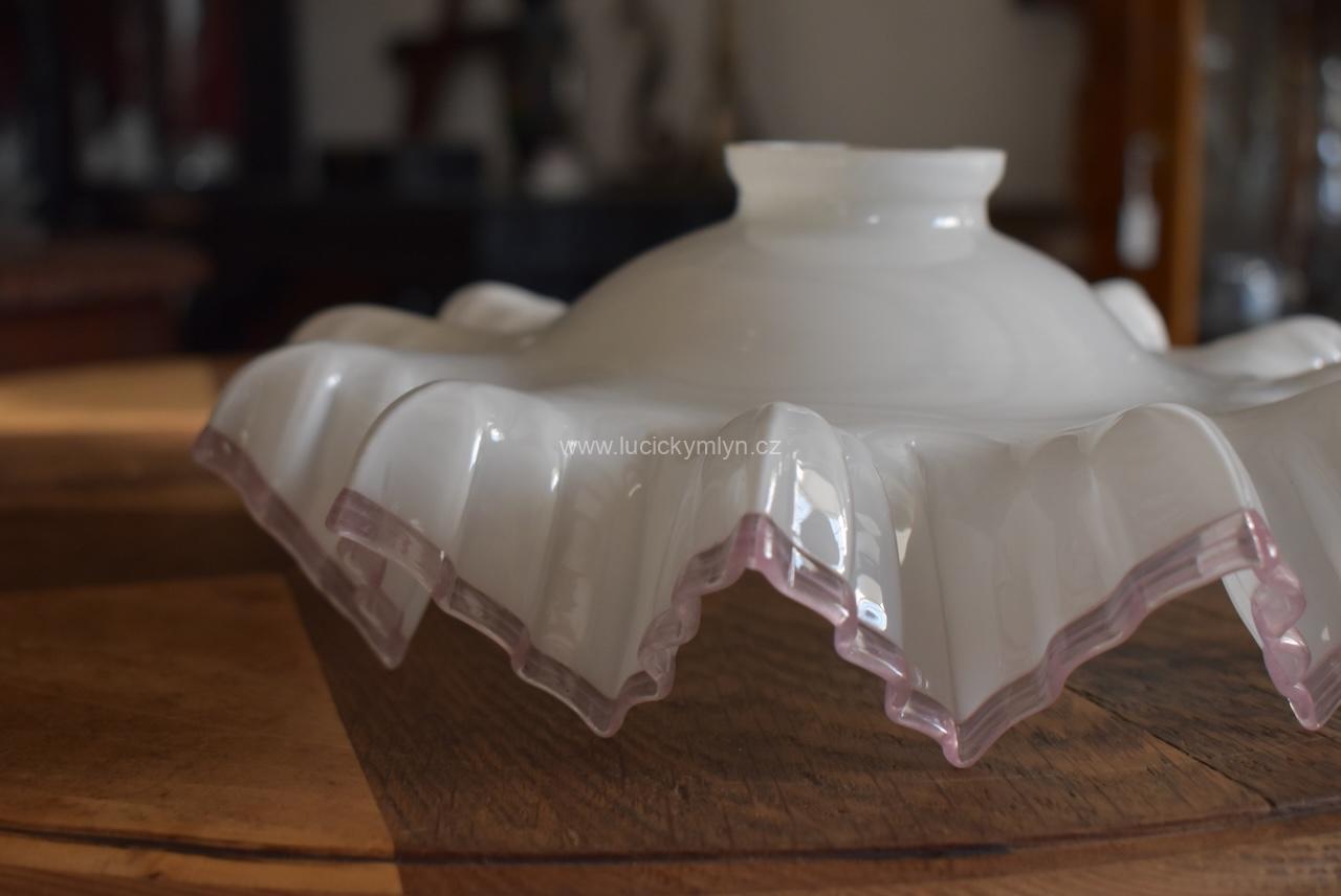 Toto stínidlo, starší než století, patří k nejpůsobivějším modelům z foukaného Horáckého skla. Jejich ruční výroba se orientovala nejprve na petrolejové lampy a s postupným zaváděním elektřiny i na stahovací světla, která vznikala již od roku 1890. Ručně řasený okraj s linkou se od první republiky postupně zjednodušoval. Naše stínidlo na stahovačku pochází ještě z období, kdy byla zdobnost a ruční výroba na svém vrcholu. Výjimečný model v krásně zachovalém a původním stavu.