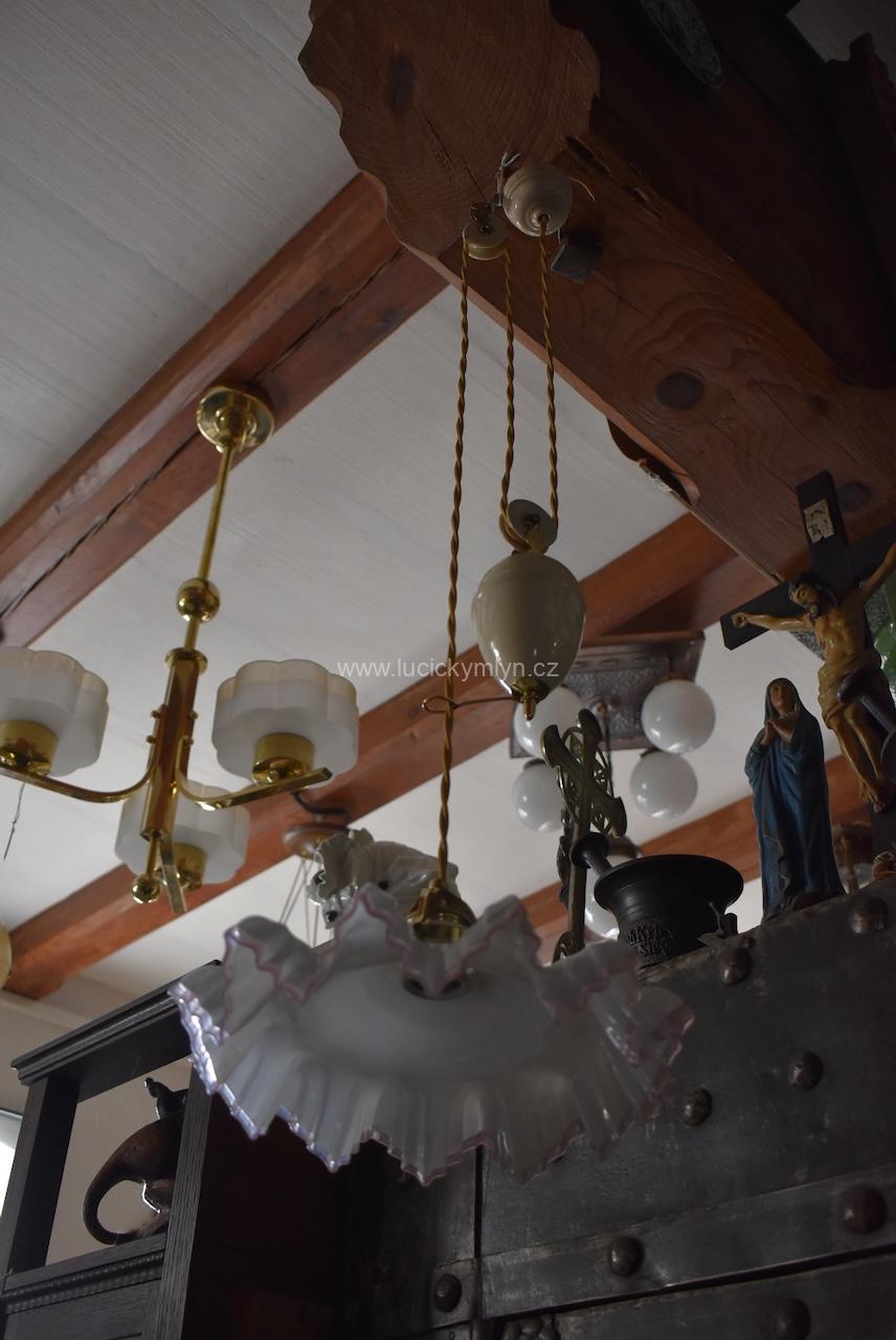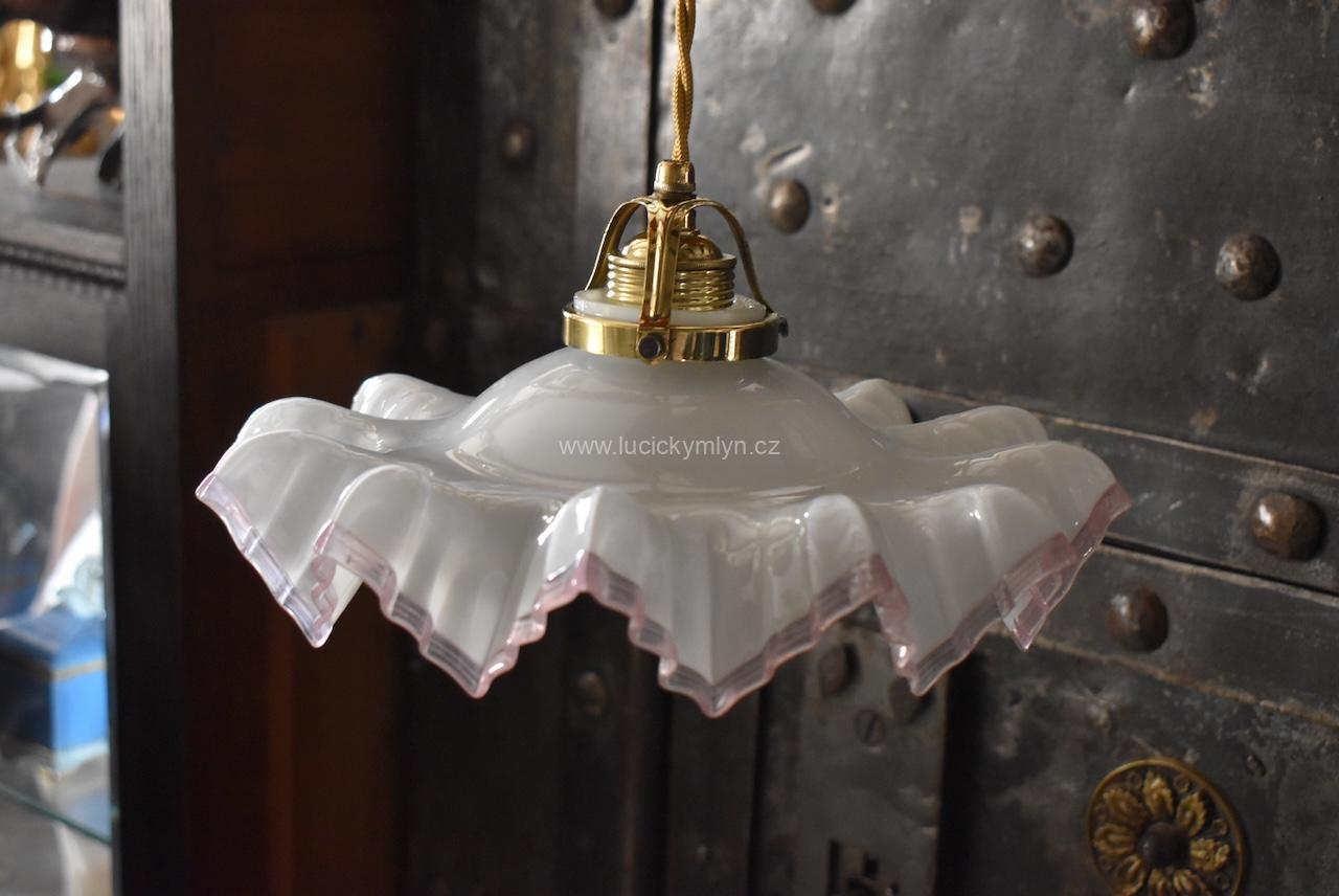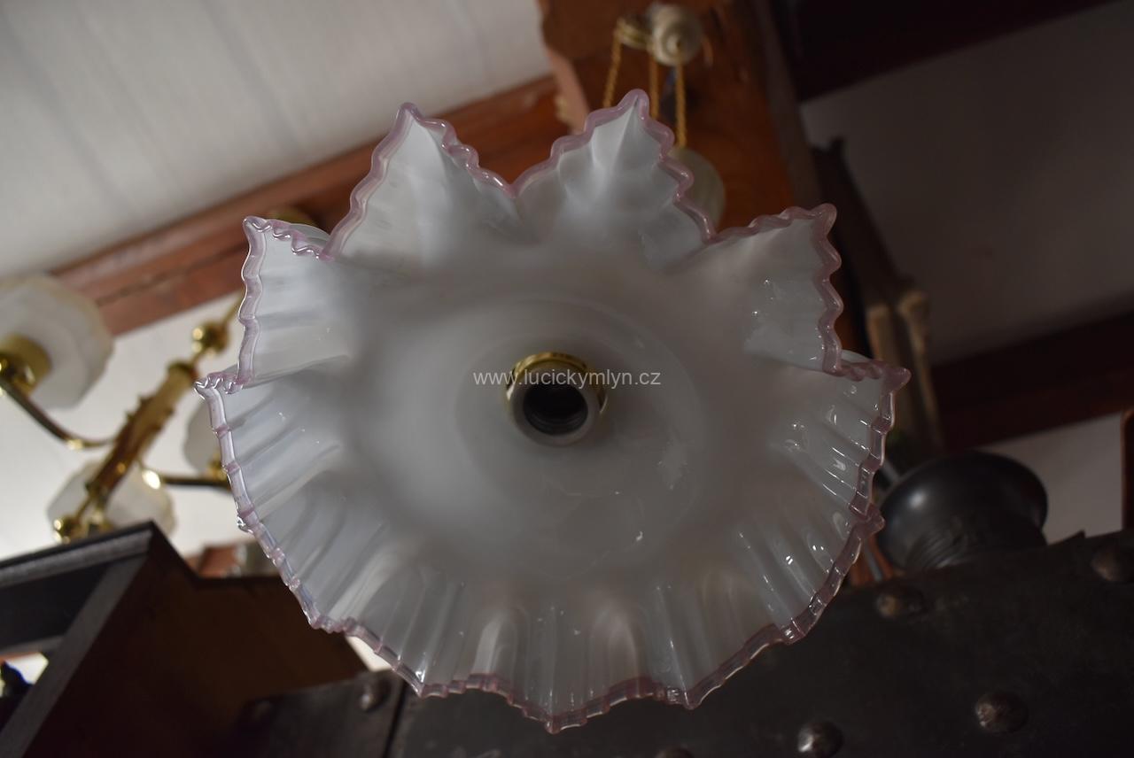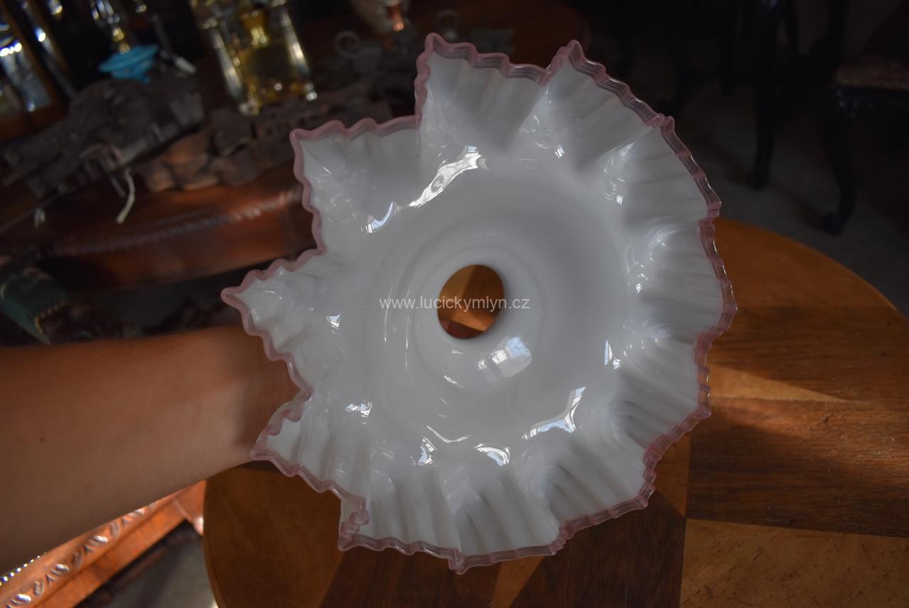 Toto stínidlo, starší než století, patří k nejpůsobivějším modelům z foukaného Horáckého skla. Jejich ruční výroba se orientovala nejprve na petrolejové lampy a s postupným zaváděním elektřiny i na stahovací světla, která vznikala již od roku 1890. Ručně řasený okraj s linkou se od první republiky postupně zjednodušoval. Naše stínidlo na stahovačku pochází ještě z období, kdy byla zdobnost a ruční výroba na svém vrcholu. Výjimečný model v krásně zachovalém a původním stavu.